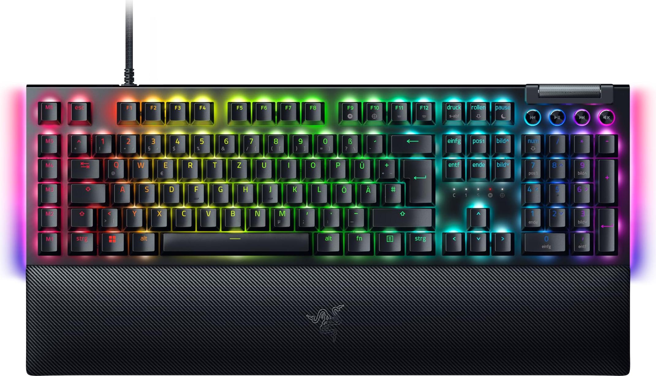 Zustand: Gebraucht - Gaming-Tastaturen Gaming-Tastaturen für PC - Razer - RZ03-04692100-R3G1 - EAN: 8887910072554 - Mechanische Razer Yellow Switches Für schnelles und lautloses Auslösen: Da sowohl der Auslöse- als auch der Rückschaltepunkt bei 1,2 mm liegt und nur 45 g Auslösekraft nötig sind, kannst du blitzschnell Befehle spammen, praktisch lautlos dank der integrierten Schalldämpfer. Unterbodenbeleuchtung an 2 Seiten und Einzeltastenbeleuchtung Powered by Razer Chroma RGB: Die Einzeltastenbeleuchtung und die faszinierende Unterbodenbeleuchtung lassen die Tastatur aus noch mehr Blickwinkeln erstrahlen, perfekt synchronisiert mit deiner Battle Station, damit du bei Hunderten unterstützten Spielen noch mehr Immersion erleben kannst. 6 eigene Makro-Tasten Individuell anpassbare Kontrolle, immer alles im Griff: Ob du nun deine Ults einsetzen oder deine Skill-Rotation optimieren willst, bau dein Arsenal an Befehlen mit leicht zugänglichen Makro-Tasten aus, die du passend zu deinem Spielstil programmieren kannst. Weich gepolsterte magnetische Handballenauflage aus Kunstleder Für noch mehr Gaming-Komfort: Dank einer weich gepolsterten Handballenauflage, die sicher an der Tastatur einrastet, genießt du selbst bei den intensivsten Gaming-Marathons stundenlangen Komfort. Doubleshot-ABS-Tastenkappen Für noch mehr Langlebigkeit: Dank eines Doubleshot-Gussverfahrens kann sich die Beschriftung niemals abnutzen und die Tastenkappen haben extra dicke Seiten, wodurch sie extrem robust ... ![]() ![]() Razer BlackWidow V4 Mechanische Gaming-Tastatur mit Razer Chroma RGB RZ03-04692100-R3G1