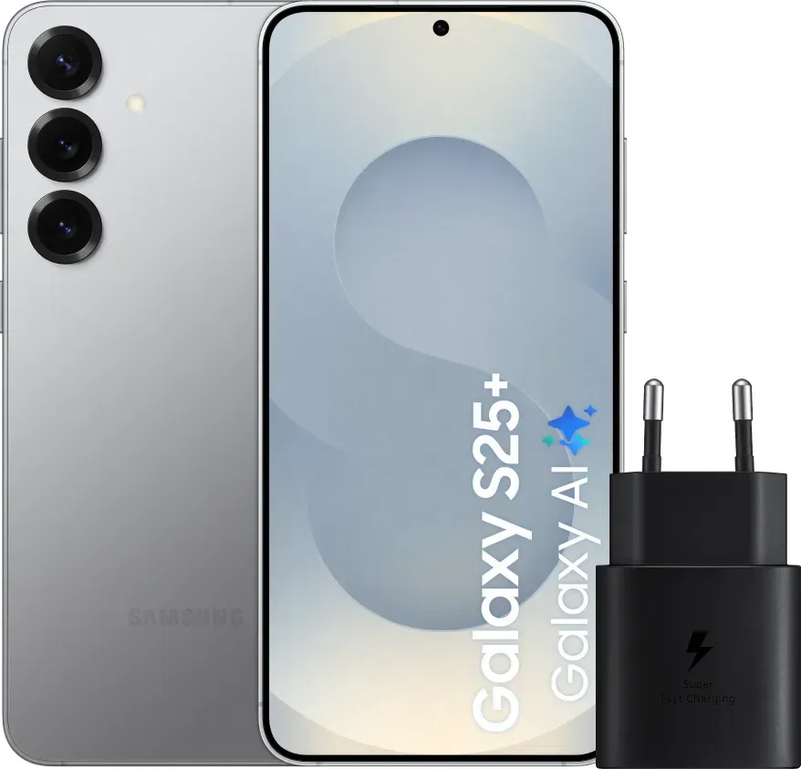 Kategorie: Handys ohne Vertrag - Samsung - GTIN:8806095857701 - Das Samsung Galaxy S25 Plus 256 GB Silber 5G ist ein erstklassiges Smartphone mit gestochen scharfem Display. Auf dem 6,7 Zoll großen Quad-HD-Display siehst du dir Serien auf Netflix in der höchsten Qualität an. Mit dem integrierten Galaxy AI Assistenten bearbeitest du Fotos oder erstellst ganz einfach eine Zusammenfassung deiner Notizen oder einer Webseite. Das Samsung S25 Plus ist mit einem großen 4.900-mAh-Akku ausgestattet, der bei durchschnittlicher Nutzung einen ganzen Tag lang hält. Innerhalb einer halben Stunde ist der Akku mit einem separat erhältlichen 45-Watt-Schnellladegerät bereits wieder zu 60 Prozent aufgeladen. Mit dem Samsung S25 Plus führst du die anspruchsvollsten Aufgaben aus. Beispielsweise spielst du darauf 3D-Spiele oder bearbeitest Fotos und Videos. Das S25 Plus verfügt über drei Kameras, mit denen du gestochen scharfe Fotos aufnimmst. Dank des Teleobjektivs zoomst du sogar bis zu dreifach ohne Qualitätsverlust heran. Der große 256-GB-Speicher bietet genug Platz für deine Fotos, Apps und andere Dateien. Lädst du gerne viele Apps und Serien herunter? Dann entscheide dich für die 512-GB-Variante des S25 Plus. - 889,00 Euro bei coolblue - gefunden von billiger.de ![]() ![]() Samsung Galaxy S25 Plus 256GB Silber 5G + Samsung Ladegerät 25 Watt Schwarz