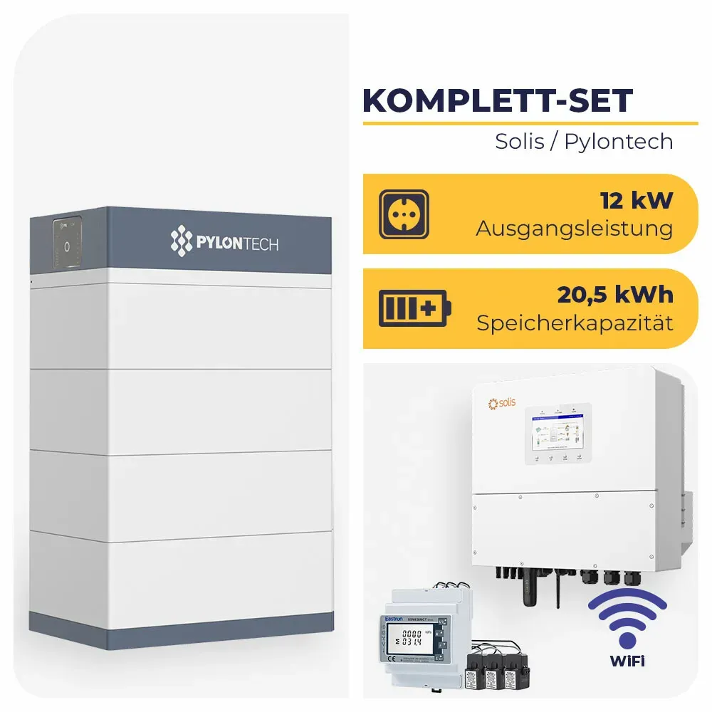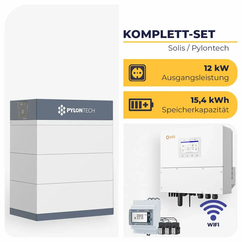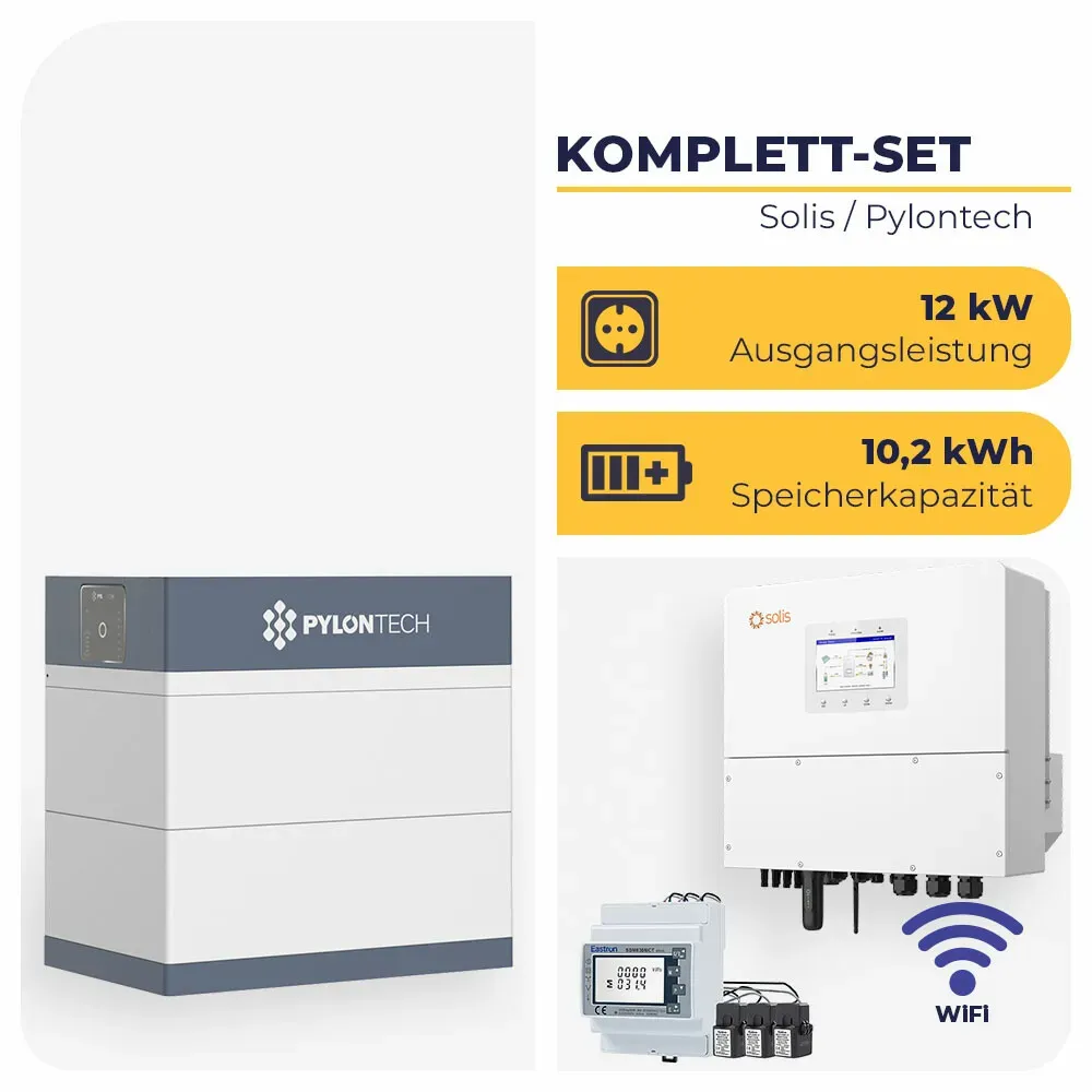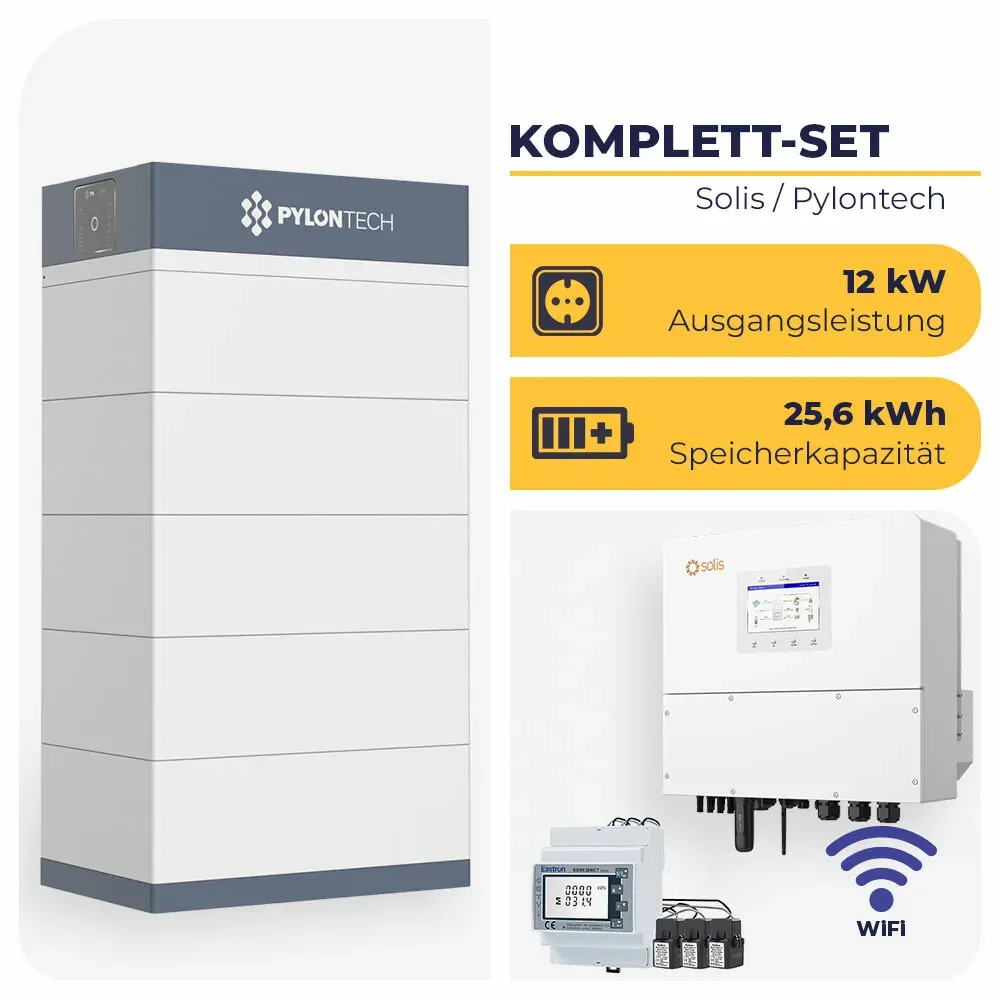 Kategorie: Stromspeicher - Solis - 3-phasiges PV-Speicher-Komplettsystem mit Hochvolt-LiFePO4 Solis S6-EH3P12K-H Hybrid-Wechselrichter 12 kW mit 20,5 kWh Pylontech Force H3 ist ein Komplettsystem für die effiziente Eigenverbrauchsoptimierung und Notstromversorgung. Das Set kombiniert einen dreiphasigen Hybrid-Wechselrichter mit Hochvolt-Lithiumspeicher und ist für netzparallelen und netzunabhängigen Betrieb ausgelegt. Du kannst das System flexibel erweitern und für Wohngebäude, Gewerbe oder kleine Betriebe einsetzen. Die Lösung eignet sich für Neuinstallationen und Nachrüstungen mit Fokus auf hohe PV-Einspeisung, Eigenverbrauch, Backup und smarte Steuerung. Auf einen Blick PV-Leistung Bis 19,2 kW PV-Eingang, 4 MPPT, 3-phasig Notstrom/USV Umschaltung 8.000 Hersteller- 1 Hersteller Pylontech Lieferumfang Solis S6-EH3P12K-H Hybrid-Wechselrichter 12 kW mit 20,5 kWh Pylontech Force H3 1x Solis S6-EH3P12K-H Hybrid-Wechselrichter 12 kW mit 20,5 kWh Pylontech Force H3 1x Solis S6-EH3P12K-H Hybrid-Wechselrichter 1x Wandhalterung 4x PV-Stecker (MC4) 1x AC-Netzanschluss 1x AC-Backup-Anschluss 1x Batteriekabelsatz (1 m, 8 mm2) 1x CAN-Kabel (3 m) 1x WiFi-Stick 1x Bluetooth-Antenne 1x Staubschutzhülle für COM-Port 1x Benutzerhandbuch 1x Pylontech Force H3 Hochvolt-Batteriespeicher (20,5 kWh, 4 Module) 1x FC1000 Battery Controller 4x FH10050 LiFePO4-Batteriemodul 1x Force-H3 Basement (Batteriebasis) 2x 3 m externe Kommunikationskabel (RJ45) 1x 1,5 m internes Kommunikationskabel (RJ45) ... ![]() ![]() Solis S6-EH3P12K-H Hybrid-Wechselrichter 12 kW mit 25,6 kWh Pylontech Force H3