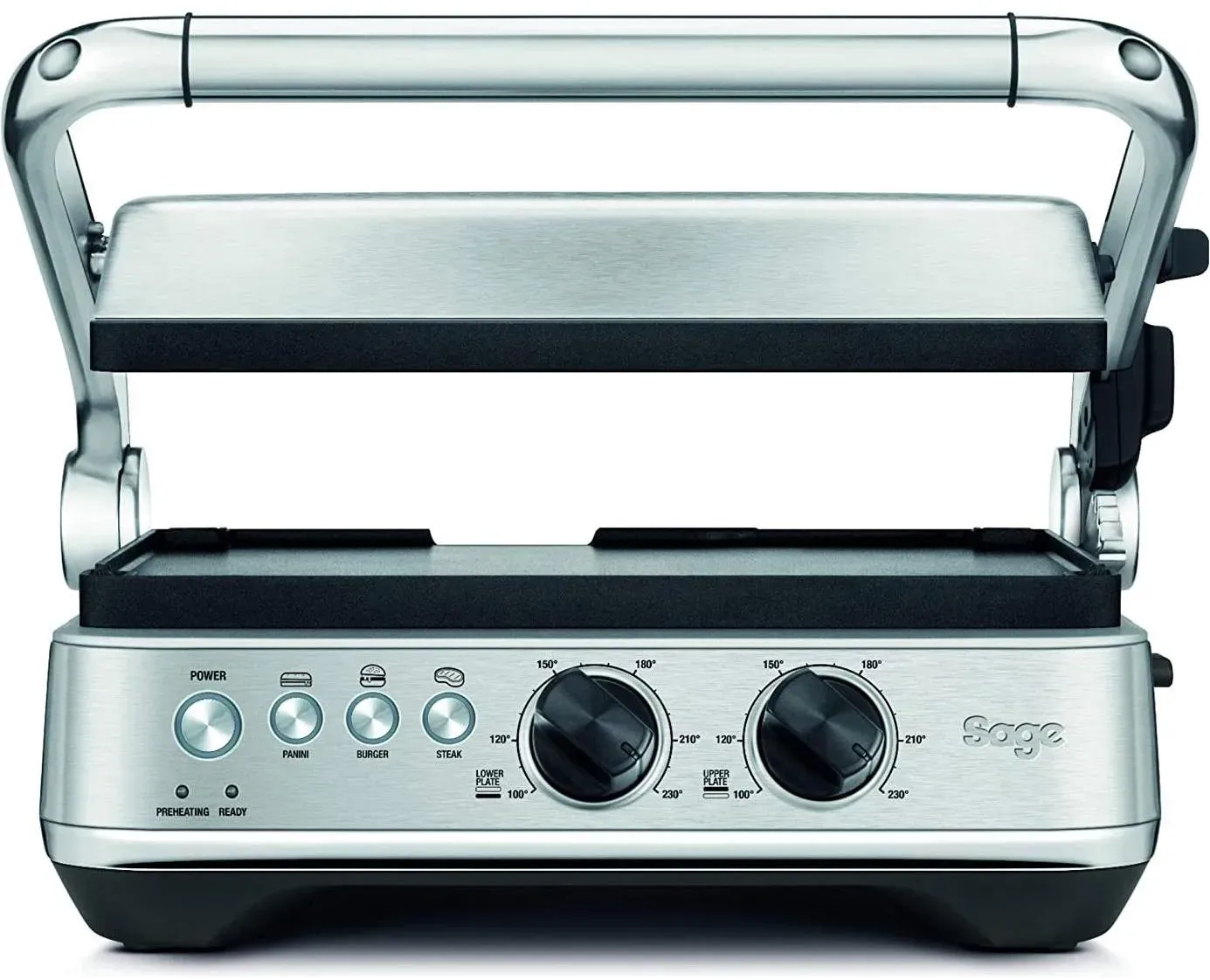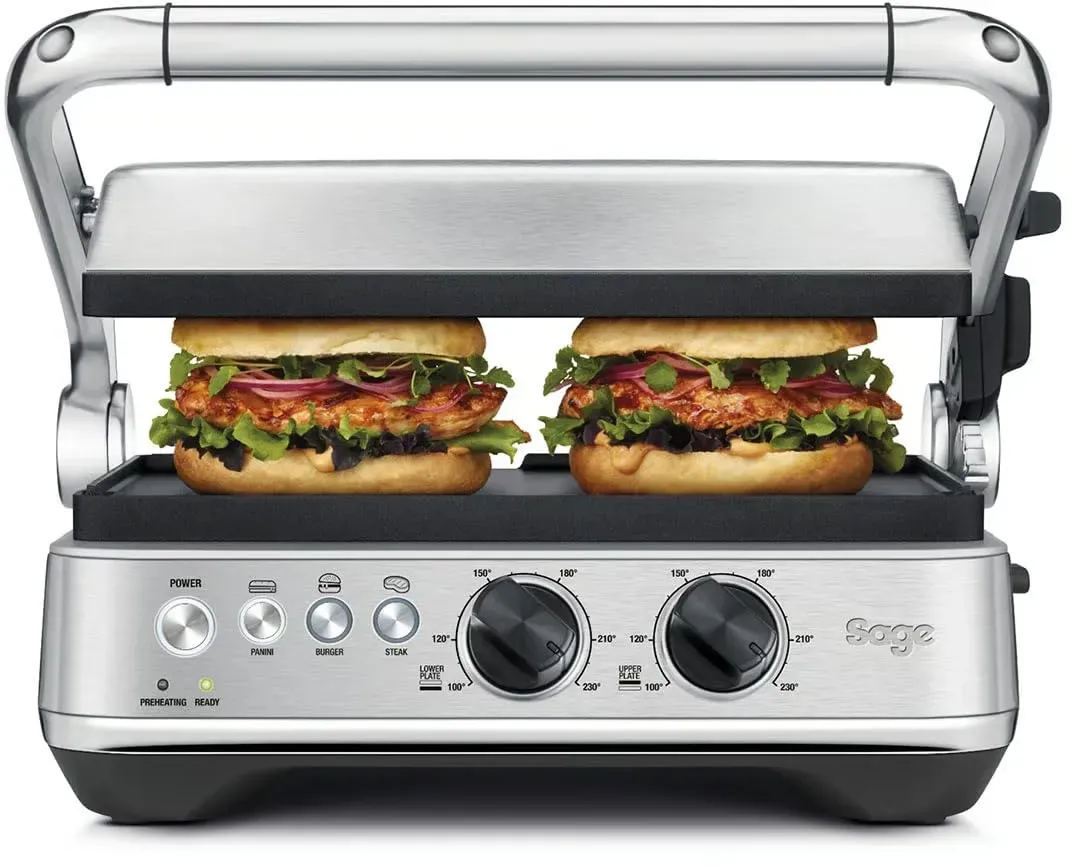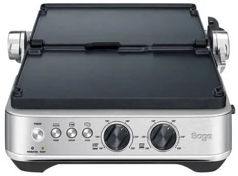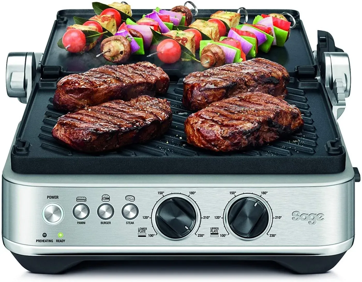 Zustand: Neu - Elektrische Tischgrills - Sage BRG Appliances - SGR700BSS4EEU1 - EAN: 9312432033466 - Voreinstellungen mit nur einem Tastendruck: Mühelose Zubereitung mit vorprogrammierten Einstellungen für Panini, Burger und Steak Offener flacher BBQ-Modus: Öffnen Sie den Grill vollständig, um eine größere geriffelte Grillfläche für vielseitiges Grillen zu erhalten - von Steaks bis zu Pfannkuchen ist alles möglich Unabhängige Temperaturregelung: Passen Sie die Temperatur jeder elektrischen Grillplatte für verschiedene Grilkombinationen an Wendbare Platten: Keramische Grill- und Griddleplatten für alles von Bacon bis Waffeln. Die PTFE- und PFOA-freien Keramikplatten mit glatter und geriffelter Oberfläche lassen sich leicht reinigen - per Hand oder in der Spülmaschine Kompatibel mit Waffelplatten: Erweitern Sie Ihren Elektrogrill mit antihaftbeschichteten Waffelplatten aus Keramik für einfaches, entspanntes Backen - Verkäufer: Pattern EU im amazon.de Marketplace ![]() ![]() Sage the BBQ und Press