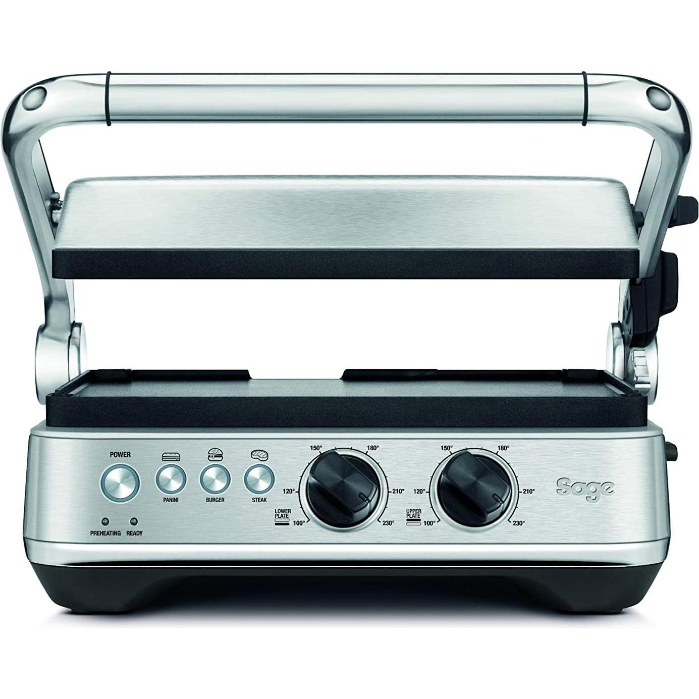Auf Lager Versand durch AmazonSage - The BBQ & Press Grill - Tischgrill - 3 Voreinstellungen für Panini, Burger und Steaks - Verlängerungsmöglichkeit, Wendbare Keramikplatten, Einfache Reinigung - Gebürsteter Edelstahl