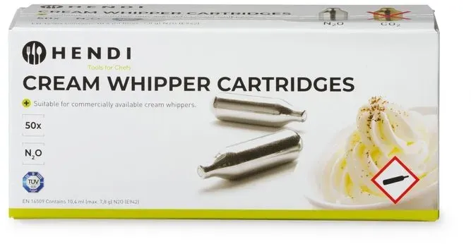 EAN: 4251354406024 - 8g N2O-Patronen zum Aufschäumen von Sahne, Desserts, Cremes, Saucen etc. Passend für alle in Deutschland üblichen Sahäte (Liss, iSi, Kayser etc.) (z.B. iSi Gourmet Whip, iSi Easy Whip, Liss Professional u.a.) Lieferumfang: 50 x Sahnekapseln N2O 8G8g SahnekapselnWiederverwertbarer Stahl (100%)aus 100% recycletem StahlPassend für alle Sahnespender (Cream Whipper, Mousse Siphon, Cream Dispenser) for example Mosa, iSi, Hendi, Liss, Best Whip etc Sahnekapseln sind nicht wiederbefüllbar. Sahnekapseln sind nur zur Vorbereitung der Schlagsahne im Sahnespender geeignet. Maximal aufzuschäumende Menge pro Kapsel: 0.5L. Bediennungsanleitung des zugehörigen Geräts beachten. Ungeeignet und nicht zugelassen für andere Geräte und Zwecke. Missbräuchliche Verwendung kann Ihre Gesundheit gefährden. Gegen direkte Sonneneinstrahlung schützen. Kapseln stehen unter Druck, vor Erwärmung über 50 C schützen. Kühl und trocken lagern. Auch nach Gebrauch nicht durchstoßen oder verbrennen. - bei kaufland.de - aus Yadore Produktdaten HENDI Sahnekapseln im 50er-Pack bieten eine gute Balance zwischen Menge und Preis für regelmäßige Anwender. ![]() ![]() HENDI Sahnekapseln, Stückzahl: 50