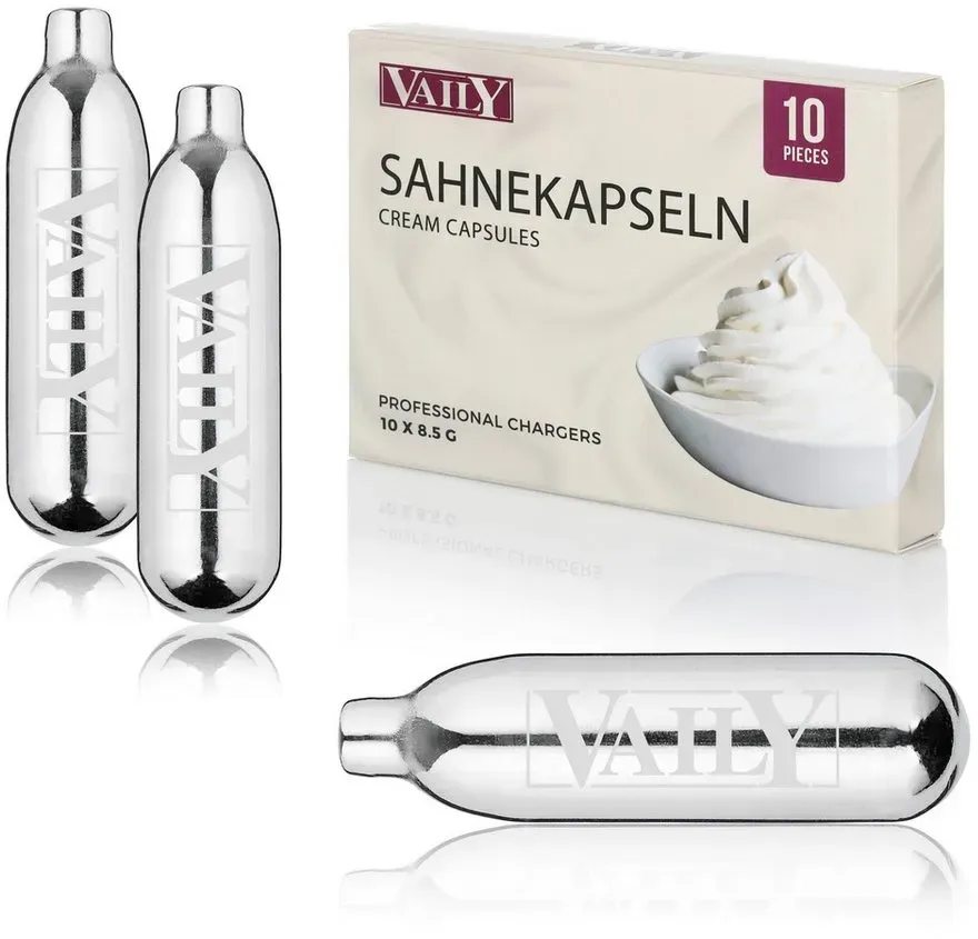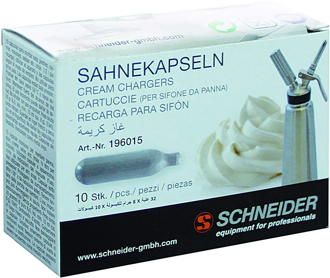 0.70 /1Stk - Kategorie: Sonstige Küchenhelfer - Vaily - GTIN:0618455301308 - Allgemein Zubehör passend für , Sahnebereiter und Sahnesyphons, Anzahl Teile , 10 St., Technische Daten Ergiebigkeit , 500 l, Product Compliance Gefahrenhinweise , H270 H280 H336, Produktdetails Einsatzbereich , Sahnebereiter Sahnesyphon, Hinweise Sicherheitshinweise , P101 P102 P220 P370+P376 P410+P403 P501, Signalwort , GEFAHR, - 6,99 Euro bei OTTO - gefunden von billiger.de Schneider bietet hier ein kleines Paket mit 10 Sahnekapseln, ideal zum Ausprobieren oder für den seltenen Einsatz. ![]() ![]() Schneider 10 Sahnekapseln für Sahnebläser 196000
