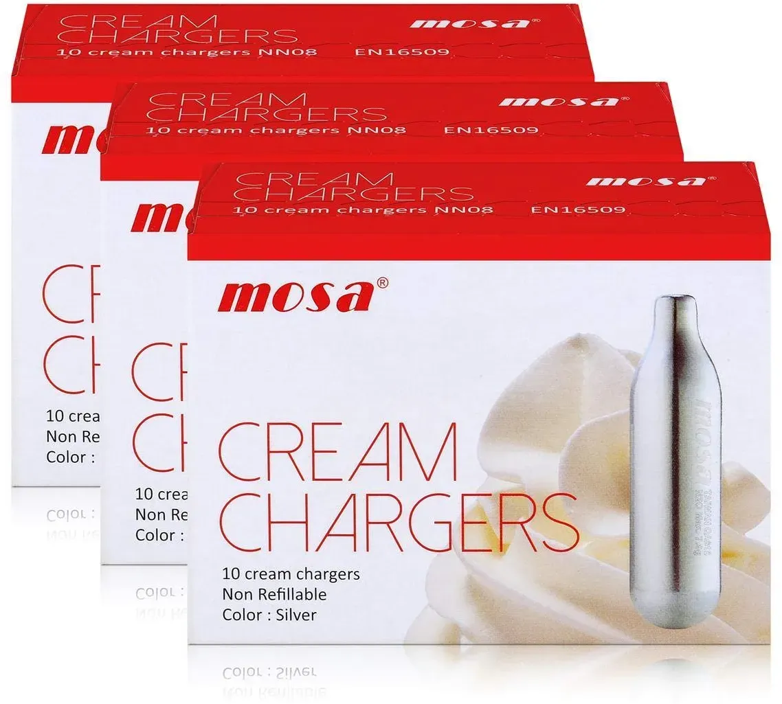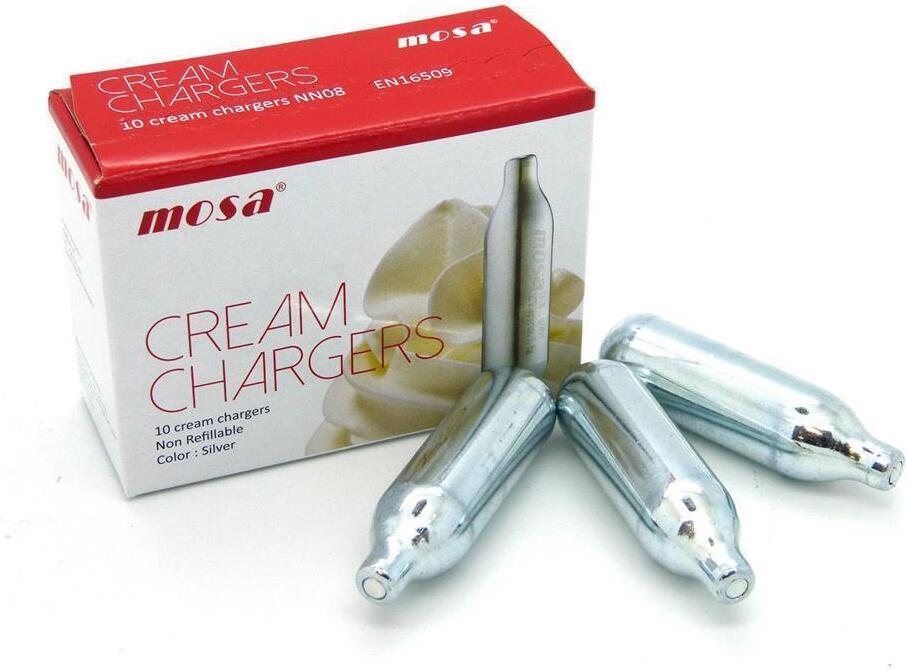 EAN: 4251354421416 - 10 X NEMT N2O Sahnekapseln für ALLE Sahäte auch für ISI, Liss, Mosa, Kayser etcSie bieten hier auf 8g N2O-Patronen zum Aufschäumen von Sahne, Desserts, Cremes, Saucen etc. Passend für alle in Deutschland üblichen Sahäte (Liss, iSi, Kayser etc.) (z.B. iSi Gourmet Whip, iSi Easy Whip, Liss Professional u.a.)8g Sahnekapseln hergestellt aus 100% recyclebarem Stahl Sahnekapseln sind gefüllt mit 100% reinem N2O in Lebensmittelqualität Passend für alle gängigen Sahnespender (Cream Whipper, Mousse Siphon, Cream Dispenser) zum Beispiel für Mosa, iSi, Hendi, Liss, Best Whip etc Sahnekapseln sind nicht wiederbefüllbar. Sahnekapseln sind nur zur Vorbereitung der Schlagsahne im Sahnespender geeignet.Maximal aufzuschäumende Menge pro Kapsel: 0.5L. Bedienungsanleitung des zugehörigen Geräts beachten.Ungeeignet und nicht zugelassen für andere Geräte und Zwecke. Nicht inhalieren! Missbräuchliche Verwendung kann Ihre Gesundheit gefährden. Gegen direkte Sonneneinstrahlung schützen. Kapseln stehen unter Druck, vor Erwärmung unter 60 Grad schützen. Kühl und trocken lagern. Auch nach Gebrauch nicht durchstoßen oder verbrennen. - bei kaufland.de - aus Yadore Produktdaten Mit 30 Mosa Sahnekapseln erhalten Sie hier eine solide Menge für einen fairen Preis. ![]() ![]() 30 x Mosa Sahnekapseln