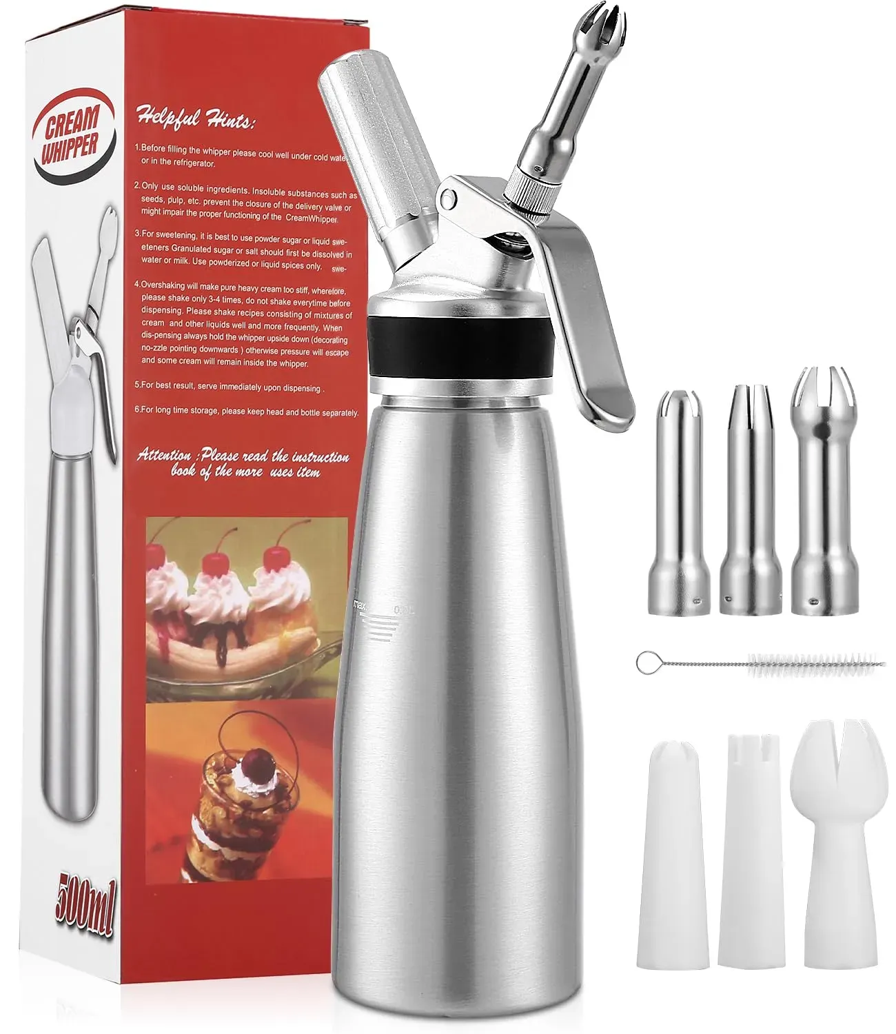 Kategorie: Sonstige Küchenhelfer - fousenuk - GTIN:0709688599003 - Professioneller Whipster Dieser Sahnespender macht Schlagsahne zum Dekorieren von Geburtstagstorten, Gebäck und Desserts, er kann auch Eiscreme, Schokoladenmousse, geschlagene Kokoscreme und schaumige Lattes, Soda und sogar flauschige Rühreier herstellen. Aluminium- und Edelstahlmaterial in Lebensmittelqualität Der Flaschenkörper des Cremeschäumers besteht aus Aluminiummaterial in Lebensmittelqualität, das robust und langlebig ist. Im Vergleich zu herkömmlichen Kunststoffdüsen bestehen unsere Düsen aus Edelstahl, das einfacher zu sterilisieren, sicher und hygienisch ist. Auslaufsicher und leicht zu reinigen Der Kopf des Cremespenders hat einen Silikondichtring, der eine starke Abdichtung hat, und Sie müssen sich keine Sorgen machen, dass die Creme während des Schüttelvorgangs ausläuft. Wir sind mit einer Reinigungsbürste ausgestattet, um die Reinigung der Düse zu erleichtern. Komfortabler Creme-Airbrush-Griff Der Airbrush-Griff des Cremespenders verfügt über eine langlebige Feder, die Sie schnell drücken können, um eine cremige Form zu erzeugen, ohne Druck auf Ihre Hände auszuüben, wodurch Sie Energie und Zeit sparen. Wunderschöne Cremedekoration Egal, ob Sie ein professioneller Koch, Konditor oder Bäcker sind, Sie können mit einem Sahnegerät wunderschöne Crememuster herstellen, um Ihre Kuchendesserts zu dekorieren und Ihre Kuchendesserts köstlich und gut aussehend zu machen. - 21,99 Euro bei Amazon ... Dieses Modell bietet eine gute Ausstattung mit 3 Edelstahl- und 3 Kunststoff-Deko-Düsen zu einem attraktiven Preis. ![]() ![]() hixava 500ml Sahnespender, Sahnespender aus Aluminium, Sahnesyphon mit 3 Edelstahl Deko Düsen, 3 Kunststoffe Deko Düsen, 1 Kapselhalter, 1 Reinigungbürste und 1 Synopsis, für Schlagsahne, Creme, Mousse