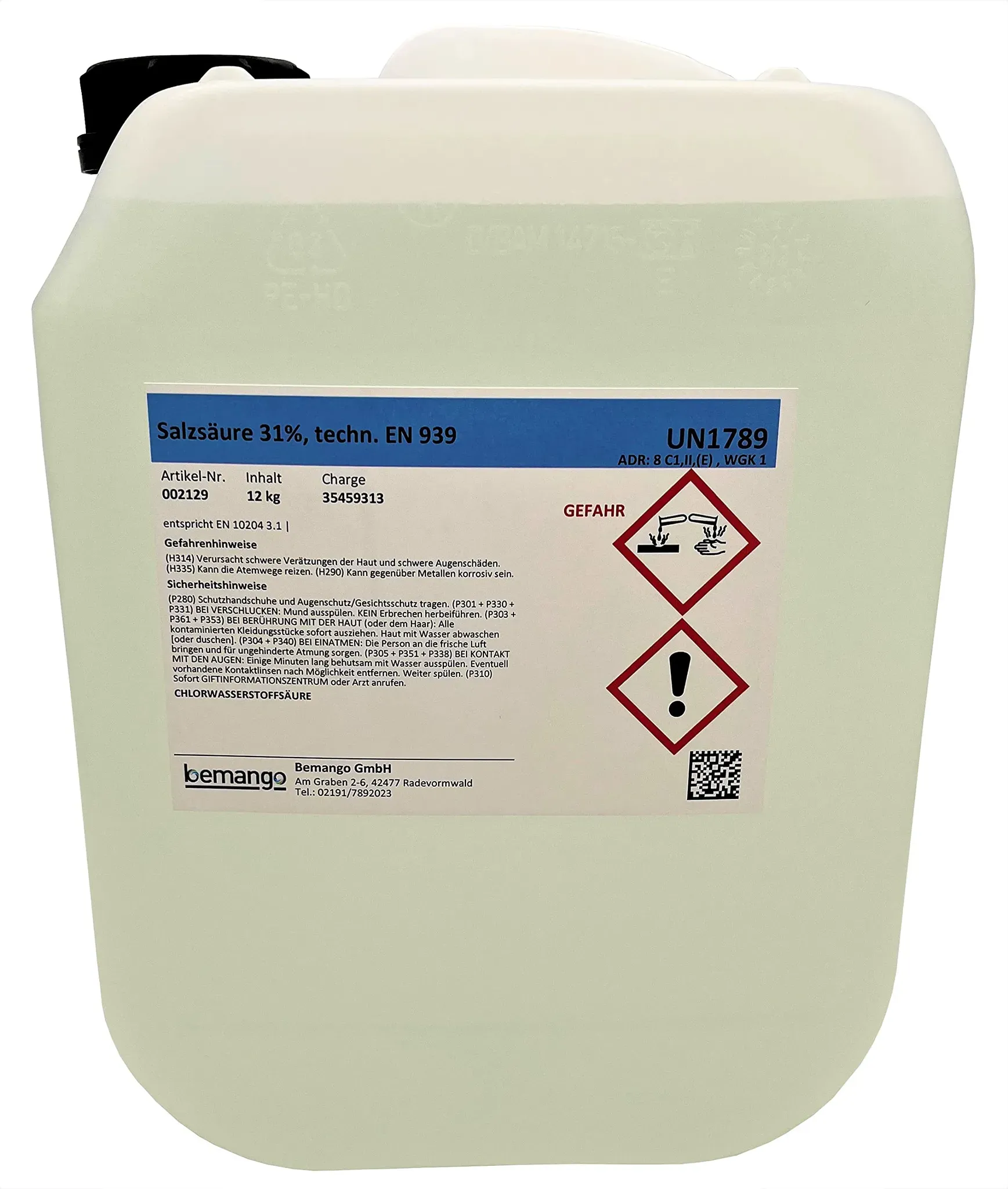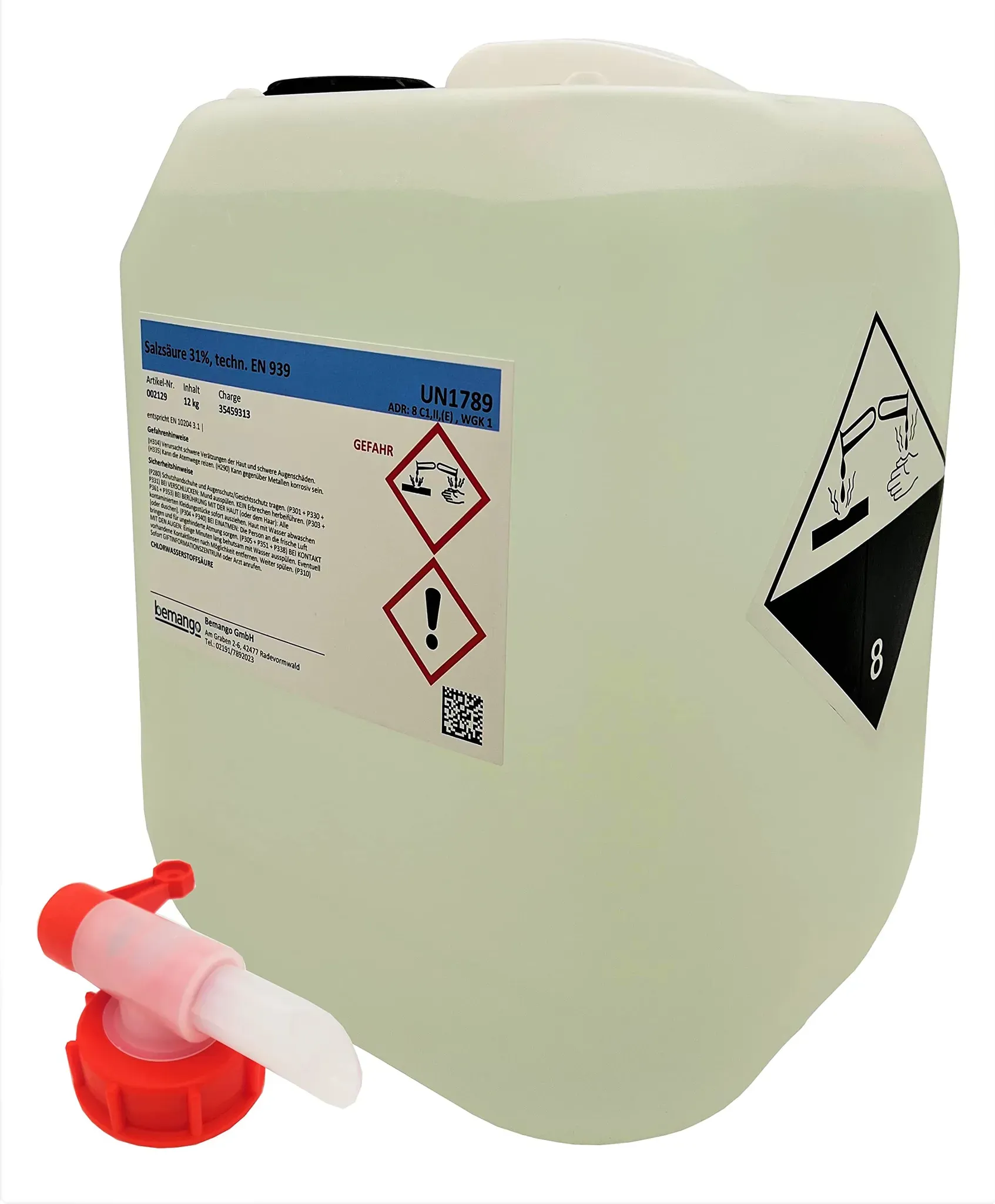 Kategorie: Reinigungsmittel - Bemango - GTIN:4260361940780 - Der Versand von Gefahrgut ist nur national möglich, Paketstationen/Shops und Inseln sind ausgeschlossen! Starke Reinigungskraft: Salzsäure 31 % ist ideal zum Entkalken und Reinigen von hartnäckigen Ablagerungen in sanitären Anlagen und Industrieausrüstungen. Strahlender Glanz rt! Vielseitiger Einsatz: Perfekt für die pH-Regulierung in der Wasseraufbereitung, Galvanikindustrie und bei der Metallbehandlung. Ein Must-have für effiziente Prozesse! Professionelle Ergebnisse: Die hochkonzentrierte Formel gewährleistet schnelle und effektive Resultate. Erleichtert den Arbeitsablauf und spart Zeit und Energie. Industriequalität: Vertrauen Sie auf eine bewährte Lösung für Ihre gewerblichen Anwendungen. Unsere Salzsäure erfüllt höchste Qualitätsstandards - 51,50 Euro bei Amazon Marketplace Automotive - gefunden von billiger.de ![]() ![]() Bemango Salzsäure 30-31% technisch 10 Liter = 12 Kg UN1789 mit Ablasshahn
