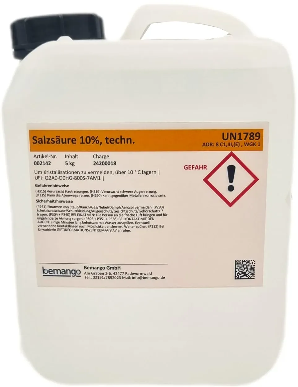 Gewöhnlich versandfertig in 2 bis 3 TagenBemango Salzsäure 10% technisch 5 Liter = 5 Kg UN1789
