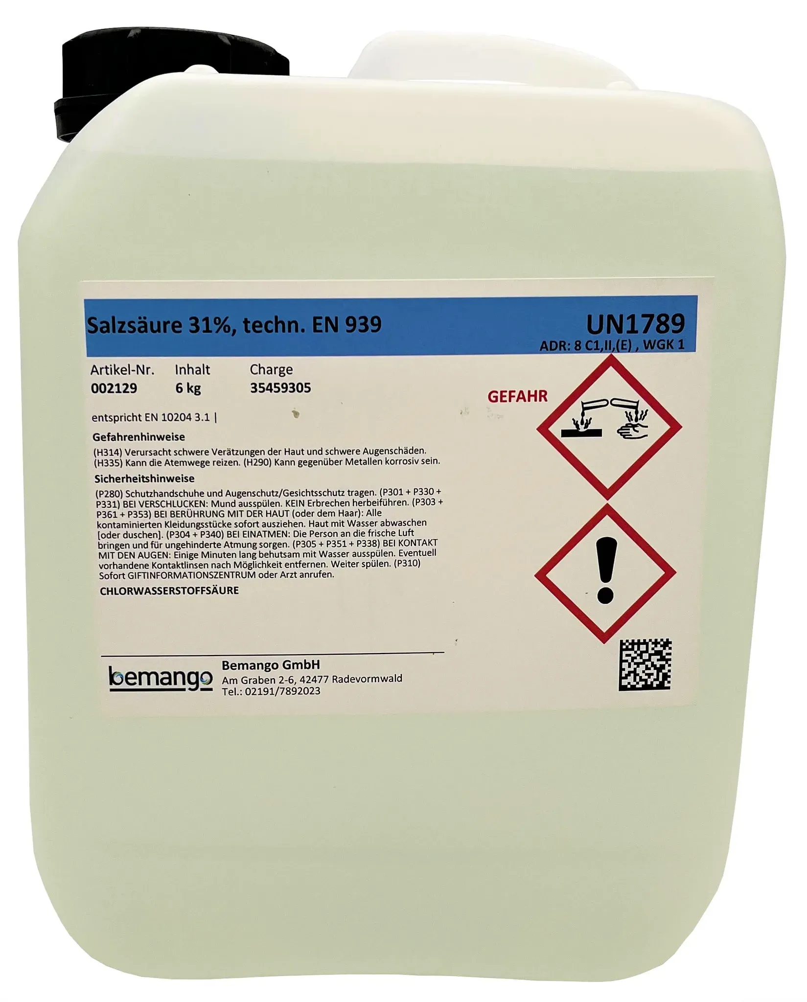 Zustand: Neu - 6,50 € / l - Laborchemikalien - Bemango Bemango GmbH - 42258 - EAN: 4260361942258 - Der Versand von Gefahrgut ist nur national möglich, Paketstationen, Shops und Inseln sind ausgeschlossen! Starke Reinigungskraft: Salzsäure 10 % ist ideal zum Entkalken und Reinigen von hartnäckigen Ablagerungen in sanitären Anlagen und Industrieausrüstungen. Strahlender Glanz rt! Vielseitiger Einsatz: Perfekt für die pH-Regulierung in der Wasseraufbereitung, Galvanikindustrie und bei der Metallbehandlung. Ein Must-have für effiziente Prozesse! Professionelle Ergebnisse: Die konzentrierte Formel gewährleistet schnelle und effektive Resultate. Erleichtert den Arbeitsablauf und spart Zeit und Energie. Industriequalität: Vertrauen Sie auf eine bewährte Lösung für Ihre gewerblichen Anwendungen. Unsere Salzsäure erfüllt höchste Qualitätsstandards - Verkäufer: Bemango im amazon.de Marketplace ![]() ![]() Bemango Salzsäure 30-31% technisch 5 Liter = 6 Kg UN1789