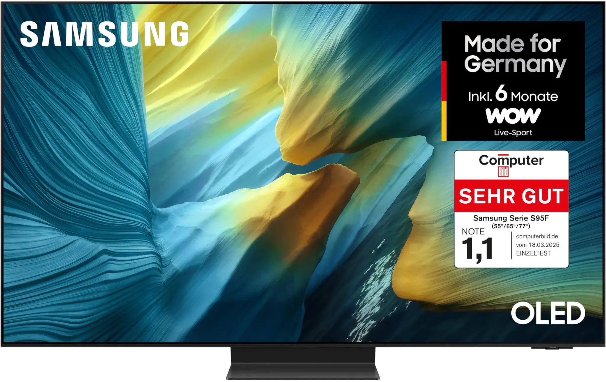 Zustand: Gebraucht - Fernseher - Samsung - GQ55S95FAT - EAN: 8806097057437 - Kostenloser Streaming-Content: Dank Made for Germany kannst Du deine Lieblingsserien, Blockbuster oder Sport-Highlights in bestechender Bildqualität genießen - ganz gleich, ob via Stream oder Satellit. Einfach Aktions-TV oder Aktions-Soundbar mit deutschem Modell-Code kaufen und kostenlosen Streaming-Content dazu erhalten. Samsung AI TV mit HDR OLED Pro und OLED Glare Free für noch mehr Helligkeit und intensive Kontraste ohne störende Spiegelungen unter allen Lichtbedingungen 4K AI Upscaling Pro und Neural Quantum 4K Gen3 Prozessor für scharfe und flüssige Bilder in 4K auf deinem TV-Gerät Motion Xcelerator mit hohen Bildwiederholungsraten von bis zu 165 Hz in 4K für deine Lieblingsgames Die Schönheit minimalistischen Designs dank Infinity One Design, Multidimensionales Sounderlebnis durch Dolby Atmos und AI Sound Lieferumfang: 1 x Samsung KI Fernseher OLED S95F, 55 Zoll (138 cm), Smart TV inkl. Fernbedienung Premium Solar Smart Remote, GQ55S95FATXZG - 1 Händler im amazon.de Marketplace Ein solides Angebot für den 55-Zoll Samsung OLED S95F von einem bekannten Händler, der Vertrauen schafft. Mediamarkt .de Samsung OLEDGQ55S95F OLED 4K Vision AI Smart TV (55 Zoll / 138 cm, UHD 4K, SMART TV)