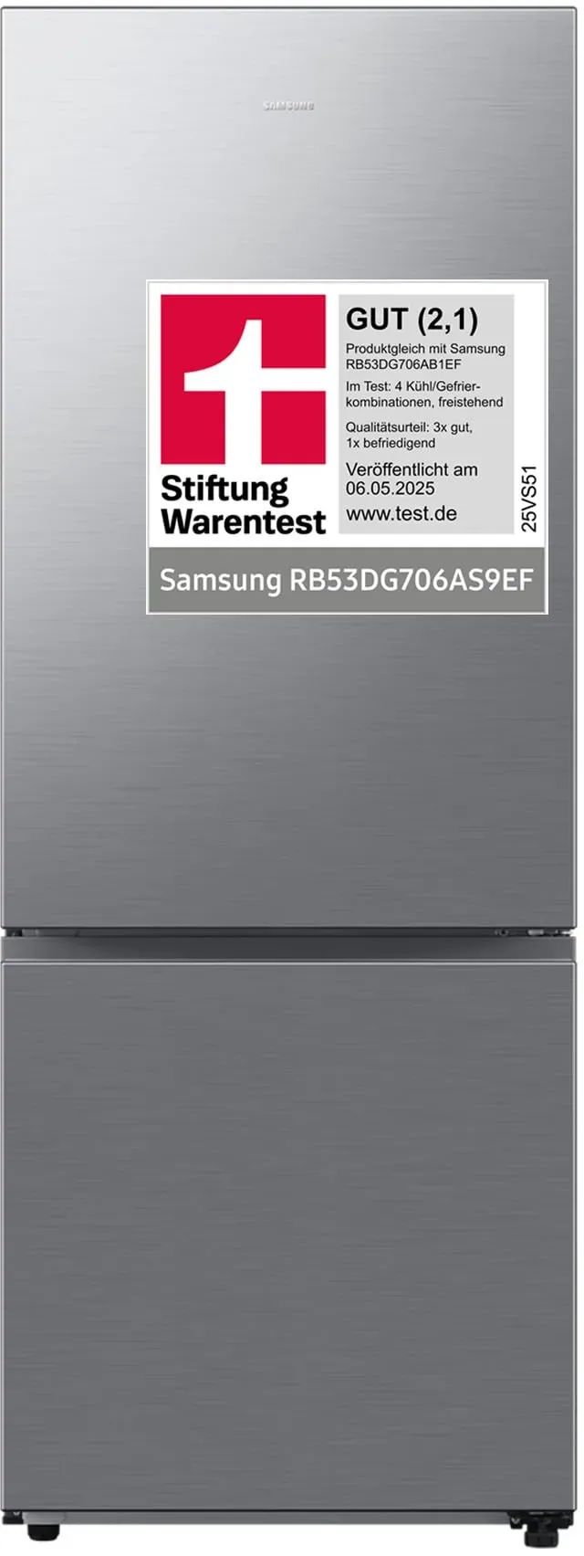 7 Händlerangebote bei billiger.de - EEK: A - Kategorie: Kühl-Gefrierkombinationen - Samsung - Extra breiter Kühlschrank (75 cm) mit SmartThings AI Energy Mode: überprüfung des Stromverbrauchs und Regelung von Kompressorgeschwindigkeit und Abtaufunktion zur Senkung der Stromrechnung €“ alles über Wi-Fi1 2 3 Twin Cooling+: weniger Geruchs- und Geschmacksübertragung zwischen Kühl- und Gefrierbereich dank 2 getrennten Kühlkreisläufen €“ und ideale Luftfeuchtigkeit für Obst und Gemüse Metal Cooling: gleichmäßige Kühlung im Profi-Look dank Metall mit guter Wärmeleitfähigkeit für weniger Temperaturschwankungen und länger frische Lebensmittel auch bei häufigem Türöffnen Twist Ice Maker: Eiswürfel durch ein einfaches Drehen des tragbaren, herausnehmbaren Eisbereiters entnehmen, No Frost+: effektives Ableiten von Feuchtigkeit zur Vermeidung von Frost Lieferumfang: 1 x Samsung RB53DG706AS9EF Kühl-Gefrierkombination, Kühlschrank mit Eiswürfelspender, EEK: A, 538 l, Maße (BxHxT): 75,9 x 203 x 71,1 cm, Farbe: Edelstahl Look - GTIN:8806095536644 ![]() ![]() Samsung Kühl-/Gefrierkombination RB53DG706AS9, 203 cm hoch, 75,9 cm breit, extra weit 75cm, NoFrost grau