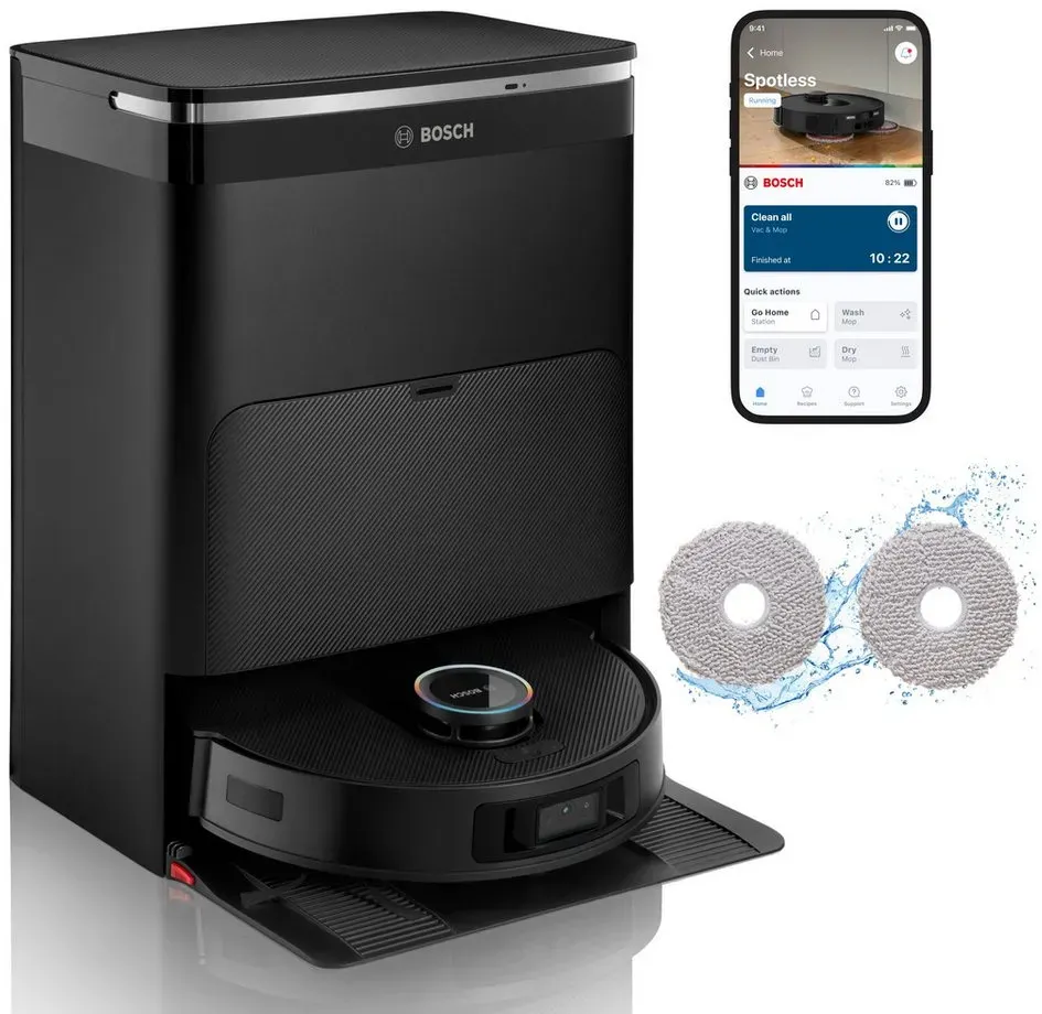 Auf Lager Versand durch AmazonBosch Spotless Max Cam BCRDW3BX Saugroboter mit Wischfunktion, 11.000?Pa Saugkaft, rotierende Wischpads, Nass-Trocken-Servicestation, Selbstreinigung, Smart Vision Kamera, Steuerung per App, schwarz