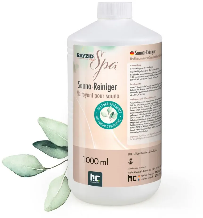 Zustand: Neu - 15,95 € / l - Regular Stores - Bayzid Höfer Chemie GmbH - HC10918 - EAN: 4250463121880 - Für die Reinigung der Sauna wird ein spezielles Reinigungsmittel nötig, welches organische Verunreinigungen zuverlässig entfernt und gleichzeitig das empfindliche Saunaholz schont. Bei Höfer Chemie finden Sie neben den besten Saunadüften und entspannungsfördernden Saunasalzen außerdem vegane Reinigungsmittel für jede Sauna mit herrlich erfrischendem Duft nach Eukalyptus Der hoch konzentrierte Saunareiniger mit Eukalyptusduft von Höfer Chemie ist völlig frei von tierischen Stoffen und überaus ergiebig in der Anwendung. Für die Grundreinigung der Sauna wird der Sauna-Spezialreiniger aus dem Höfer Chemie Onlineshop einfach im Mischverhältnis von 1 : 5 verdünnt aufgetragen. Zur Unterhaltsreinigung von Saunaofen oder Saunasteinen reicht bereits eine Verdünnung von 1 : 20 des veganen Saunareinigers mit Wasser aus, um beste Ergebnisse bei der Saunareinigung zu erzielen. Bereits nach einer kurzen Einwirkzeit haben sich sämtliche Anhaftungen vom Saunaholz gelöst, welche abschließend einfach von den Holzbänken abgewischt oder mit klarem Wasser heruntergespült werden können. Die Sauna ist sofort nach der Reinigung wieder einsatzbereit und duftet frisch nach Eukalyptus. Bitte beachten Sie immer die Hinweise auf dem Produktetikett - Verkäufer: Höfer Chemie GmbH im amazon.de Marketplace Dieser bayzid spa Saunareiniger mit Eukalyptusduft bietet ein angenehmes Aroma und ist ein hochkonzentrierter Grundreiniger. ![]() ![]()