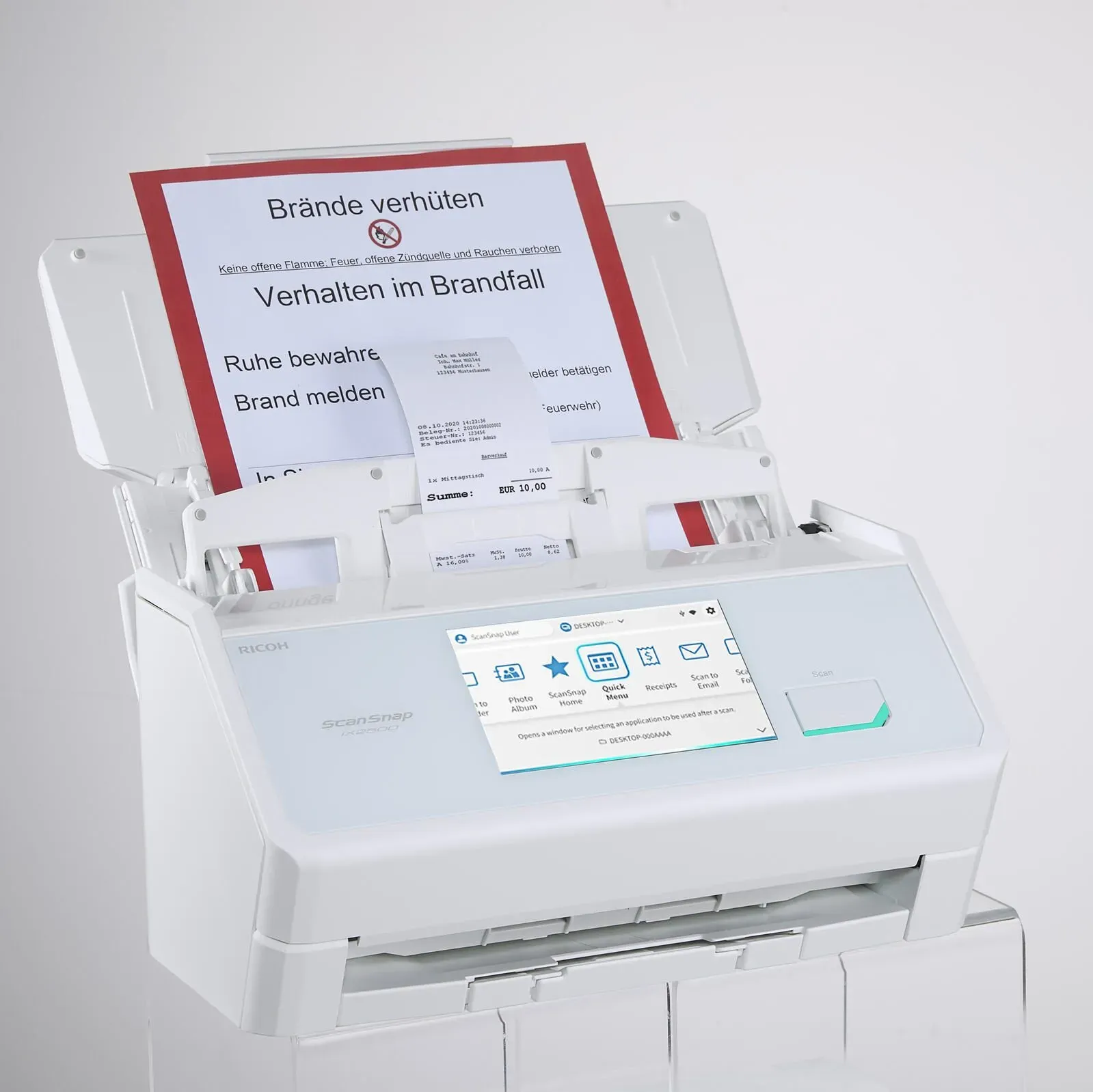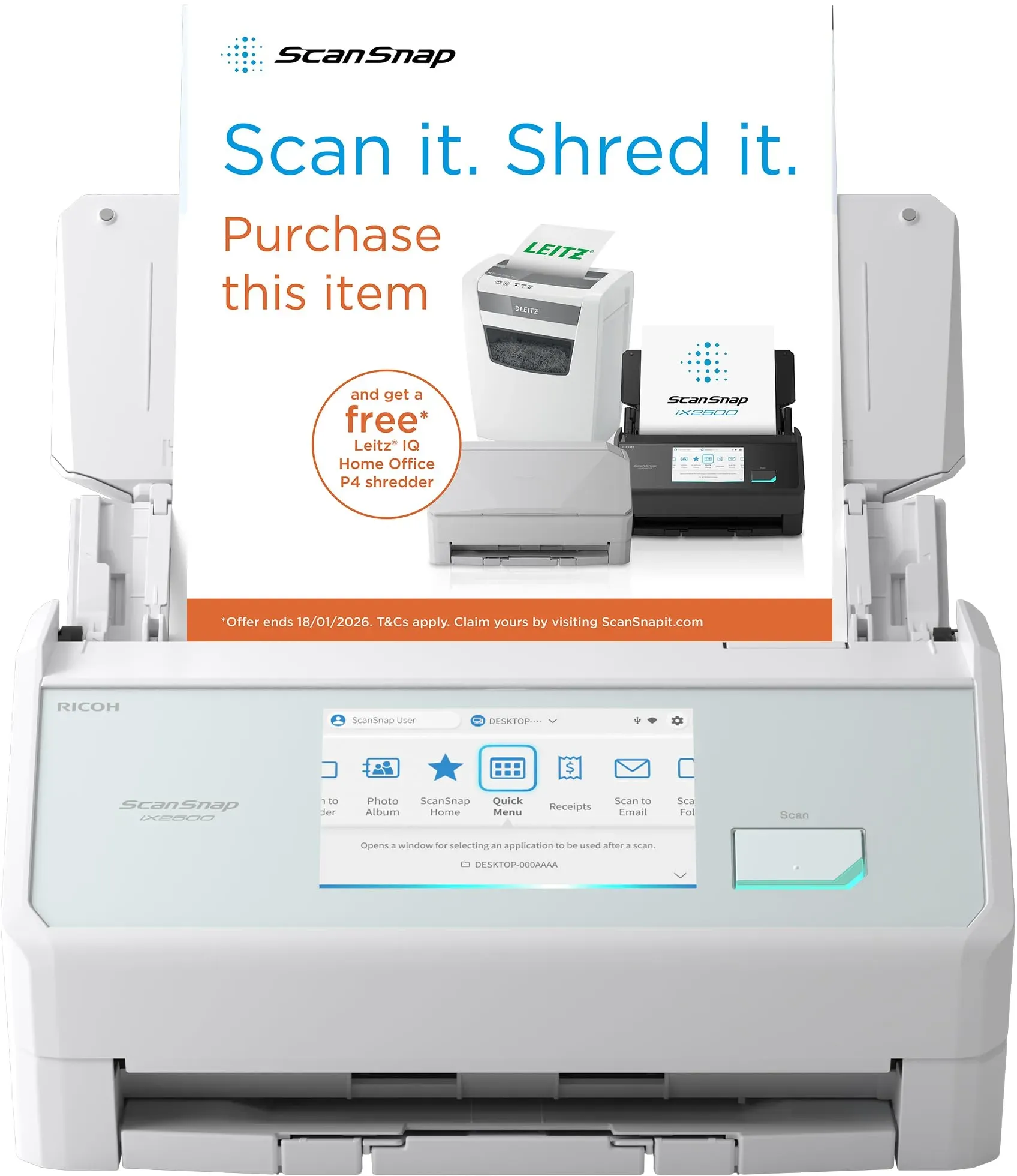 Scanner Lifestyle Technik Computer Scanner Zubehör - - Scannen mit 600 dpi Auflösung - mit dem RICOH ScanSnap iX2500 Dokumentenscanner mit Prämie nach RegistrierungDer RICOH ScanSnap iX2500 Dokumentenscanner mit Prämie nach Registrierung bietet eine bequeme Art Ihre Dokumente einfach und akkurat einzuscannen und an den vorgesehenen Speicherort zu senden.Diese Merkmale zeichnen ihn u.a. aus:Scanauflösung: 600 dpi Duplex-FunktionDrahtlose Schnittstellen12,7 cm (5,0 Zoll) Farb-TouchscreenVerschiedene Scan-FunktionenVerschiedene SoftwaresBeste Vernetzung dank drahtloser SchnittstellenVerbinden Sie das Gerät über USB 3.2 Typ C, WLAN mit anderen Geräten in Ihrem Büro. Die drahtlosen Schnittstellen ermöglichen eine problemlose Einbindung in Ihr Netzwerk zu Hause oder im Büro. Eine gemeinsame Nutzung des Geräts von mehreren Personen ist hierdurch besonders einfach möglich.Scannen bis zum Format A4Das Modell ermöglicht Scans bis zum Papierformat A4. Das Standardformat eignet sich ausgezeichnet für Ihre alltäglichen Aufgaben.Die richtige Softwares für eine mühelose ArbeitsweiseABBYY FineReader (Dokumenten-Management Texterkennung), Kofax Power PDF Standard für Windows (PDF-Software), ScanSnap Home für Windows/MacOS (Scan-Software)- mit diesen Softwares überzeugt das Modell.Was das Modell so speziell machtDas Gerät besitzt folgende Besonderheiten: 12,7 cm (5,0 Zoll) Farb-Touchscreen. Einfache Verbindung über Wi-Fi, USB oder über Bluetooth. Ultraschallsensor verhindert ... Dieses Angebot bietet den weißen ScanSnap iX2500 zu einem guten Preis mit detaillierter Produktbeschreibung. ![]() ![]() Ricoh ScanSnap iX2500 Weiß Ultraschneller Duplex-Scanner mit 45 S./Min., 100-Blatt-ADF, 600 DPI, 5 Touchscreen, WLAN/Bluetooth/USB-Konnektivität
