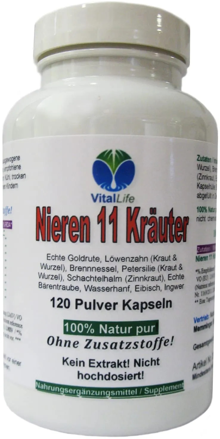 Kategorie: Nahrungsergänzungsmittel - VITA IDEAL - GTIN:4260328479872 - ZUTATEN: Schachtelhalmkraut Pulver (Equisetum arvense), pflanzliche Kapselhülle: Hydroxypropylmethylcellulose (HPMC). Unsere Pulver sind natürlich, pflanzlich und ohne Zusatzstoffe. VERZEHREMPFEHLUNG: Wenn es nicht anders verordnet ist: Nehmen Sie 1 Kapsel morgens und 1 Kapsel mittags mit einem großen Glas Wasser ein. Die angegebene empfohlene tägliche Verzehrmenge darf nicht überschrittenwerden. WICHTIGE HINWEISE: Das Nahrungsergänzungsmittel gilt nicht als Ersatz für eine ausgewogene und abwechslungsreiche Ernährung. - Schwangere, stillende und Personen mit Herz, Nieren und/oder Leber Problemen sollten das Produkt nur nach Rücksprache mit einem behandelnden Arzt einnehmen. - Nicht geeignet bei einer Allergie gegenüber einem Inhaltsstoff. - Lichtgeschützt, trocken und nicht über +25 C lagern. - Das Produkt muss außerhalb der Reichweite von Kindern gelagert werden. INFORMATION: Wenn das Produkt Ihre Erwartungen nicht sofort erfüllt bedenken Sie: Pflanzliche Nahrungsergänzungsmittel entfalten ihre Wirkung mit der Zeit. Für weitere Informationen zur Wirkung und Anwendung empfehlen wir Ihnen sich in Fachliteraturen zu informieren, um die Wahl für ihre Tagesdosierung und Anwendung nach Alter, Gewicht und gesetzten Zielen zu treffen. KUNDENZUFRIEDENHEIT: Die uneingeschränkte Kundenzufriedenheit steht bei uns im Vordergrund. Bei Fragen, Anmerkungen, oder Kritik kontaktieren Sie uns bitte. Um Sie ... Dieses Produkt ist eine gute Wahl, wenn Sie eine Kombination aus Schachtelhalm und anderen Kräutern für die Nierenfunktion suchen. ![]() ![]() VitalLife NIEREN 11 Kräuter "Nierenkräuter" 120 Kapseln NATUR pur Goldrute Eibisch Bärentraube Wasserhanf Brennnessel Schachtelhalm uvm - OHNE Zusatzstoffe [für 2 Monate] 26309-120