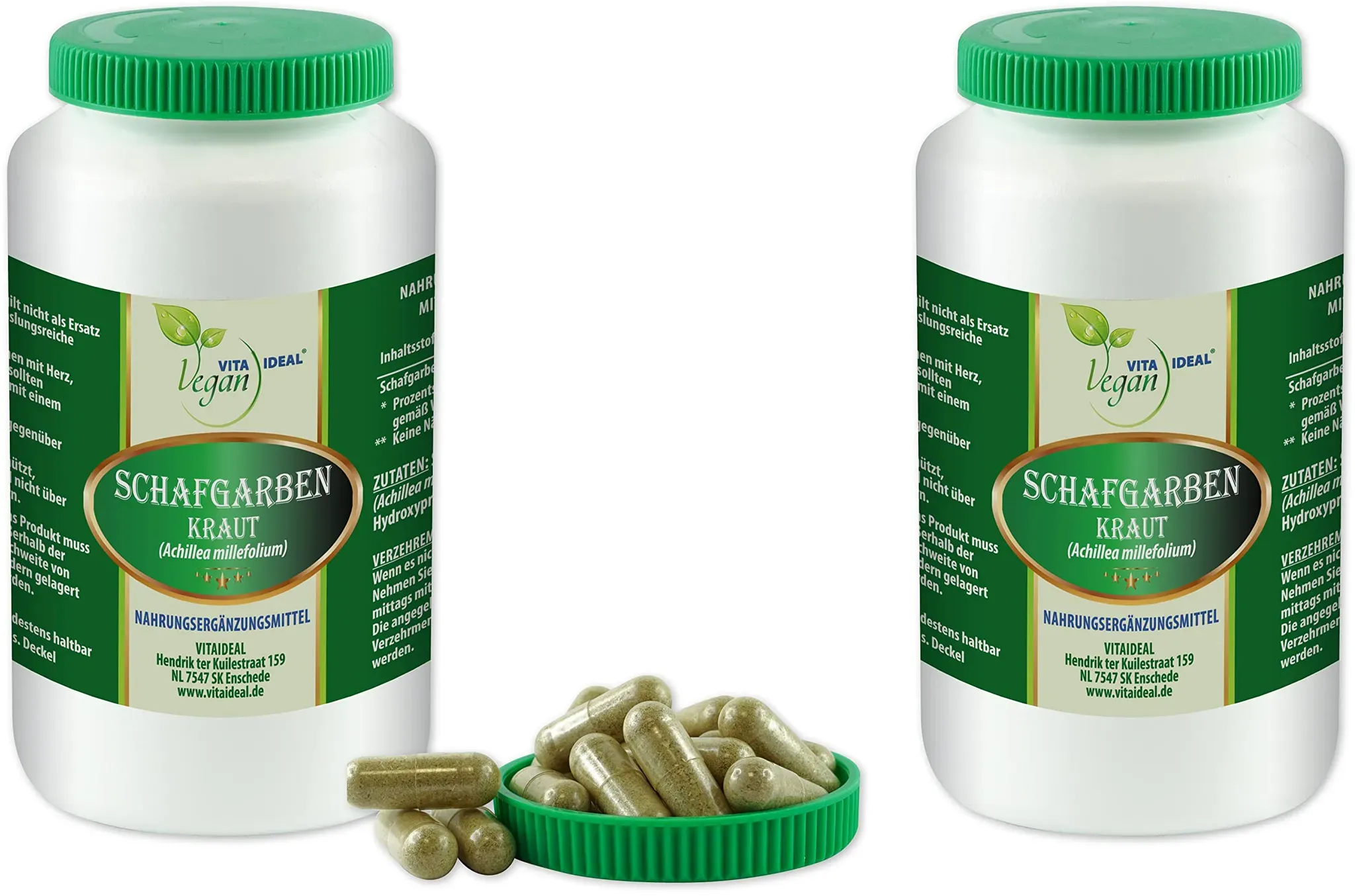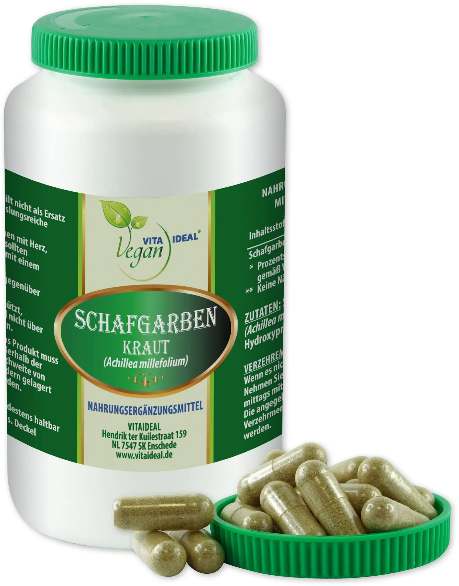 Verfügbarkeit: Auf Lager - Kategorie: Nahrungsergänzungsmittel - VITA IDEAL - GTIN:4260631959818 - INHALT: Pulver von Schafgarben Kraut (Millefolii Hb.) je 350mg, Kapselhülle aus HPMC (pflanzliche Kapselhülle)je 100mg. Unsere Pulver sind zu 100% natürlich und pflanzlich! Ohne Zusatzstoffe! Abgefüllt in den Niederlanden. VERZEHREMPFEHLUNG: Wenn es nicht anders verordnet ist: Nehmen Sie 1 Kapsel morgens und 1 Kapsel mittags mit einem großen Glas Wasser ein. Weitere Informationen zur Wirkung und Anwendung können bei einem Naturheilpraktiker, Facharzt oder Apotheker in Erfahrung gebracht werden. Auch aus Internetquellen wie z.B. Videoplattformen, Informationsseiten zum Thema Heilkräuter können entnommen werden um die Wahl für ihre Tagesdosierung und Anwendung nach Alter, Gewicht und gesetzten Zielen zu treffen. INFORMATION: Wenn das Produkt Ihre Erwartungen nicht sofort erfüllt €“ bedenken Sie: Pflanzliche Nahrungsergänzungsmittel entfalten ihre Wirkung mit der Zeit. KUNDENZUFRIEDENHEIT: Die uneingeschränkte Kundenzufriedenheit steht bei uns im Vordergrund. Bei Fragen, Anmerkungen, oder Kritik kontaktieren Sie uns bitte. Um Sie zufriedenzustellen und als Kunden zu behalten, werden wir mit Hochdruck an einer Lösung arbeiten. Nur so können wir uns VERBESSERN und WEITERENTWICKELN. VITAIDEAL steht für: KUNDENZUFRIEDENHEIT, QUALITäT, FAIRE PREISE und WEITERENTWICKLUNG. Wir erweitern unser Sortiment stetig. Schauen Sie sich auch gerne die anderen ... Dieses Produkt ist mit 57,95 Euro für 2x360 Kapseln die größte und preiswerteste Option pro Kapsel für reines Schafgarbenkraut. ![]() ![]() VITA IDEAL Vegan® Schafgarben Kraut (Millefolii Hb., Schafgarbe) 2x360 Kapseln je 400mg, rein natürlich ohne Zusatzstoffe.