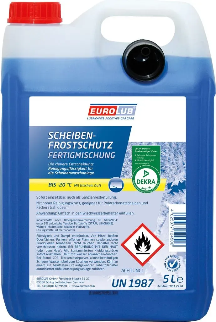 Verfügbarkeit: lieferbar-in 8-10 Werktagen bei dir - 3.25/1l - Kategorie: Pflegemittel & Schädlingsbekämpfung - Dr. Starke - GTIN:4029898213060 - Hinweise Signalwort , Achtung, Sicherheitshinweise , P102 Darf nicht in die Hände von Kindern gelangen. P210 Von Hitze, heißen Oberflächen, Funken, offenen Flammen sowie anderen Zündquellen fernhalten. Nicht rauchen P233 Behälter dicht verschlossen halten P303+P361+P353 BEI BERüHRUNG MIT DER HAUT (oder dem Haar): Alle kontaminierten Kleidungsstücke sofort ausziehen. Haut mit Wasser abwaschen oder duschen. P501 Inhalt/Behälter unter Beachtung der behördlichen Vorschriften entsorgen., Gefahrenhinweise , H226 Flüssigkeit und Dampf entzündbar., - 3,25 Euro bei OTTO - gefunden von billiger.de Ein weiterer preiswerter 5L Fertigmix für 5.99 Euro, der eine gute Basislösung bietet. ![]() ![]() aroso Scheibenfrostschutz Fertigmix -20°C 5 l