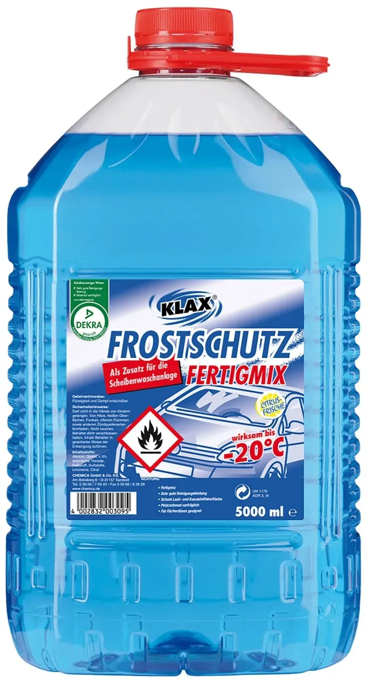 3 Händlerangebote bei billiger.de - Kategorie: Autoreinigung & Pflege - aroso - Produktdetails Inhaltsstoffe , siehe Beschreibung, Hinweise Signalwort , Achtung, Sicherheitshinweise , P501 Inhalt/Behälter gemäß lokalen/regionalen/nationalen/internationalen Vorschriften zuführen.; P233 Behälter dicht verschlossen halten.; P210 Von Hitze, heissen Oberflächen, Funken, offenen Flammen und anderen Zündquellen fernhalten. Nicht rauchen.; P102 Darf nicht in die Hände von Kindern gelangen., Gefahrenhinweise , Signalwort:AchtungGefahrenhinweiseH226 Flüssigkeit und Dampf entzündbar.SicherheitshinweiseP101 Ist ärztlicher Rat erforderlich, Verpackung oder Kennzeichnungsetikett bereithalten.P501 Inhalt/Behälter gemäß lokalen/regionalen/nationalen/internationalen Vorschriften zuführen.P233 Behälter dicht verschlossen halten.P210 Von Hitze, heissen Oberflächen, Funken, offenen Flammen und anderen Zündquellen fernhalten. Nicht rauchen.P102 Darf nicht in die Hände von Kindern gelangen., - GTIN:8591522211163 Für 5.99 Euro erhalten Sie hier 5 Liter gebrauchsfertigen Scheibenfrostschutz, was ein gutes Preis-Leistungs-Verhältnis darstellt. ![]() ![]() Klax Scheibenfrostschutz bis -20 °C Gebrauchsfertig 5 l Kanister
