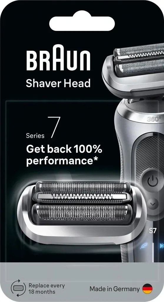 Verfügbarkeit: 1-3 Werktage - Kategorie: Rasierzubehör - Braun - GTIN:4987176189066 - ProduktbeschreibungDer BRAUN Scherkopf 74S ist das ORIGINAL Ersatzscherteil für deinen Braun Series 7 Elektrorasierer. Der innovative 360° SkinFlex Kopf mit **3 flexiblen Klingen** passt sich individuell deinen Gesichtskonturen an €“ selbst in schwer erreichbaren Bereichen €“ für eine gründliche und schnelle Rasur (vs. S7 Vorgängermodell).Kompatibilität & EinbauDer Scherkopf 74S ist **kompatibel mit den Series 7 Rasierern** der Serien 70, 71 und 72. Der Austausch ist kinderleicht: Mit nur **1 Klick** lässt sich der Scherkopf wechseln €“ ohne Werkzeug.Vorteile & LeistungsmerkmaleSanft zur Haut: Die Folientechnologie schützt vor Schnitten und Rasierverletzungen.Gründlich & schnell: 360° SkinFlex passt sich an Konturen an und erhöht die Effizienz im Vergleich zu älteren Modellen.Einfacher Wechsel: Austausch mit einem Klick, kein Spezialwerkzeug nötig.Empfohlener Austausch: Für beste Ergebnisse den Scherkopf alle 18 Monate erneuern.Pflege & AnwendungFür langlebige Leistung regelmäßig reinigen: Nach jeder Rasur kurz ausklopfen oder unter fließendem Wasser abspülen (je nach Rasierermodell). Trocknen lassen und den Scherkopf bei Bedarf gemäß Bedienungsanleitung austauschen. Als Zubehör zum Elektrorasierer trägt der 74S zu einer konstant zuverlässigen Rasur bei.Tipp: Tausche den Scherkopf alle 18 Monate und reinige das Schersystem regelmäßig €” so erhältst du ... Dieser Original Braun Scherkopf ist mit 40.49 Euro eine sichere Investition für optimale Rasierergebnisse und Langlebigkeit. ![]() ![]() Braun Series 7 Elektrorasierer Scherkopf, ORIGINAL Ersatzscherteil vom Hersteller passend für Braun Herren Rasierer Series 7 der neuen Generation, 73S, Silber, 1er Pack