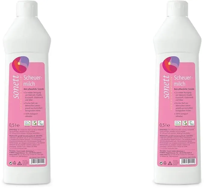 6 Händlerangebote bei billiger.de - Kategorie: Reinigungsmittel - Sonett - Produktbesonderheit Die Sonett Scheuermilch basiert auf reinem Kalkmehl und ist äußerst sanft und schonend im Gebrauch. Durch die natürliche Lavendel-Citrus-ölmischung wird eine leicht keimhemmende Wirkung erzielt. Anwendungsbereich Zur milden Reinigung von Edelstahl, Emaille, Kunststoff, Glaskeramik, Armaturen und Silber. Nicht geeignet für Acrylglas. Biologischer Abbau Kalkmehl ist mineralischer Natur und nicht weiter abzubauen. Im Herstellprozess von Kokosfettalkoholsulfat und Zuckertensiden werden aus den pflanzlichen Rohstoffen Stärke, Zucker, Fett Teile entnommen, die in ihrem natürlichen Strukturgefüge jedoch voll erhalten bleiben. Daher ist es für die Mikroorganismen relativ einfach, diese Tenside sehr rasch und vollständig zu 100% abzubauen. Zuckertenside und Kokosfettalkoholsulfat gelten nach OECD als leicht biologisch abbaubar. Scheuermilch, 0.5 L Sonett Scheuermilch, Universal, Flüssigkeit, 500 ml, Keramik, Glas, Metall, Edelstahl, Flasche, 1 Stück(e) Sonett Scheuermilch. Gerätetyp: Universal, Substanz: Flüssigkeit, Fassungsvermögen: 500 ml. Anzahl enthaltener Produkte: 1 Stück(e). Zertifizierung: NCP (Nature Care Product) CSE (Certified Sustainable Economics) Vegan Society - GTIN:4007547400009 Eine weitere umweltbewusste Wahl, die für ihre sanfte, aber effektive Reinigung bekannt ist. ![]() ![]() Klar Scheuermilch 500 ml