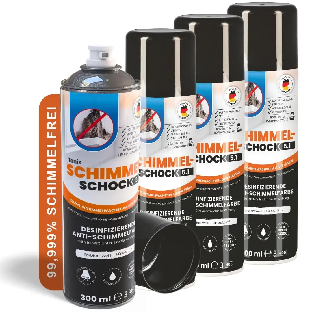4 Händlerangebote bei billiger.de - Kategorie: Reinigungsmittel - tonis schimmelschock - SCHIMMELSCHOCK SAGT SCHIMMEL DEN KAMPF AN - Ideal gegen Schimmelflecken an weißen Wänden und Decken. Tonis SCHIMMELSCHOCK 5.1 hat eine 99,999% antimikrobielle Wirkung und wirkt zuverlässig und sofort.CHLORFREI, GERUCHSARM UND WASSERBASIERT - Ob Küche, Bad, Kinder-, Schlaf- oder Wohnzimmer: ohne Vorbehandlung über die Schimmelflecken an Wand oder Decken streichen, ca. 4-6 Stunden trocknen lassen, zweite Schicht auftragen. Die Räume sind direkt wieder bewohnbar.SCHIMMEL-BEKäMPFUNG SCHNELL UND EFFEKTIV - Für verschiedene Untergründe geeignet, z. B. Putz, Beton, Kalksandstein, Raufasertapete, Mineralfarbe, Altanstrich, Gipskarton.AUCH ZUR PRäVENTION - Beugen Sie Schimmel effektiv vor, anfällige Stellen präventiv streichen damit Schimmel gar nicht erst entsteht. Die Wirksamkeit von Tonis Schimmelschock ist wissenschaftlich nachgewiesen. EINFACH GEGEN SCHIMMEL - Einfache, saubere Anwendung ohne Vorbehandlung und ohne Vorkenntnisse für bis zu 36 m2 bei einmalig Schimmel den Kampf anzusagen war bisher eine echte Herausforderung, denn: Flecken einfach zu überstreichen hilft meistens nicht, der Schimmel kommt schnell wieder. Also mussten mühsam die befallenen Tapeten entfernt, der Putz abgetragen und anschließend alles ausgebessert oder erneuert werden. Die desinfizierende Anti-Schimmel-Farbe Tonis SCHIMMELSCHOCK 5.1 hingegen stoppt Schimmel schnell und effektiv - Vorbehandlung, Vorkenntnisse oder ... Dieses 4er Set Sprühfarbe ist ideal für Anwender, die mehrere kleinere Schimmelstellen behandeln möchten oder einen Vorrat wünschen. ![]() ![]() Tonis SCHIMMELSCHOCK 4er Set 5.1 Anti-Schimmel-Farbe mit 99,999% antimikrobieller Wirkung | Sprühfarbe für ca. 1,5 m2, wissenschaftlich nachgewiesene Sofortwirkung | Effektiv und zuverlässig