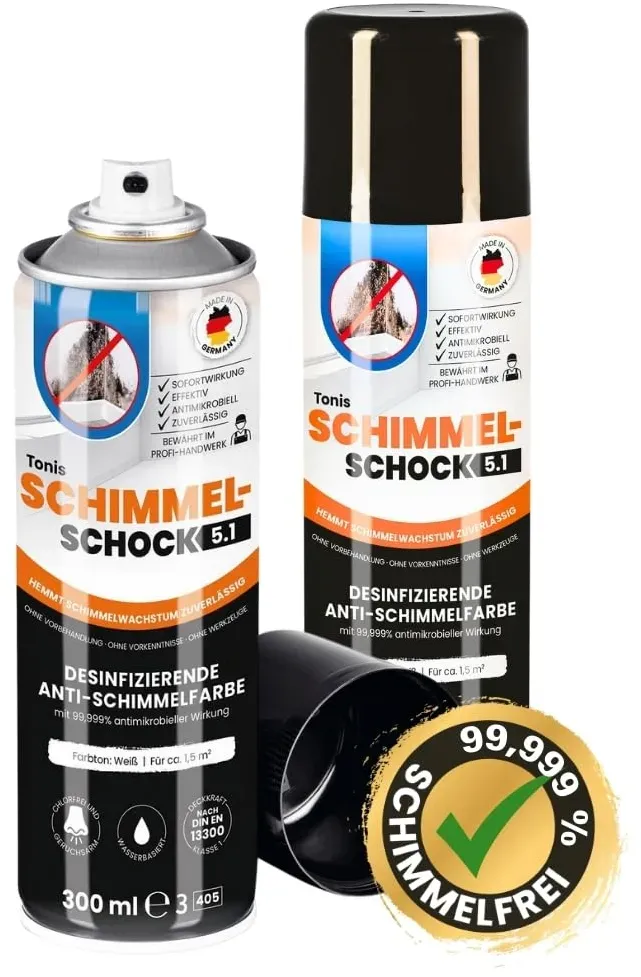 Zustand: Neu - 64,57 € / l - Sprayfarben - Tonis SCHIMMELSCHOCK Hergestellt für: PCI GmbH - - EAN: 4262423050161 - GRÜNDLICH SCHÜTTELN UND MINDESTENS 20°C - Bei Sprühdosen ist es extrem wichtig, dass die Farbe nicht zu kalt ist und die Dose vor Gebrauch sehr intensiv 2 Minuten lang geschüttelt wird. Es kann sonst vorkommen, dass die Farbe klumpig aus der Dose kommt oder der Sprühkopf scheinbar gar nicht funktioniert. Unser Tipp bei zu kalter Farbe: die Dose vorher für 10 Minuten in lauwarmes Wasser stellen - und unbedingt lange und kräftig schütteln. DIE ANTIMIKROBIELLE FARBE SAGT SCHIMMEL DEN KAMPF AN - Ideal gegen Schimmelflecken an weißen Wänden und Decken. Tonis SCHIMMELSCHOCK 5.1 wirkt effektiv und zuverlässig gegen Schimmel. CHLORFREI, GERUCHSARM UND WASSERBASIERT - Ob Küche, Bad, Kinder-, Schlaf- oder Wohnzimmer ohne Vorbehandlung - sprühen Sie den Schimmelfleck aus etwa 25 cm Abstand gründlich ein und lassen Sie die Sprühfarbe ca. 30 Minuten trocknen. Für einen langfristigen Schutz und ein gleichmäßiges Farbbild ein zweites Mal wiederholen, Räume direkt wieder bewohnbar. SCHIMMEL-BEKÄMPFUNG AUF VIELEN UNTERGRÜNDEN - Für verschiedene Untergründe geeignet, z. B. Putz, Beton, Kalksandstein, Raufasertapete, Mineralfarbe, Altanstrich, Gipskarton. BIOZIDPRODUKT - Biozidprodukte vorsichtig verwenden. Vor Gebrauch stets Etikett und Produktinformationen lesen. BAuA Reg-Nr: N-113817. - Verkäufer: DSIMPACT im amazon.de Marketplace Ein praktisches 2er Set Sprühfarbe, das sich für etwas größere, aber immer noch überschaubare Flächen anbietet. ![]() ![]() Tonis SCHIMMELSCHOCK 2er Set 5.1 Anti-Schimmel-Farbe mit 99,999% antimikrobieller Wirkung | Sprühfarbe für ca. 1,5 m2, wissenschaftlich nachgewiesene Sofortwirkung | Effektiv und zuverlässig
