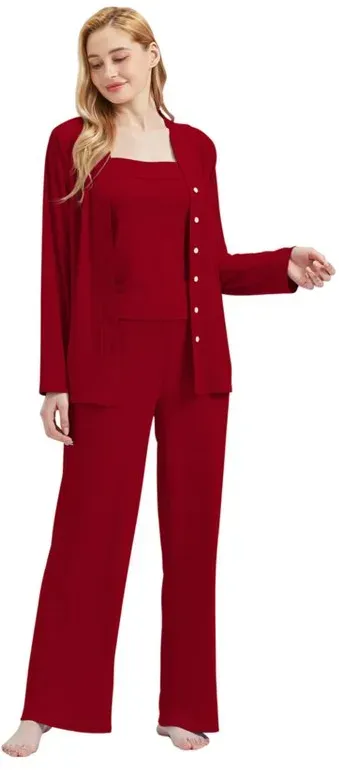 lieferbar-in 3-4 Werktagen bei dirM-Diamant Schlafanzug Damen Pyjama-Set Damenwäsche V-Ausschnitt 3 teilig (Set, 3 tlg) 3-teiliges Set: Jacke mit V-Ausschnitt und Knöpfen, Trägertop und Hose rot L