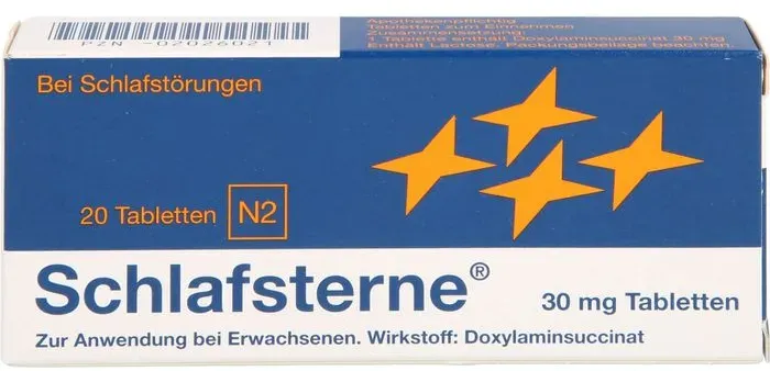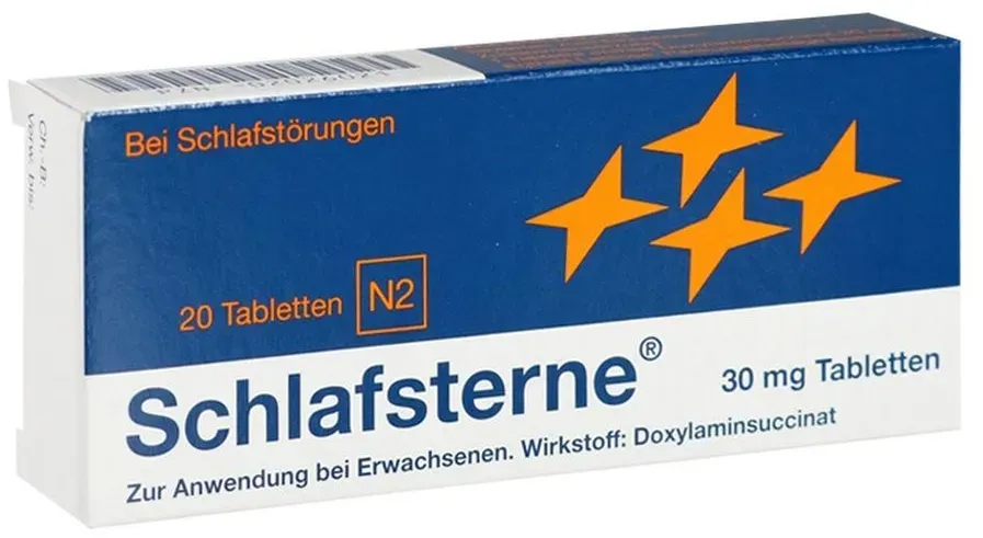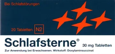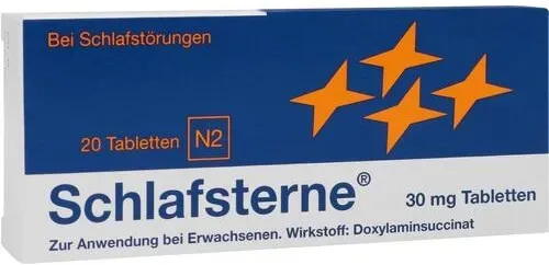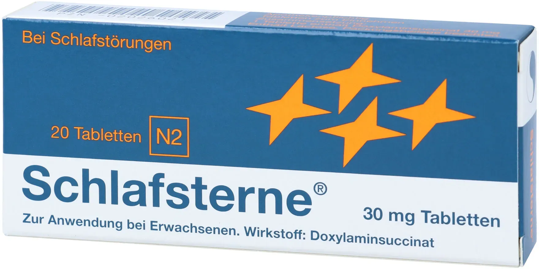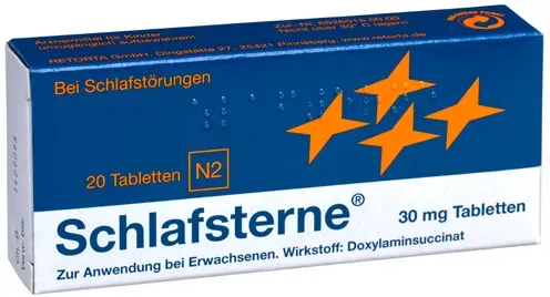 Kategorie: Arzneimittel - Retorta - GTIN:4150020260215 - PZN:02026021 - Wichtige Hinweise (Pflichtangaben): Schlafsterne 30 mg Tabletten . Wirkstoff: Doxylaminsuccinat. Anwendungsgebiete: Bei medikamentös behandlungsbedürftigen Ein- und Durchschlafstörungen. Warnhi... - 5,99 Euro bei Mycare - gefunden von billiger.de ![]() ![]() Retorta SCHLAFSTERNE Tabletten 20 St.