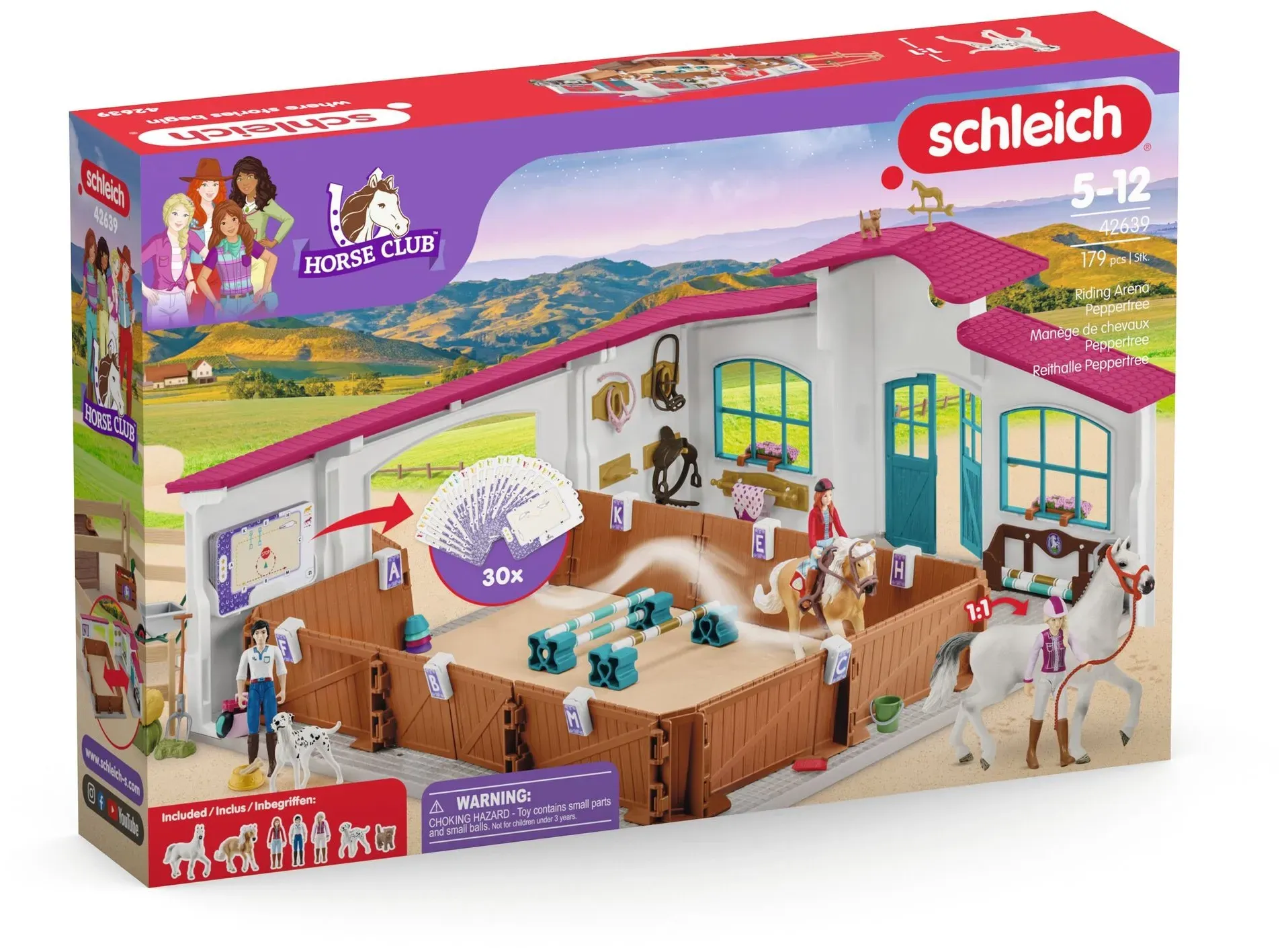Verfügbarkeit: 3-4 Werktage - Kategorie: Schleich - Schleich - GTIN:4059433720098 - '\'Endlich! Hannah, Sofia und Tom können neue Kunststücke einstudieren! Hannah holt ihre hübsche, weiße Oldenburger Stute, sattelt sie und legt ihr das Zaumzeug an. Gemeinsam mit Tom will sie heute voltigieren. Der hat schon eine neue Hufschlagfigur an der Tafel aufgehängt und die Klemmtafeln mit Buchstaben an den Hallenbanden festgesteckt. Mal sehen, was Hannah und ihr Pferd heute für eine Figur einstudieren. Derweil kümmert sich Sofia um ihre treue Haflinger Stute. Sie wollen heute das Springreiten üben. Mit den Cavaletti klappt es schon ganz gut, bei den höheren Hindernissen müssen die beiden noch etwas trainieren. Und nach der Reiteinheit gibt es eine leckere Belohnung: einen Apfel für Sofia und eine Möhre fürs Pferd. Na, vielleicht bekommt es auch noch einen Extraapfel dazu.\'.' - 94,99 Euro bei voelkner Marktplatz - gefunden von billiger.de ![]() ![]() Schleich Horse Club Reithalle Peppertree 42639