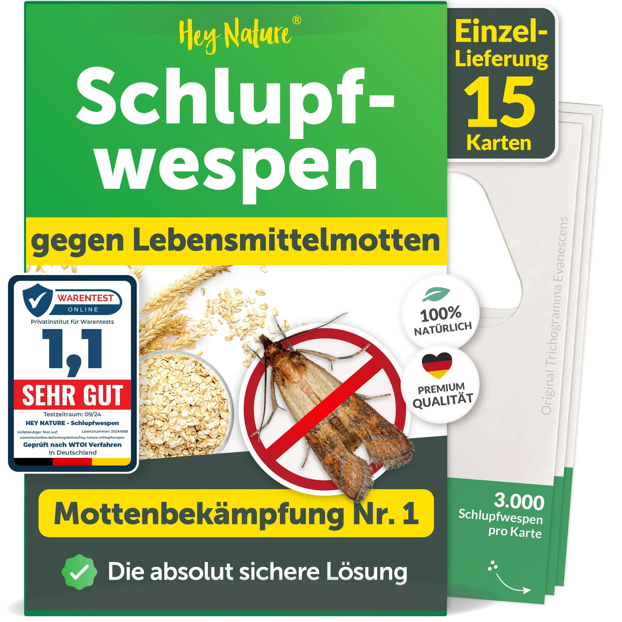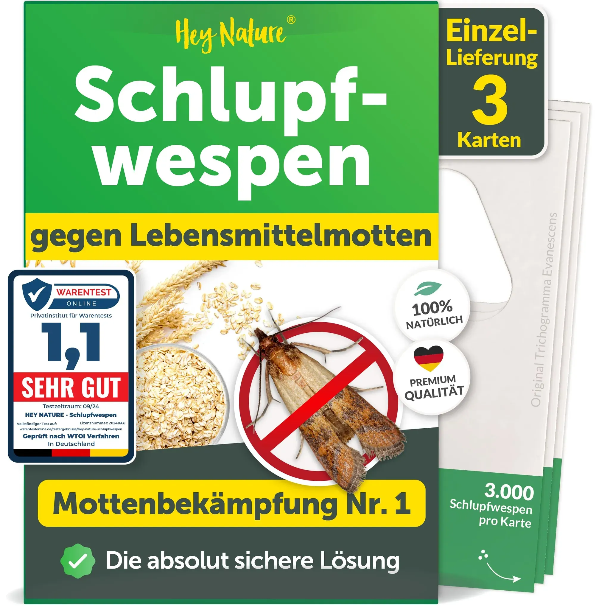 Zustand: Neu - Mottenabwehr - GREEN GUARDIA - keine - EAN: 4260707473743 - œ EFFEKTIVER MOTTENSCHUTZ: Unsere Schlupfwespen bekämpfen Lebensmittelmotten (parasitieren die Motteneier) direkt am Ursprung des Problems und sorgen für ein mottenfreies Zuhause. œ NATÜRLICHE & UMWELTFREUNDLICHE MOTTENFALLE: Die winzigen (0,4mm) Schlupfwespen sind harmlos für Kinder, Haustiere und die Umwelt, bieten aber ein wirksames Mittel gegen Lebensmittelmotten. œ EINFACHE ANWENDUNG: Platzieren Sie die Schlupfwespenkarten neben den befallenen Lebensmitteln oder den Staufächern, um Lebensmittelmotten zu bekämpfen und Mottenschutz zu gewährleisten. œ FRISCHE & ZUVERLÄSSIGE LIEFERUNG: Unsere Nützlinge werden werktags frisch und sicher aus der Produktion verpackt und versandt, um eine maximale Wirksamkeit unserer Mottenfalle sicherzustellen. œ KOMPETENTE BERATUNG: Unser Experten-Team steht Ihnen für alle Fragen rund um das Thema Lebensmittelmotten bekämpfen und die Anwendung unserer Lebensmittelmotten zur Verfügung. - Verkäufer: CuBeRo GmbH im amazon.de Marketplace Dieses Angebot ist mit 16,50 Euro für 3 Karten eine gute Option für die Bekämpfung von Lebensmittelmotten. ![]() ![]() Hey Nature Schlupfwespen gegen Lebensmittelmotten - 1 x 3 Karten - Mit Schlupfwespen effektiv Lebensmittel-Motten bekämpfen - Alternative zu Lebensmittelmotten Falle, Mottenkugeln & Mottenspray