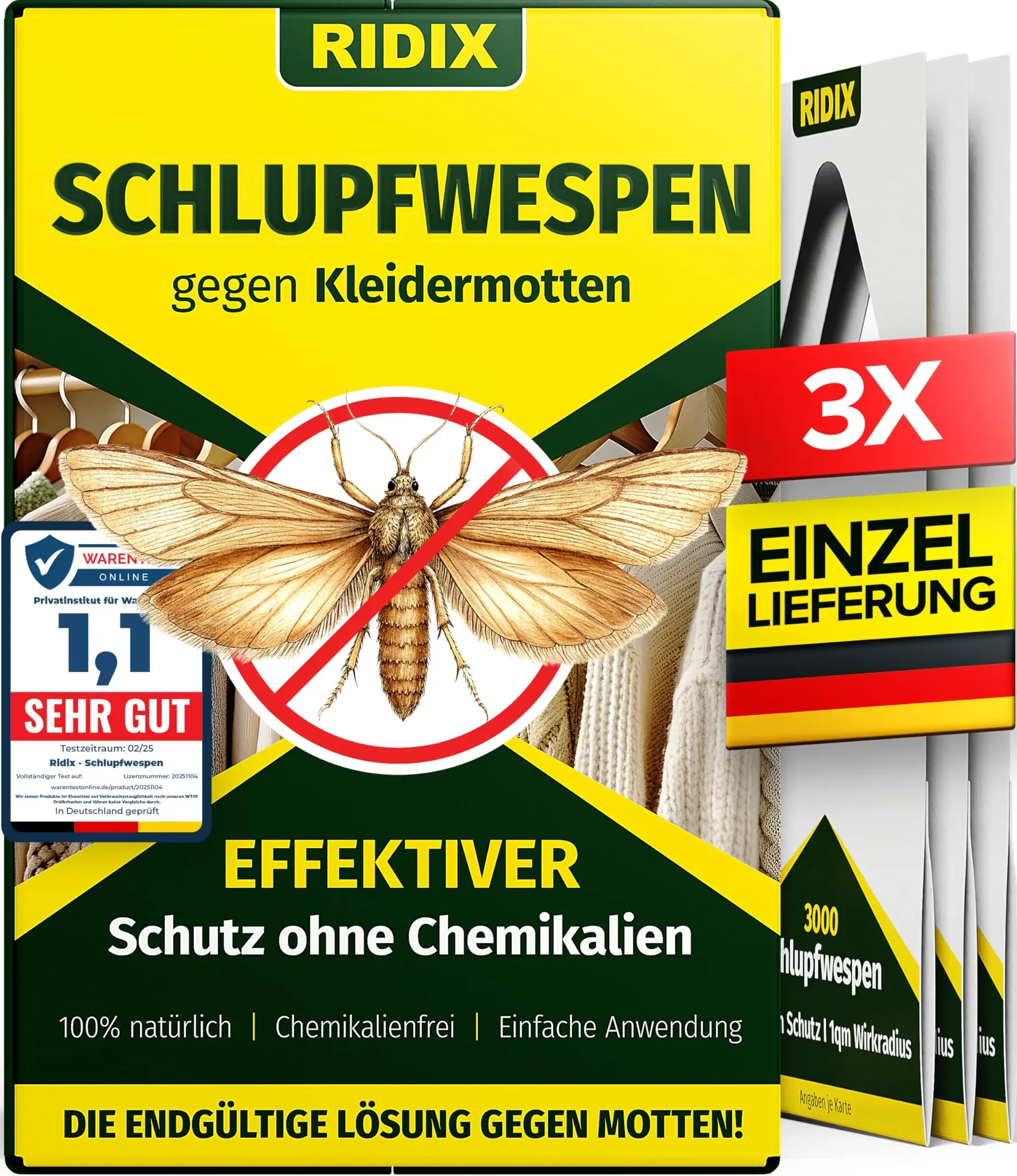 Zustand: Neu - Mottenabwehr - anwerk - SWLME - EAN: 8720256298670 - œ Nie wieder Lebensmittelmotten - Als zuverlässiges Anti Motten Mittel gegenüber Mottenfallen & Spray bekämpfen unsere Schlupfwespen effektiv & am Ursprung des Problems œ Zuverlässige 1X Lieferung - Kaufen Sie jetzt Ihre Einzellieferung Lieferung anwerk Schlupfwespen. Ideal, um laufende Behandlungen zu erweitern. Unsere Nützlinge werden werktags frisch aus der Produktion versandt. œ Umweltfreundlich & Unbedenklich - Unsere winzige (0,4mm) Schlupfwespe ist harmlos sowie effektiv und kann bedenkenlos in der Gegenwart von Kindern und Tieren eingesetzt werden œ Einfache Anwendung - Die Karten unserer Schlupfwespen gegen Motten einfach direkt neben den befallenen Lebensmitteln platzieren und effektiv Lebensmittelmotten bekämpfen œ Deutsche Zucht - Unsere Schlupfwespen werden wöchentlich frisch gezüchtet und sorgsam gelagert, damit Sie sich immer auf Ihre einwandfreien Nützlinge verlassen können. - Verkäufer: ANWerke im amazon.de Marketplace Dieses Angebot ist mit 19,99 Euro für 3 Karten eine solide Option für die Bekämpfung von Kleidermotten. ![]() ![]() Ridix Schlupfwespen gegen Kleidermotten [1 Lieferung mit 3 Karten] - Schlupfwespen gegen Motten als biologische Lösung frei von Chemie - Schlupfwespen Kleidermotten
