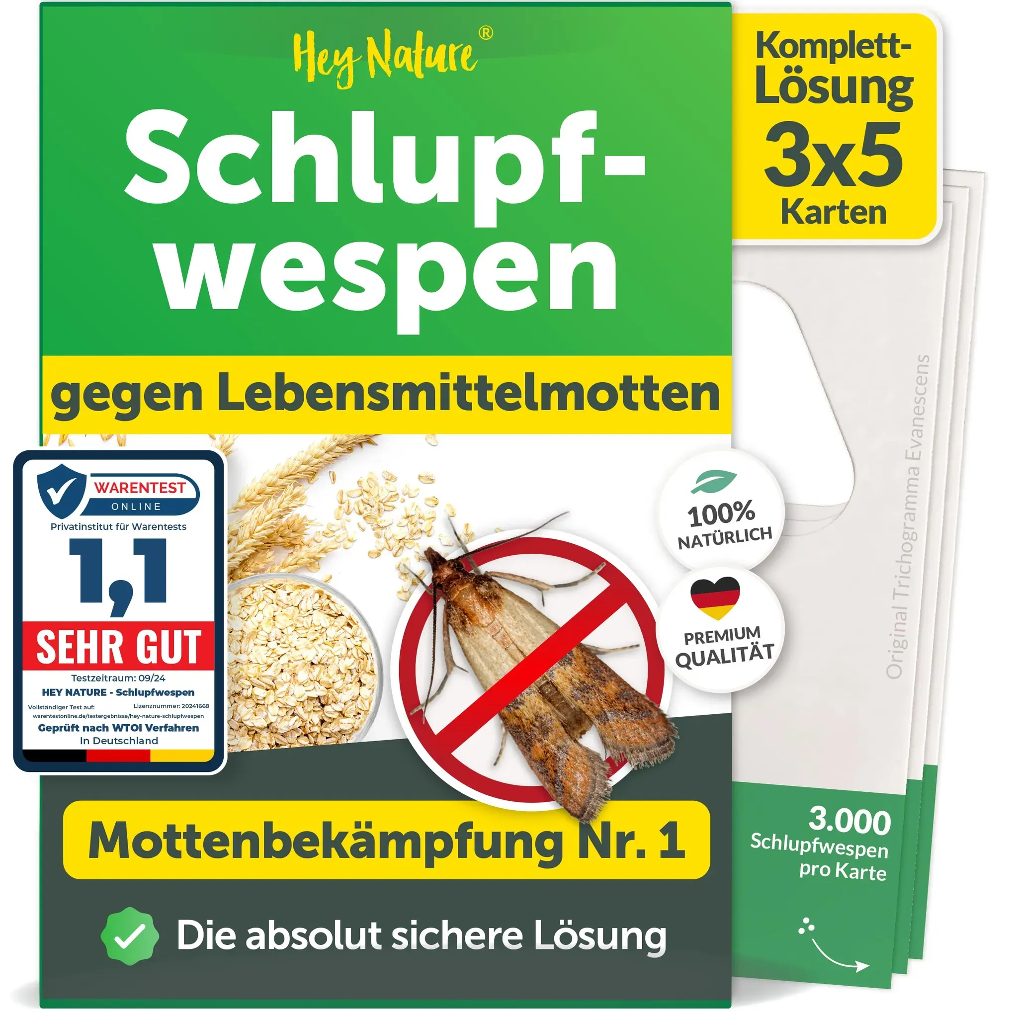 Kategorie: Pflegemittel & Schädlingsbekämpfung - ridix - ENDLICH MOTTENFREI - Lebensmittelmotten bekämpfen war noch nie so leicht! Mit 3000 Schlupfwesen pro Karte werden die Motteneier ganz natürlich & zuverlässig durch ihre Fressfeinde beseitigt. NACHHALTIGE LöSUNG - Der Einsatz von Schlupfwespen gegen Motten ist besonders bequem & unbedenklich: In 9 Wochen fressen die Wespen alle Motteneier ohne menschliches Zutun oder den Einsatz von Chemie. 100% SICHER & OHNE SPUREN - Die Anti Motten Helfer sind absolut unschädlich für Mensch & Tier, sind mit dem bloßen Auge nicht zu erkennen & zerfallen nach 3 Wochen Lebenszeit einfach zu Staub! üBERALL EINSETZBAR - Eine Karte reicht aus, um auf 1m2 Fläche rückstandslos Motten bekämpfen zu können. So sind alle Risikobereiche, wie z.B. Vorratsschränke, problemlos abgedeckt. MOTTENFREI-VERSPRECHEN - Unsere höchstaktiven Schlupfwespen aus deutscher Zucht befreien jeden Haushalt von Motten - falls nicht, ist die 4. Lieferung gratis! Jetzt Schlupfwespen kaufen! - 38,99 Euro bei Amazon Marketplace Lawn & Garden - gefunden von billiger.de Dieses Angebot ist ideal für größere Haushalte oder hartnäckige Befälle, da es eine hohe Anzahl an Karten über mehrere Lieferungen bietet. ![]() ![]() Hey Nature Schlupfwespen gegen Lebensmittelmotten, 15 Karten (5 Karten 3 Lieferungen). Effektiv Lebensmittelmotten bekämpfen mit Schlupfwespen gegen Motten. Alternativ zu Mottenkugeln & Mottenspray