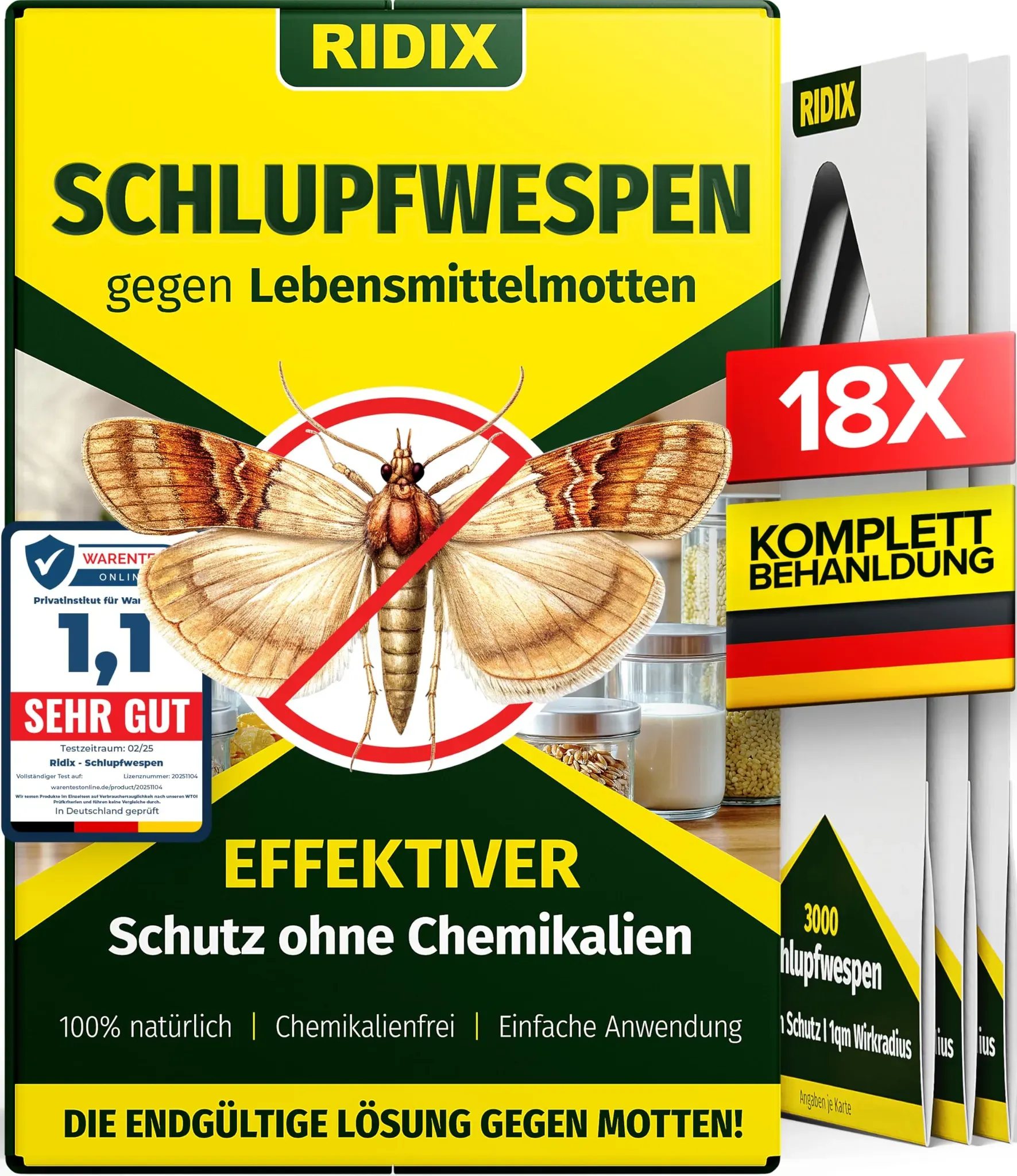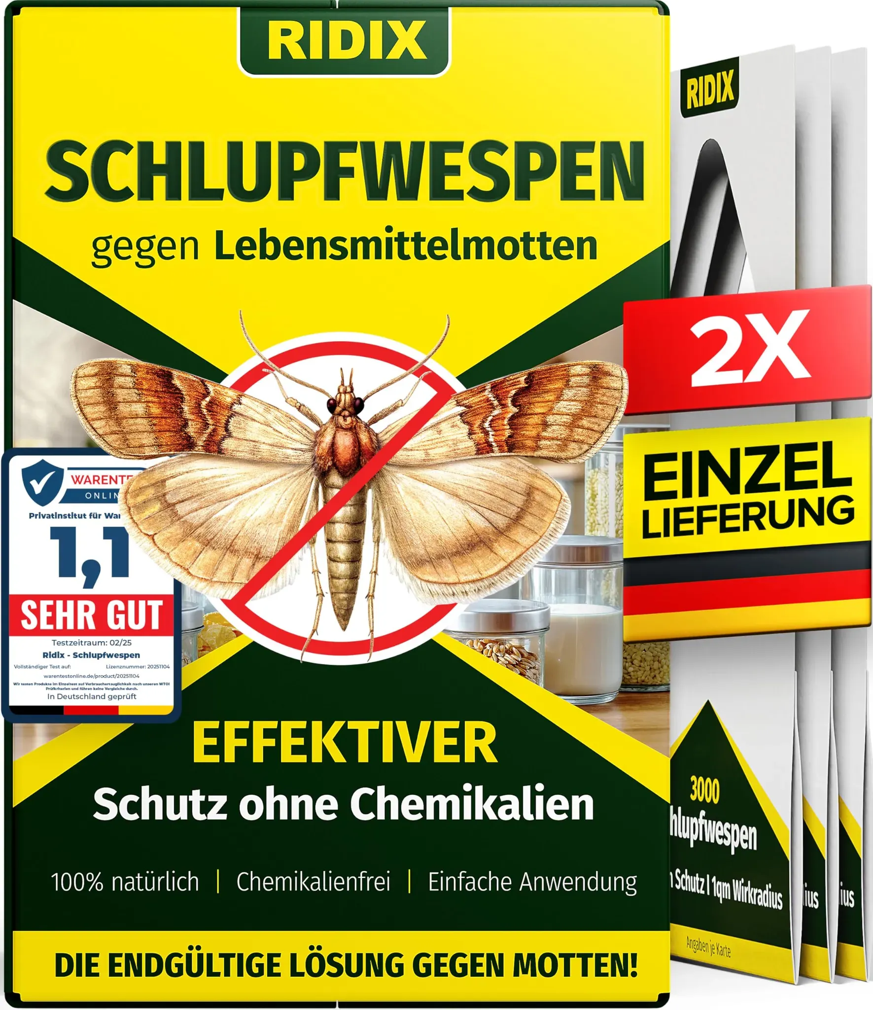Kategorie: Pflegemittel & Schädlingsbekämpfung - DOLCI SOGNI - GTIN:8059037028961 - Effektiv gegen Motten: Schlupfwespen gegen Lebensmittelmotten bekämpfen Vorratsschädlinge direkt an der Quelle ganz ohne Chemie. Deutlich wirksamer als jede Lebensmittelmotten-Falle oder jedes Spray. Natürliche Ergänzung: Schlupfwespen sind eine ideale, nachhaltige Alternative zu herkömmlichen Lebensmittelmotten Falle. Perfekt zur begleitenden Mottenabwehr in Küche, Speisekammer oder im Vorratsraum Sicher für Kinder & Tiere: Schlupfwespen gegen Lebensmittelmotten sind ungiftig und ideal für Haushalte mit Tieren. Die parasitischen Wespen bekämpfen Motten nachhaltig ohne Chemie, Rückstände oder klassische Lebensmittelmotten-Fallen. Einfache Anwendung: Karten mit Schlupfwespen nahe an den Lebensmittelmotten auslegen den Rest erledigen die Nützlinge selbst. Eine unkomplizierte Lösung statt klassischer Lebensmittelmotten-Fallen oder chemischer Mittel. Aus deutscher Zucht: Unsere Schlupfwespen zur Mottenabwehr werden in Deutschland gezüchtet. Sie bekämpfen Lebensmittelmotten, Küchenmotten und Mehlmotten zuverlässig für nachhaltige Ergebnisse alle zwei Wochen eine neue Karte verwenden. - 12,99 Euro bei Amazon Marketplace Lawn & Garden - gefunden von billiger.de Dieses Angebot bietet eine solide Menge an Schlupfwespen für eine effektive Erstbehandlung zu einem fairen Preis. ![]() ![]() Ridix Schlupfwespen gegen Lebensmittelmotten [1 Lieferung mit 3 Karten] - Schlupfwespen gegen Motten als biologische Lösung frei von Chemie - Schlupfwespen Lebensmittelmotten