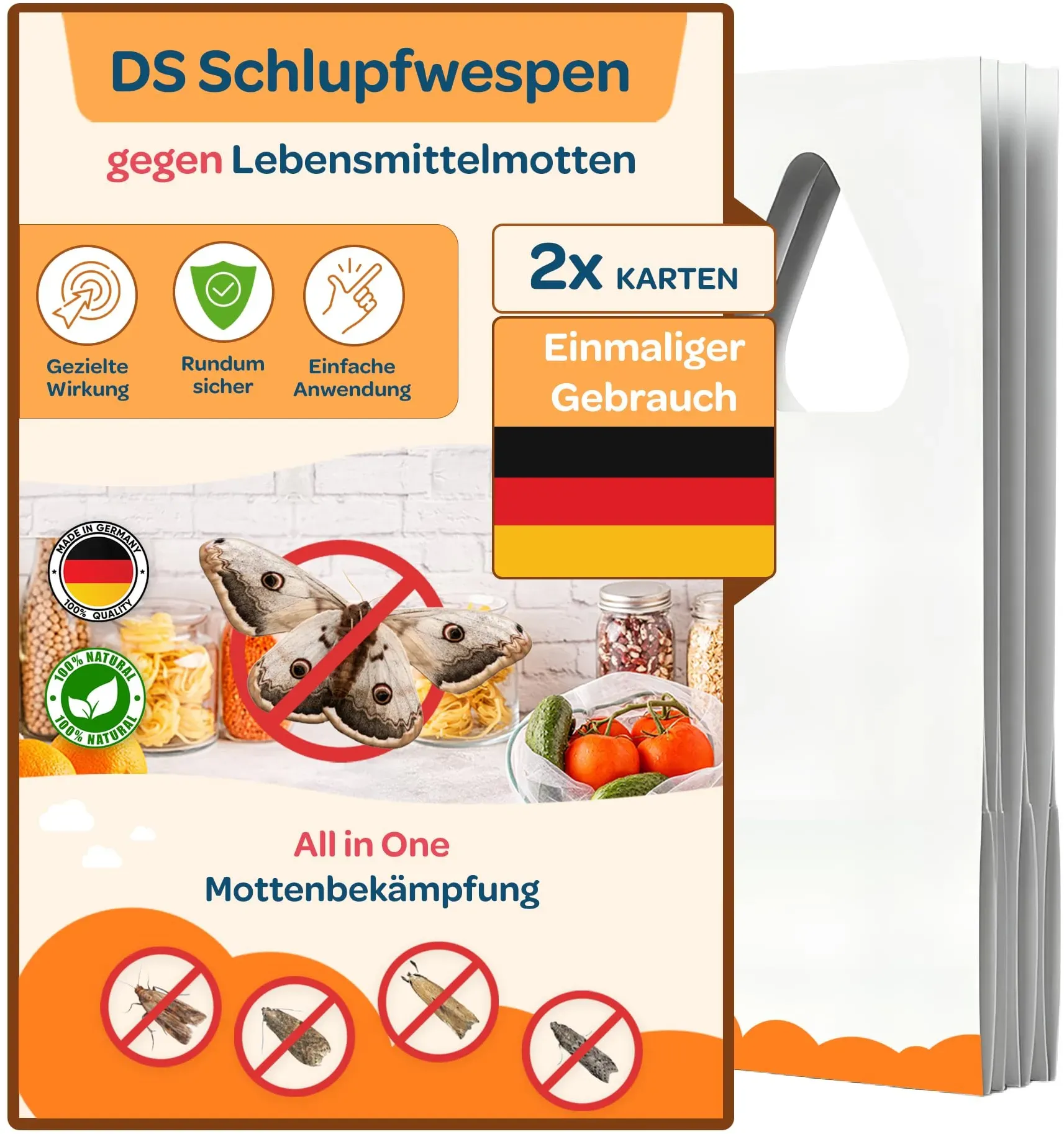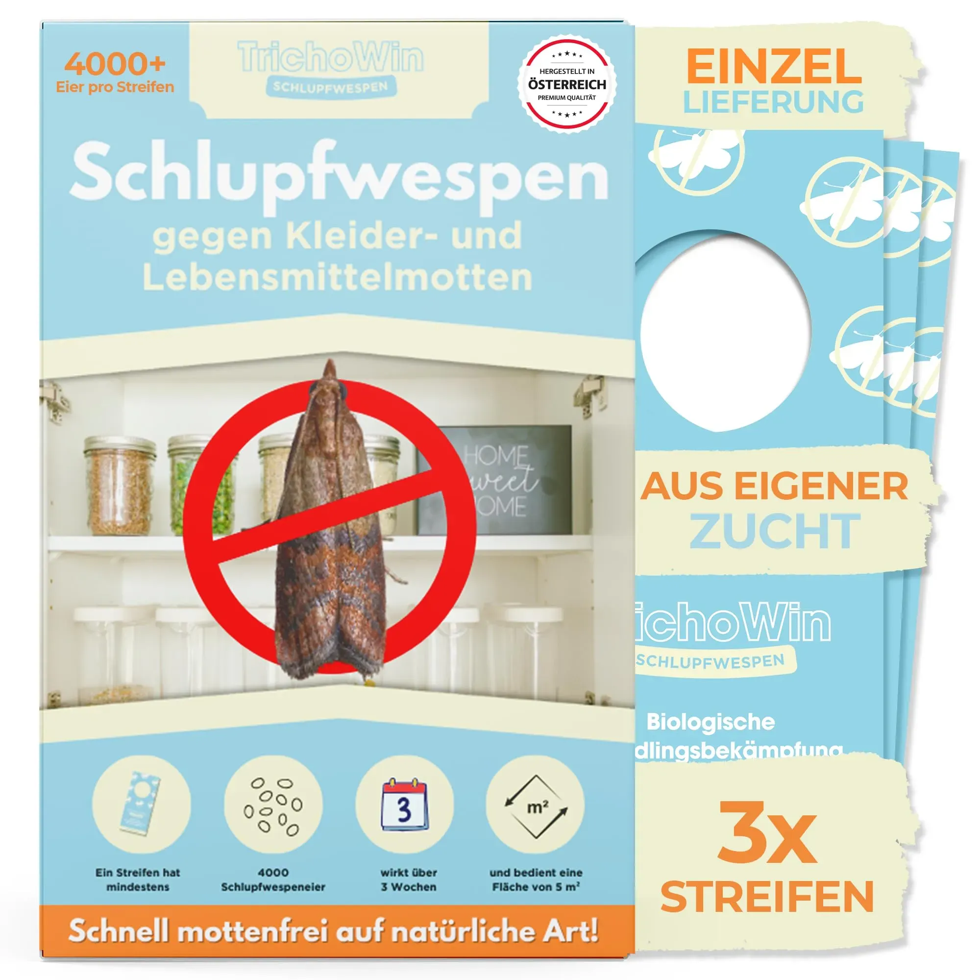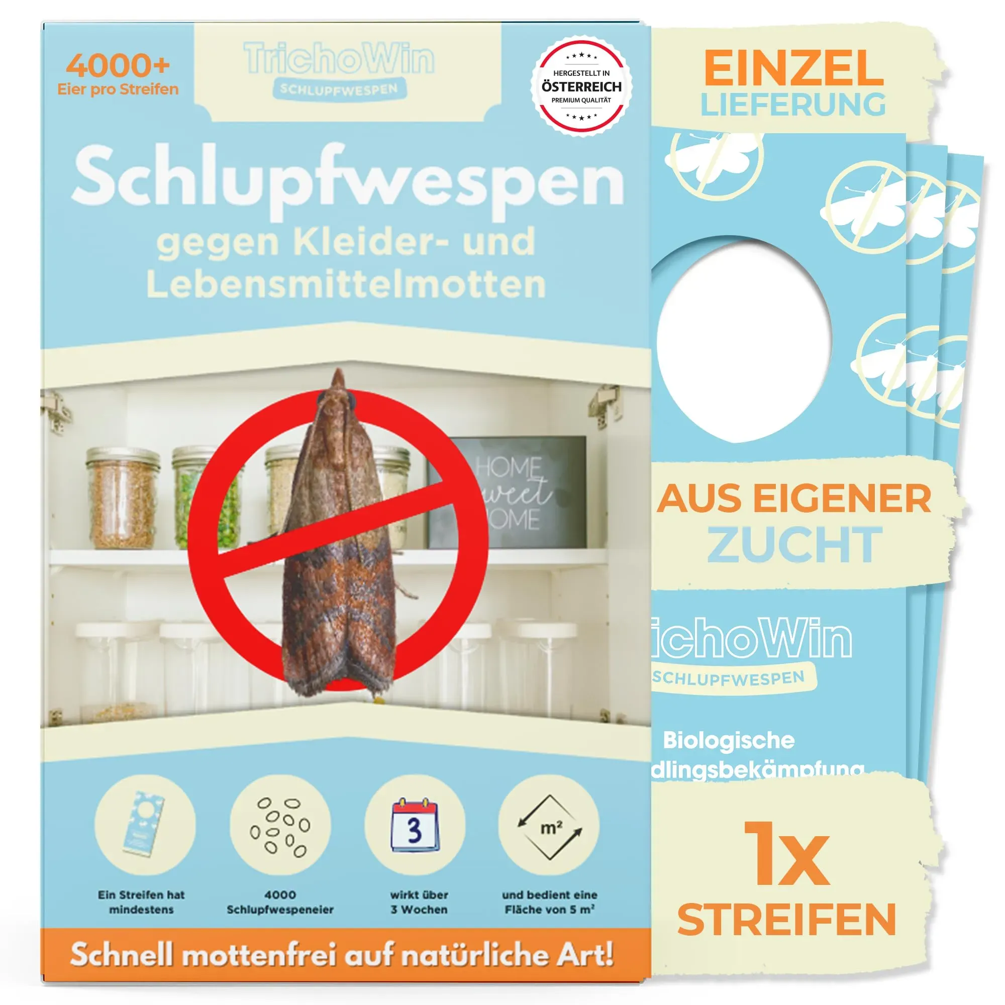 Kategorie: Pflegemittel & Schädlingsbekämpfung - trichowin - Effektive und nachhaltige Mottenbekämpfung - TrichoWin Schlupfwespen eliminieren Lebensmittelmotten (Plodia interpunctella) und Kleidermotten (Tineola bisselliella) an der Quelle, indem sie ihre Eier in die Mottennester legen. Dies sorgt für einen mottenfreien Haushalt und schützt Ihre Lebensmittel und Kleidung dauerhaft vor Neubefall. Einfache und sofortige Anwendung - Jeder TrichoWin-Streifen ist sofort einsatzbereit. Platzieren Sie die Streifen einfach in Regalen, Schränken oder Schubladen. Jede Karte enthält etwa 4000 Schlupfwespeneier, die über einen Zeitraum von 2-3 Wochen schlüpfen und den Mottenbefall gezielt bekämpfen. Sicher für Menschen und Haustiere - Unsere biologischen TrichoWin Schlupfwespen sind winzig (0,4 mm) und absolut unbedenklich für Kinder und Haustiere. Sie zerfallen nach Gebrauch zu Hausstaub, was sie zur idealen, umweltfreundlichen Lösung für die Mottenbekämpfung macht. Frische Lieferung aus österreich - TrichoWin Schlupfwespen werden in österreich gezüchtet und direkt nach der Bestellung frisch versandt. Dies rt die höchste Qualität und Wirksamkeit der Schlupfwespen, sodass Sie sich stets auf ein optimales Ergebnis verlassen können. Zufriedenheits und exzellenter Kundenservice - Wir stehen hinter der Qualität unserer TrichoWin Schlupfwespen. Unser freundlicher Kundenservice steht Ihnen bei Fragen und Problemen rund um die Mottenbekämpfung jederzeit zur Verfügung. Bitte die Sendung ... Dieses Angebot ist ideal für den Einstieg, um eine kleine Lebensmittelmottenplage chemiefrei und effektiv zu bekämpfen. ![]() ![]() DOLCI SOGNI Schlupfwespen Gegen Lebensmittelmotten 1 Karte - Chemiefrei, Effektiv, Natürliche Alternative zur Mottenfalle für Lebensmittel & Küche - Lebensmittelmotten-Falle & Mottenabwehr