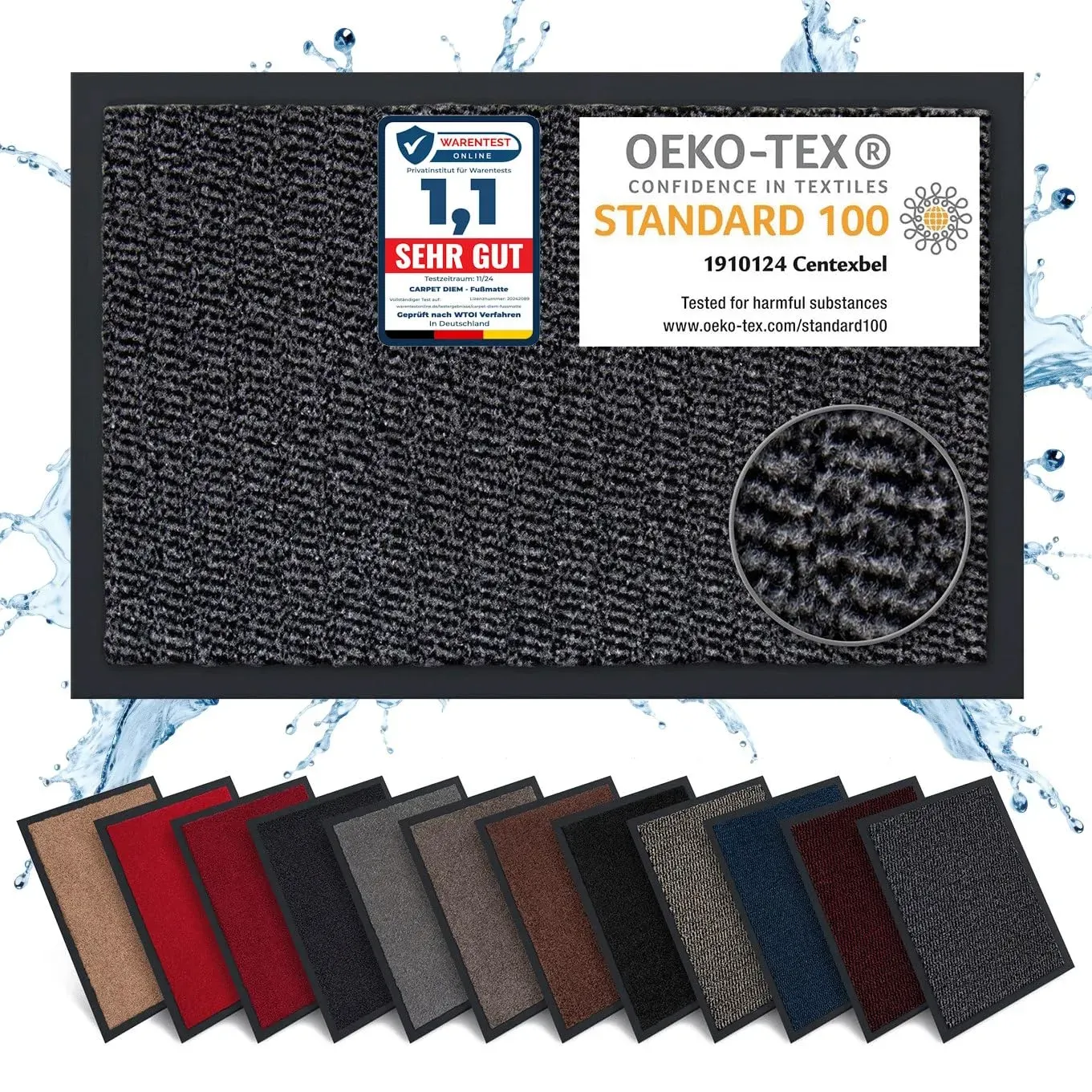 Zustand: Neu - Fußmatten - etm - - EAN: 4251336231422 - œ ROBUSTER & SAUGSTARKER FLOR - Schluss mit Schmutz und Nässe im Haus! Unsere Schmutzfangmatten gelten längst als Klassiker unter den Türmatten und bewähren sich seit Jahren in unzähligen gewerblichen und privaten Eingangsbereichen! œ HERVORRAGENDE REINGUNGSLEISTUNG - Besonders an verregneten und verschneiten Tagen sammeln sich Nässe und Schmutzpartikel an unseren Schuhsohlen. Diese Rückstände werden abgetragen und vom robusten Flor der Eingansmatte festgehalten! œ UNEMPFINDLICHER SAUBERLAUFTEPPICH - Daneben erweist sich der Flor des Sauberlaufteppichs als ausgesprochen vorteilhaft. Denn selbst nach starker Beanspruchung ist der Schmutzmatte optisch kaum anzusehen, wie viel Schmutz sie in sich trägt! œ RUTSCHFESTER VINYL-RÜCKEN - Die Rückseite der Schmutzfangmatte ist mit rutschhemmendem Vinyl beschichtet und gewährleistet in Verbindung mit dem hohen Eigengewicht von ca. 3,2 kg/m² faltenfreies sowie rutschfestes Liegen auf dem Boden! œ LEICHTE REINIGUNG - Die Sauberlaufmatte ist im Alltag ausgesprochen pflegeleicht. Es genügt regelmäßiges Absaugen. Darüber hinaus ist die Schmutzfangmatte aber auch waschbar bis 30°C und kann zur Grundreinigung in die Waschmaschine gegeben werden! - Verkäufer: Meisterei im amazon.de Marketplace ![]() ![]() Carpet Diem Fußmatte, einfach sauber I Schmutzfangmatte Eingangsbereich - Fussmatte Innen & Außen, rutschfeste Türmatte, Schmutzfang Teppich für Haustür I Fußabtreter in Anthrazit-Schwarz 90x150 cm