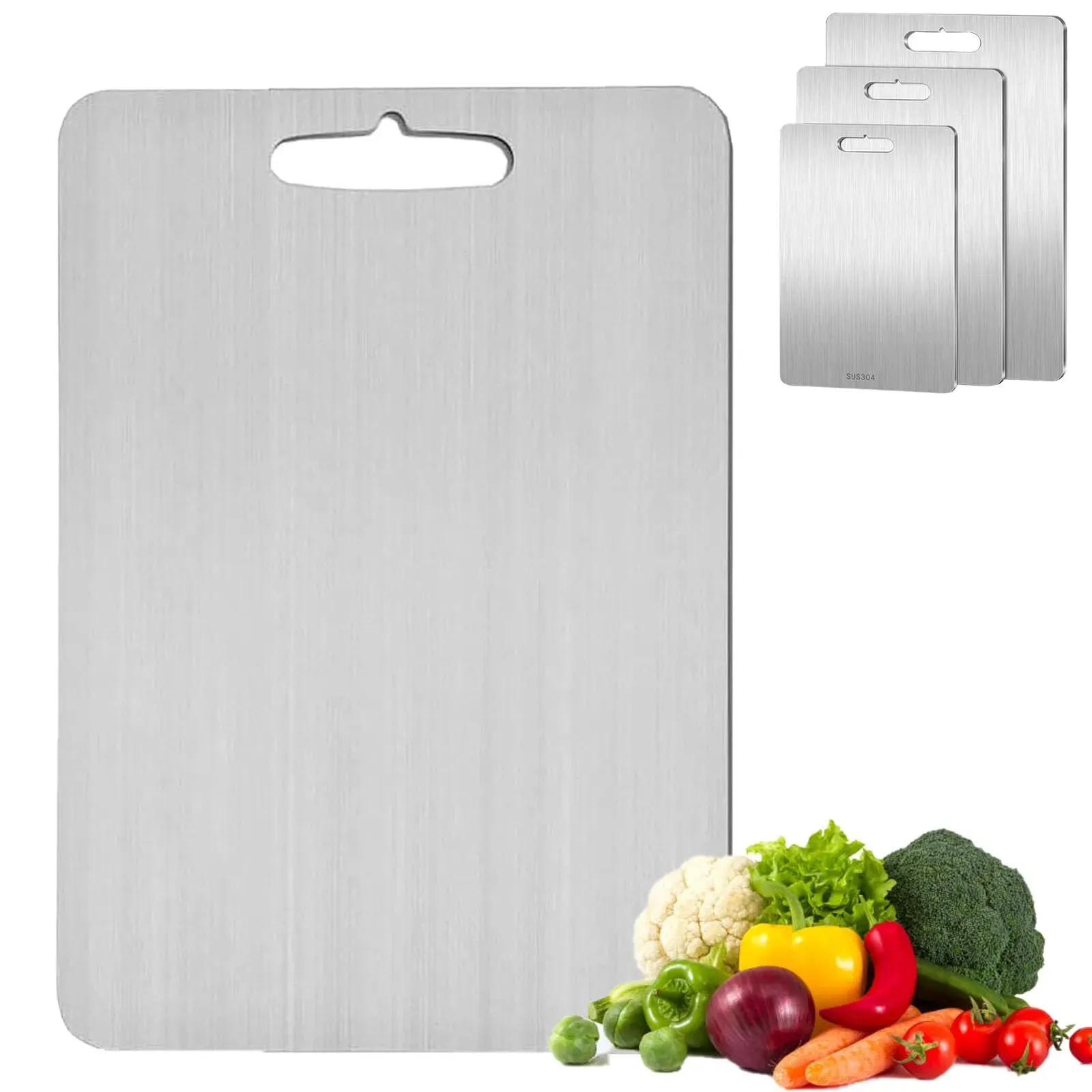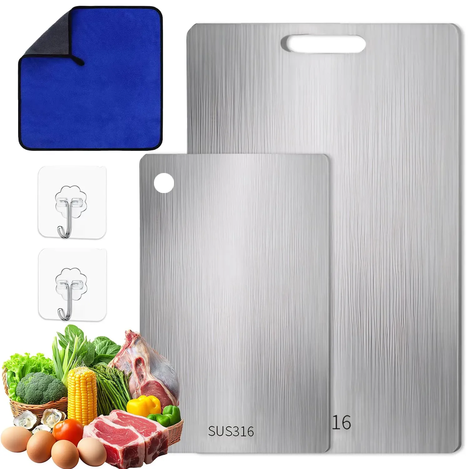Kategorie: Schneidebretter - uzipz - GTIN:4181584211221 - Gesundheit und Sicherheit --- Das aus reinem Titan gefertigte Schneidebrett gewährleistet den höchsten Standard an Gesundheit und Sicherheit. Im Gegensatz zu Holz- oder Bambusbrettern nimmt es keine Flüssigkeiten auf und enthält keine Verunreinigungen, sodass es die sicherste Wahl für Ihre Küche ist Kein Mikroplastik und Holzstaub --- Herkömmliche Kunststoff- und Holzschneidebretter können schädliche Krümel hinterlassen. Die Oberfläche von Titan-Schneidebrettern gibt keine Chemikalien oder Späne ab, wodurch die Reinheit Ihrer Lebensmittel erhalten bleibt und Ihre Gesundheit geschützt wird Bewahrt die Schärfe von Messern --- Im Gegensatz zu Schneidebrettern aus Stein, Glas oder Stahl ist die Titanoberfläche des Cutting Board dreimal weicher als der Stahl von Küchenmessern. Das bedeutet, dass Ihre Messer länger scharf bleiben, was den Bedarf an häufigem Schärfen reduziert und ein reibungsloses Schneiden ermöglicht Strapazierfähig und langlebig --- Die Titan-Schneidebretter sind unglaublich haltbar und widerstehen Schnitten, Rillen und Einstichen. Diese Langlebigkeit sorgt dafür, dass Ihr Brett glatt und hygienisch bleibt und mit der Zeit eine gleichbleibend sichere Oberfläche bietet Nicht porös und geruchsneutral --- Die Reinigung der Titan-Schneidebretter ist ein Kinderspiel. Die porenfreie Oberfläche verhindert das Anhaften von Lebensmitteln und Flüssigkeiten und ist nach dem Abspülen sofort wieder trocken. ... Dieses 2er-Set aus Edelstahl bietet eine gute Größe und wird mit praktischem Zubehör wie Haken und Lappen geliefert. ![]() ![]() bitoyo Schneidebrett 316 Edelstahl Set, 2 Stücke Neues Schneidebrett Edelstahl mit 2 Haken und 1 Lappen, Leicht zu Reinigen, Schneidebrett für Fleisch, Obst, Gemüse, Cutting Board (34 * 23cm+25 * 15cm)