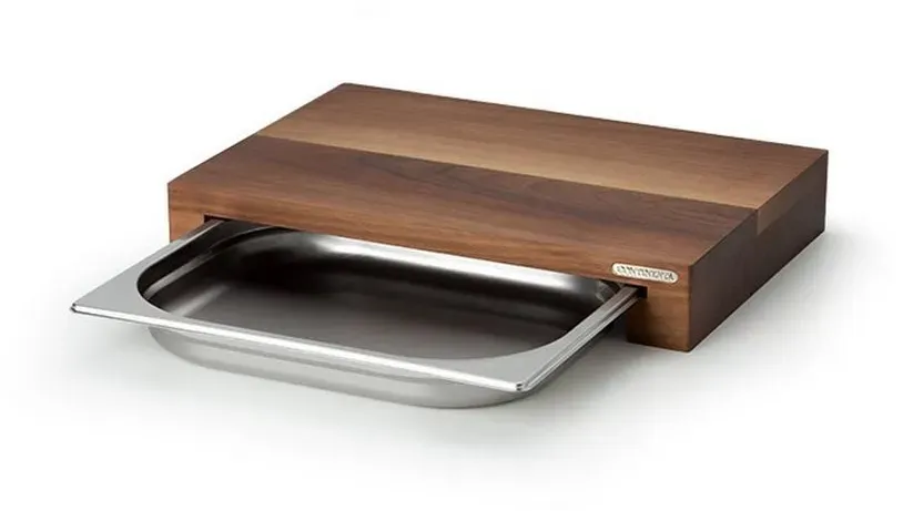 Küchenzubehör Schneidebretter Gesamtsortiment Haushalt Küche Mixen + Schneiden Schneidutensilien Schneidebrett Küchenwerkzeuge & Zubehör - EAN:4006528064629 - Die Zassenhaus Küchenarbeitsplatte ist aus rostfreiem Edelstahl gefertigt. Mit ihrer Oberfläche von 60 x 50 cm bietet sie genügend Raum für kulinarische Kreativität. Eine Anschlagkante ermöglicht sicheres Arbeiten ohne Verrutschen, während die Rand-Skalierung in Zentimetern präzises Zuschneiden ermöglicht. Die Pflegeleichtigkeit wird durch die einfache Reinigung per Hand oder in der Spülmaschine unterstrichen. - gefunden von Kelkoo Ein elegantes Schneidebrett aus Walnussholz mit einer integrierten Edelstahl-Schublade, das Funktionalität und Design vereint. ![]() ![]()
