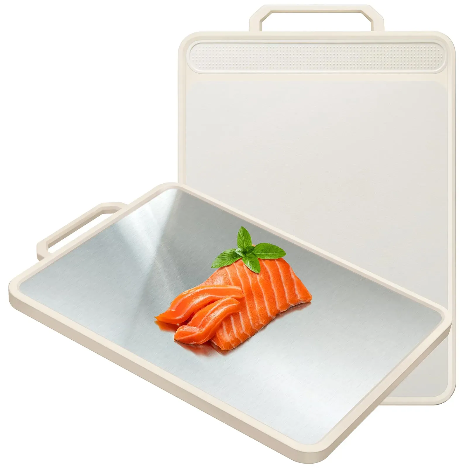 Kategorie: Schneidebretter - gourmetop - Multifunktionales Schneidebrett für alle Küchenaufgaben: Das Schneidebrett von Gourmetop kombiniert 100 % lebensmittelechte Materialien und bietet separate Schneideflächen, um verschiedene Arten von Lebensmitteln sicher zu handhaben und unbeabsichtigtes Mischen von Lebensmitteln während der Küchenvorbereitung zu minimieren. Sein multifunktionales Design erhöht sowohl die Sicherheit als auch die Effizienz, was es zu einem unverzichtbaren Werkzeug für die tägliche Zubereitung von Mahlzeiten macht. Außerdem ist es spülmaschinenfest und sorgt für mühelose Wartung und lange Haltbarkeit Präzisionsschneiden mit Edelstahlschneidebrett Dieses Schneidebrett verfügt über eine glatte, langlebige Edelstahloberfläche, die sich perfekt zum Schneiden von Gemüse, Obst, Käse, Brot und zum Ausrollen von Teig eignet. Die Edelstahloberfläche ist eine ausgezeichnete Wahl zum Schneiden von Sashimi oder zur Zubereitung von verzehrfertigen Lebensmitteln, bietet einen sauberen und zuverlässigen Schneidebereich für eine sichere Zubereitung von Lebensmitteln. Das Schneidebrett aus Stahl von Gourmetop ist hervorragend gegen Flecken und Lebensmittelgerüche resistent und sorgt für langanhaltende Sauberkeit und Effizienz in der Küche Kunststoff-Schneidebrett-Seite: Hergestellt aus hochwertigem, fortschrittlichem Polypropylen in Lebensmittelqualität, die Kunststoffoberfläche des Gourmetop Schneidebretts ist verbessert und verdickt für überlegene ... Ein kompaktes Titan-Schneidebrett, das sich gut für kleinere Küchen oder als Ergänzung eignet. ![]() ![]() uzipz Titan Schneidebrett, Titanium Cutting Board, Schneidebrett Aus Titan, Schneidebretter Titan, Edelstahl Schneidebrett, Hygienisches Titan-Schneidebrett, Metall Schneidebrett (S: 12x9in,1PC)