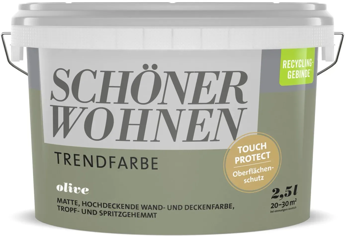 Die Trendfarbe Olive von Schöner Wohnen ist eine matte, wasserbasierte Dispersionsfarbe, die sich besonders gut für Innenräume eignet. Sie ist geruchsarm, schnell trocknend, tropf- und spritzgehemmt und hat eine hohe Deckkraft. Die Farbe ist hypoallergen und frei von Konservierungsmitteln, was sie auch für Allergiker geeignet macht. Zudem verfügt sie über die Touch-Protect-Ausstattung, die die Wandflächen robust gegen Abrieb, Polierglanz und Schreibeffekte macht[1][2][7][9]. Olive ist ein erdiger Grünton, der eine ruhige, ausgeglichene Atmosphäre schafft und sich gut mit warmen Naturtönen wie Beige oder Holzakzenten kombinieren lässt. Diese Farbe ist aktuell ein Trendton für 2024/2025 und wird von Schöner Wohnen als moderner Farbton für stilvolle Wohnakzente beworben[3][5][11]. Die Schöner Wohnen Trendfarbe Olive ist das zentrale Produkt in diesem Bereich. Sie wird in verschiedenen Gebindegrößen angeboten, z.B. 2,5 Liter Eimer (ca. 22,59-30 Euro) und 1 Liter (ca. 15,99 Euro). Kleinere Mengen wie 50 ml sind ebenfalls erhältlich, eignen sich aber eher für Ausbesserungen oder kleine Flächen[1][2][7][9]. Der Preis für 2,5 Liter liegt etwa zwischen 22,59 € und 30 €, für 1 Liter um 16 € und für 50 ml bei ca. 2,50 €. Für eine normale Raumrenovierung ist der 2,5-Liter-Eimer am wirtschaftlichsten[1][2][7]. Zusammenfassung für Ihre Kaufentscheidung: