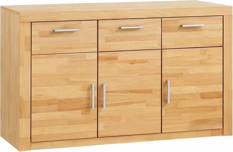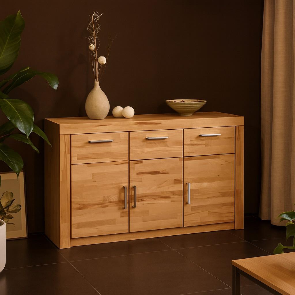 EAN: 0619843465688 - Anrichte Sideboard Schubladenkommode Kernbuche teilmassiv #3837 Die Fronten aus massiver, geölter Kernbuche bringen die natürliche Struktur und Wärme des Holzes besonders schön zur Geltung, während der melaminbeschichtete Korpus für eine pflegeleichte und robuste Oberfläche sorgt.Hinter den drei Türen befinden sich jeweils ein höhenverstellbarer Fachboden, ideal zur strukturierten Aufbewahrung von Geschirr, Textilien oder Haushaltsutensilien. Die Türen sind mit Ganzmetallscharnieren ausgestattet und bieten eine dauerhaft stabile Funktion.über den Türen befinden sich drei leichtgängige Schubkästen, die auf Metallschienen geführt werden. Sie bieten zusätzlichen Stauraum für Besteck, Alltagsgegenstände oder kleinere Accessoires. Die eleganten Metallgriffe unterstreichen das moderne Erscheinungsbild des Sideboards und runden das harmonische Gesamtbild ab.Dank der hochwertigen Materialien, sorgfältigen Verarbeitung und dem stabilen Aufbau eignet sich dieses Möbelstück sowohl für moderne als auch klassische Wohnräume. Die melaminharzbeschichteten Oberflächen sind unempfindlich, pflegeleicht und behalten lange ihre schöne Optik.Die Anrichte wird inklusive verständlicher Montageanleitung zur einfachen Selbstmontage geliefert. Die abgebildete Dekoration dient lediglich der Darstellung und ist nicht im Lieferumfang enthalten.Bringen Sie mit dieser eleganten Kernbuche-Anrichte natürliche Wohnlichkeit, Ordnung und Stil in Ihr Zuhause ein langlebiges Möbelstück, ... ![]() ![]() bv-vertrieb Anrichte Schubladenkommode Metallgriffe u. Scharniere Sideboard Kernbuche #1418