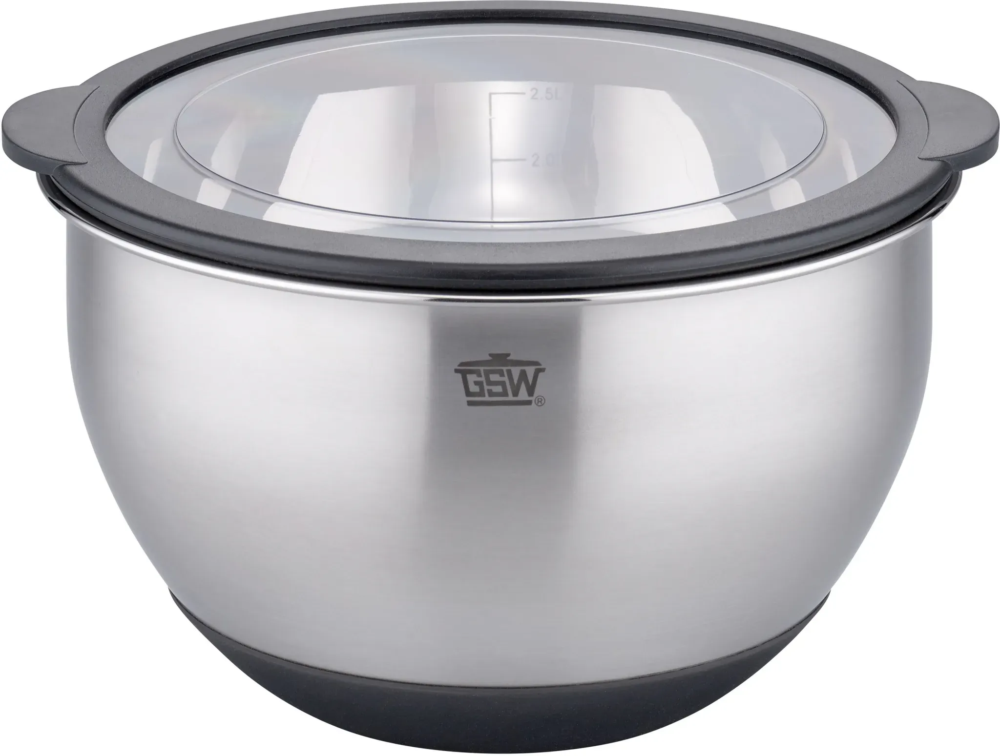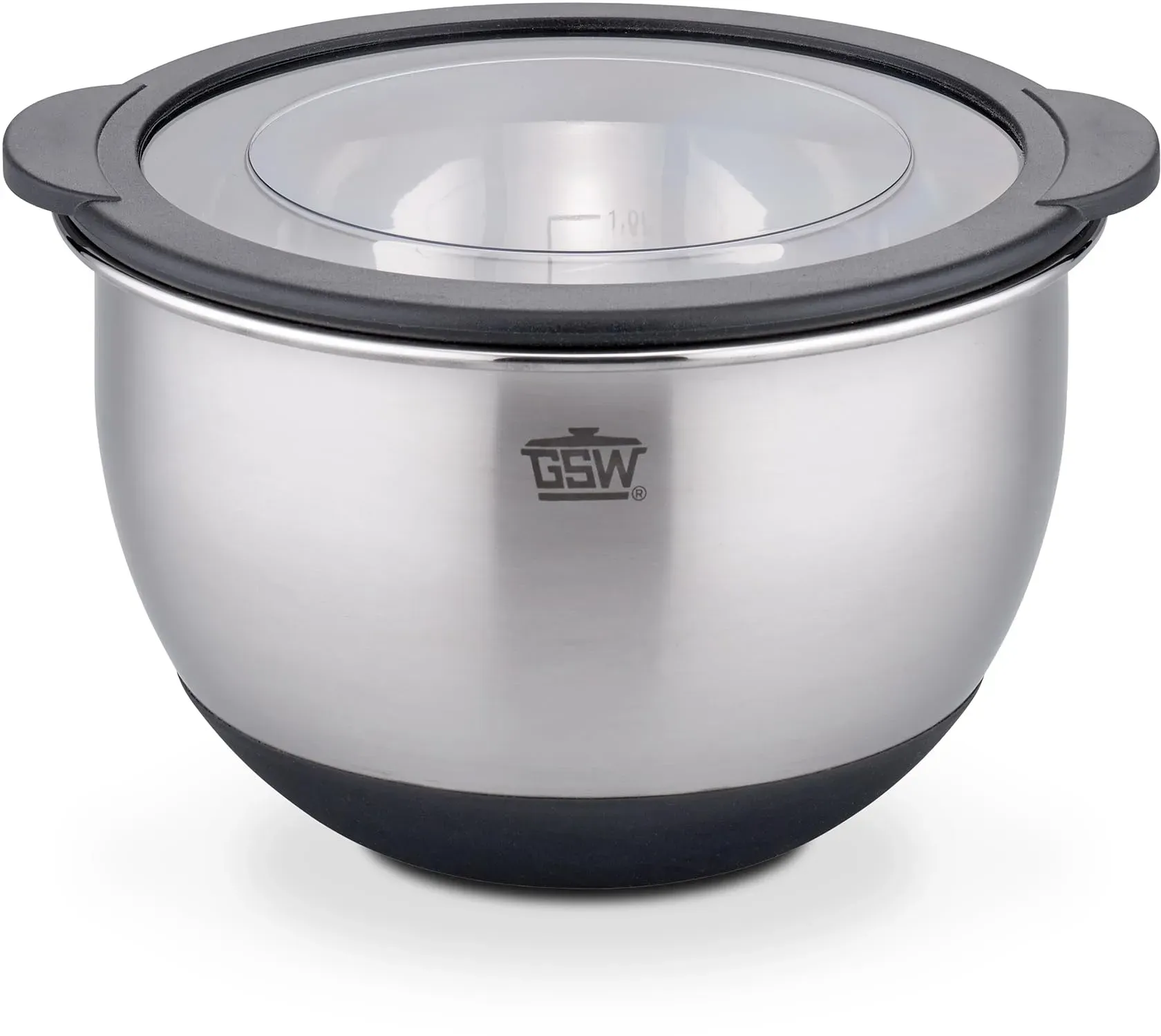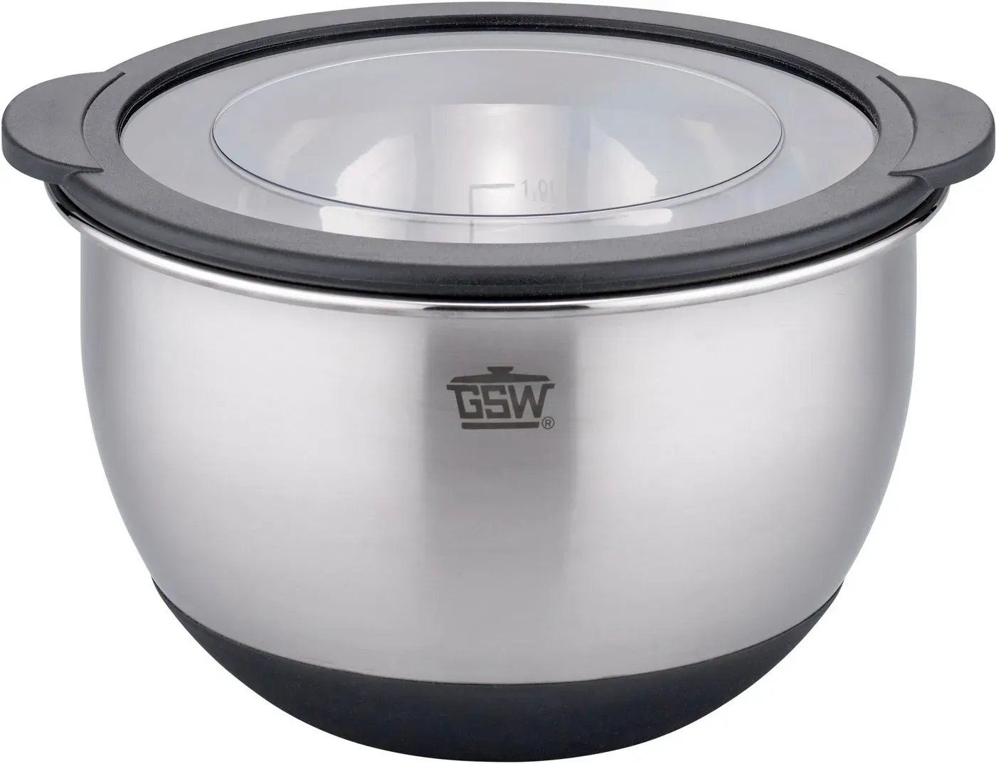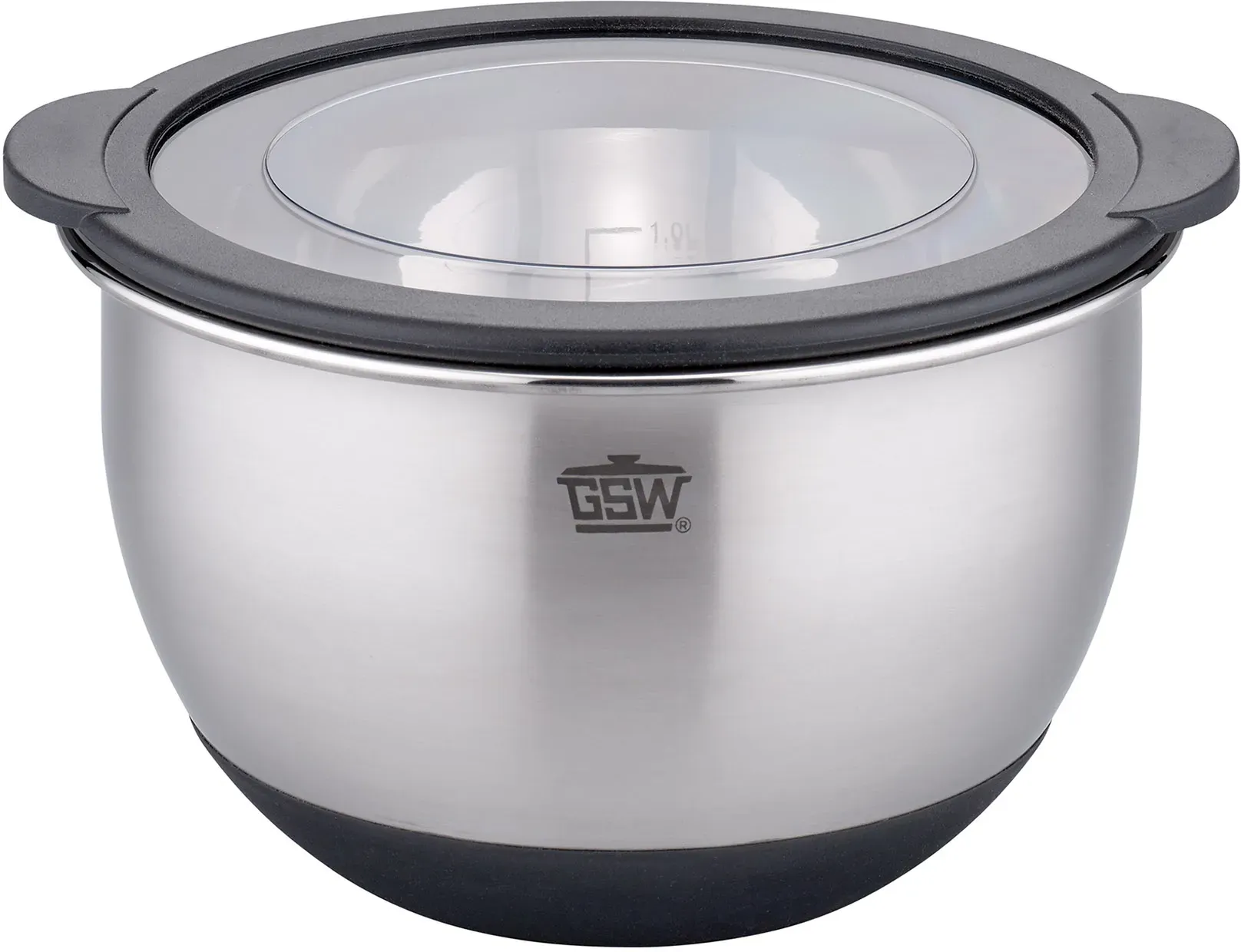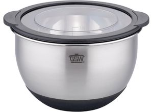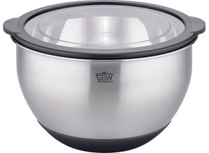 Service Wohnen Gedeckter Tisch Geschirr - - Die aus hochwertigem Edelstahl rostfrei gefertigte Schüssel aus dem Hause GSW verfügt über eine innenliegende Listerskala und einen luftdichten Aufbewahrungsdeckel mit Sichtfenster. Zudem dient der Antirutsch-Silikonboden beim Zubereiten und Servieren für einen sicheren Stand. Die Schüssel eignet sich daher hervorragend zum Zubereiten, Servieren und Aufbewahren und ist durch das zeitlos moderne Design ideal für den gedeckten Tisch, die Party und das Buffet geeignet. Alle 3 Größen sind ineinader stapelbar und können somit platzsparend gelagert werden. Mit dieser Schüssel aus dem Hause GSW wird die Küche um formschöne und praktische Utensilien ergänzt., Material: Material: Edelstahl, Materialeigenschaften: mattiert, rostfrei, Produktdetails: Ausstattung: Deckel, Messskala, Einsatzbereich: Camping, Haushalt, Optik/Stil: Optik: unifarben, Maßangaben: Höhe: 10 cm, Durchmesser: 16 cm, Gewicht: 351 g, Fassungsvermögen in Liter: 1,6 l, Hinweise: Pflegehinweise: spülmaschinengeeignet, Farbe: Farbbezeichnung: edelstahlfarben - Versandkostenfrei: false - Sale: true - Lieferzeit: 1 Woche - Sofort verfügbar: true - Größe: Ø 16 cm - Hersteller-Farbe: edelstahlfarben - Farbe: Grau - - Versand mit Hermes - Zahlungsoptionen: Paypal, Kreditkarte, Rechnung, Lastschrift, Sofortüberweisung, Ratenkauf - bei Baur Versand - gefunden von shopping24 ![]() ![]() GSW Küchenschüssel PRIMO aus Edelstahl mit transparentem Deckel 16 cm