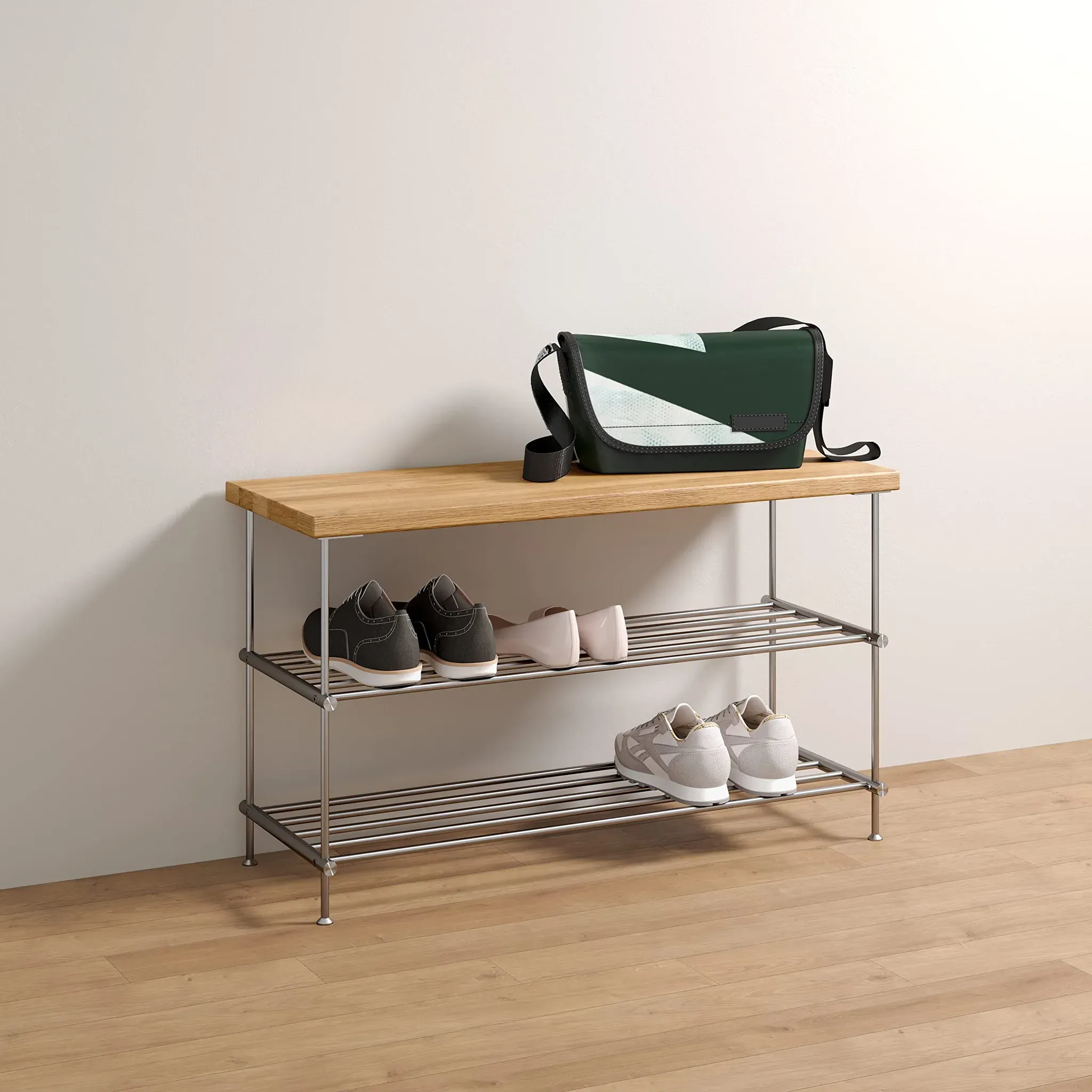 Gewöhnlich versandfertig in 2 bis 3 TagenPHOS Edelstahl Design Schuhbank mit massiver Eichenholz-Sitzfläche 60 cm breit und 2 Edelstahl-Schuhregal-Ebenen - PHOS Design