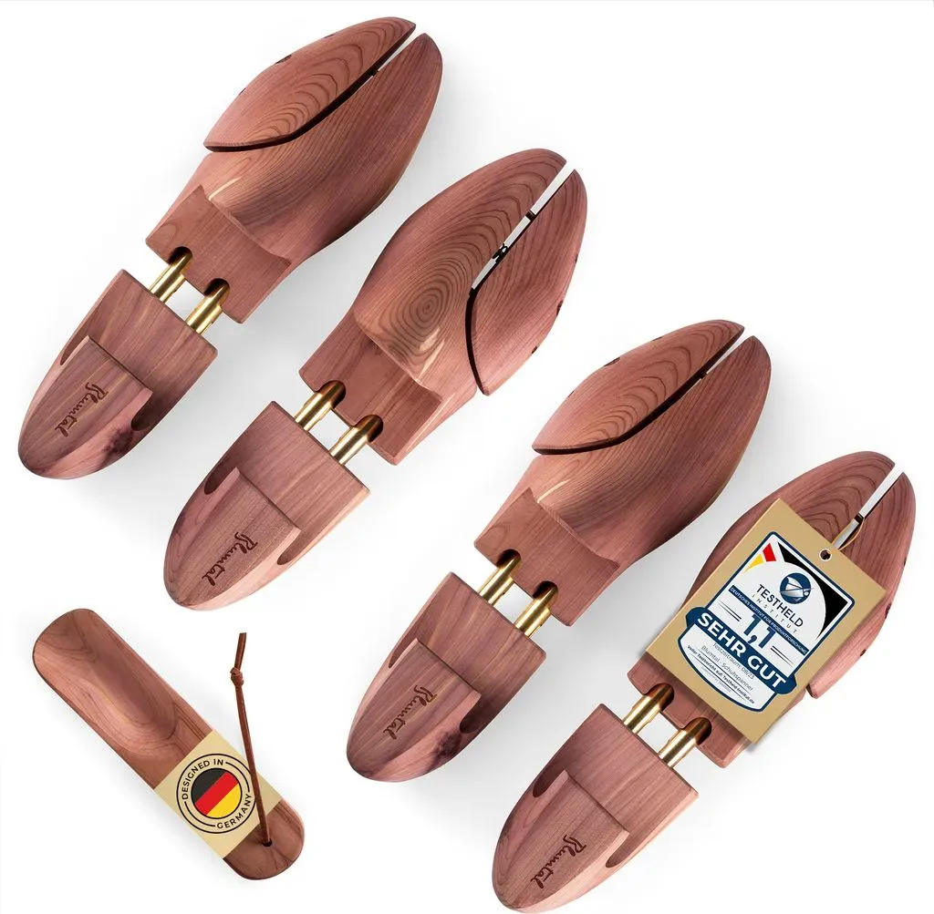 Kategorie: Zubehör für Schuhe - Blumtal - GTIN:4260514531414 - Die hochwertigen Schuhspanner verlängern die Haltbarkeit deiner Schuhe um ein Vielfaches! Zu den Schuhdehnern bekommst Du zusätzlich einen hochwertigen Schuhlöffel. Das verwendete Zedern-Holz ist offenporig und entzieht dem Schuh Feuchtigkeit - so wird die Haltbarkeit des Schuhs verlängert. Gleichzeitig verströmt der Schuhspanner einen angenehmen Duft. Dank der Längenfederung kann der Schuhweiter besonders viel Druck nach vorne und hinten ausüben und deinen Schuh in seiner optimalen, natürlichen Passform halten. Mit seinem ergonomischen Spanngriff wird das Einführen und Wiederausführen ohne viel Kraftaufwand zum Kinderspiel. Sie eignen sich optimal als Weihnachtsgeschenk für Mann und Frau oder Freund, Geburtstags-Geschenk oder einfach als kleines Dankeschön. - 44,99 Euro bei Kaufland.de - gefunden von billiger.de Ein hochwertiger, verstellbarer Schuhspanner aus Zedernholz von Shoeboys, der für seine Langlebigkeit und effektive Formerhaltung bekannt ist. ![]() ![]() Shoeboy's CEDAR TOP - verstellbarer Schuhspanner aus Zedernholz - Größe 42