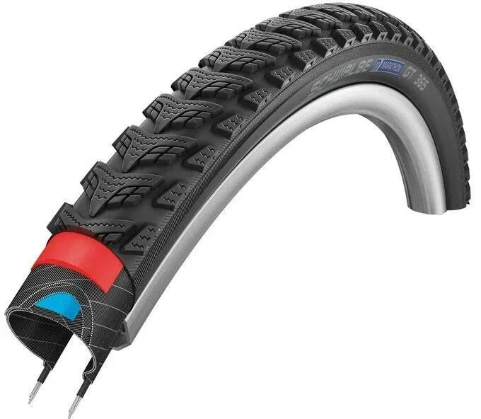Kategorie: Fahrradreifen & -schläuche - Schwalbe - GTIN:4026495836647 - SCHWALBE Marathon 365 HS 475. 1 Reifen, szeiten, 365 Tage kein Reifenwechsel nötig. Der Marathon 365 ist der erste Reifen, der dich das ganze Jahr über in nahezu allen Wettersituationen sicher fahren lässt. Das neue Lamellen-Profil und das speziell entwickelte Four-Season -Compound sorgen für satten Grip, egal in welcher Jahreszeit du mit dem Rad unterwegs bist. Natürlich ausgestattet mit DualGuard Pannenschutztechnik für höchste Sicherheit. Der 365 ist die perfekte Lösung für nahezu alle Bedingungen. Auf Eis bieten dir aber nur echte Spike-Reifen verlässlichen Halt. - 31,05 Euro bei Fahrrad-Teile - gefunden von billiger.de Ein robuster Marathon GT 365 Drahtreifen in 26x2.15 Zoll, der eine gute Wahl für Mountainbikes und Trekkingräder ist. ![]() ![]() Schwalbe Marathon GT 365 26 x 2,15 Zoll Drahtreifen