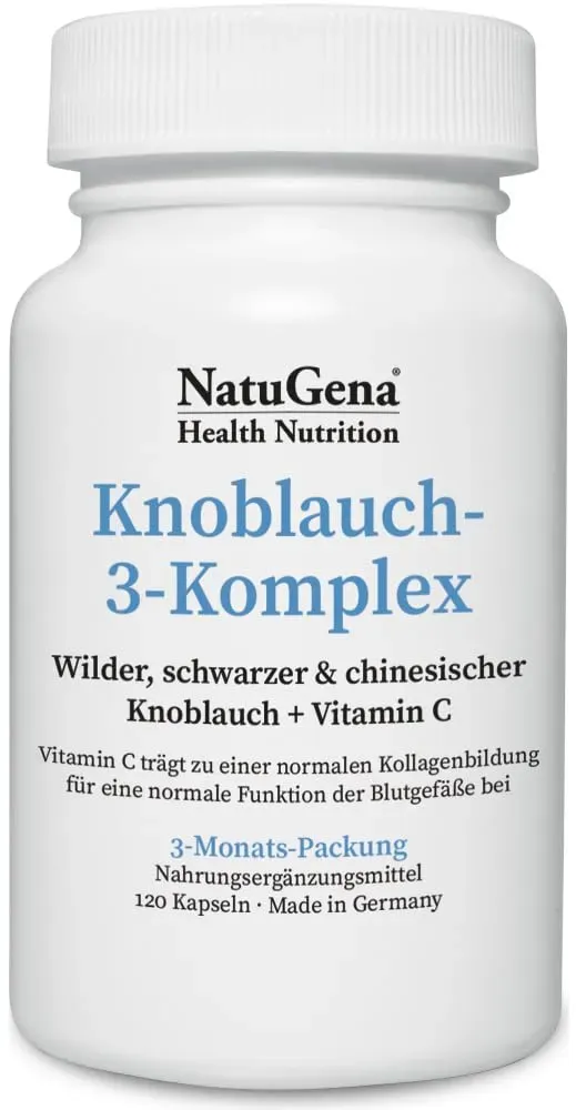 Verfügbarkeit: Auf Lager - Kategorie: Nahrungsergänzungsmittel - Dr. Peter Hartig - GTIN:4262466250276 - Die unterstützenden Eigenschaften von Knoblauch auf das Herz-Kreislaufsystem sind schon seit Langem in der Heilkunde und der Medizin bekannt. Schwarzer Knoblauch, als optimierte Form von Knoblauch, bewahrt dank eines speziellen Fermentationsverfahrens alle diese positiven Eigenschaften, ohne den unangenehmen Geruch zu behalten und dabei magenfreundlicher zu sein. Unser schwarzer Knoblauch ist eine wertvolle Quelle von Thiamin (Vitamin B1), Folsäure (Vitamin B9) und Vitamin C. Diese B-Vitamine spielen eine entscheidende Rolle im Energiestoffwechsel und der Zellteilung, während Vitamin C als starkes Antioxidans das Immunsystem unterstützt Kein Nachgeschmack, kein Mundgeruch, kein Ausdünsten: Unser schwarzer Knoblauch zeichnet sich durch sein spezielles, aufwendiges Herstellungsverfahren aus, ohne dabei die ursprünglichen wohltuenden Eigenschaften des Knoblauchs einzubüßen Täglich 1-2 Kapseln: Zur optimalen Nutzung der Vorteile empfehlen wir die Einnahme von 1-2 Kapseln unseres schwarzen Knoblauchs täglich. Vegan: Unser Produkt ist rein pflanzlich und entspricht den Standards einer veganen Ernährung. Es ist frei von tierischen Bestandteilen und daher für Veganer geeignet. - 36,99 Euro bei Amazon Marketplace Health & Personal Care - gefunden von billiger.de NatuGena bietet einen umfassenden Knoblauch-3-Komplex mit verschiedenen Knoblaucharten und Vitamin C. ![]() ![]() NatuGena Knoblauch-3-Komplex, Wilder, Schwarzer, Chinesischer Knoblauch + Vitamin C, Flavonoiden und Sulfiden, 120 Kapseln (60 Tage Packung)