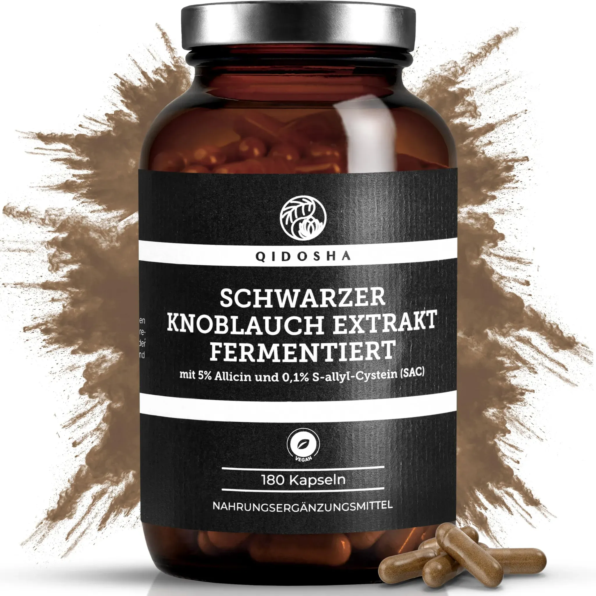 Verfügbarkeit: Auf Lager - Kategorie: Nahrungsergänzungsmittel - Vit4ever - GTIN:4260601190722 - HERVORRAGENDES PREIS-LEISTUNGSVERHäLTNIS: 180 hochdosierte Knoblauchkapseln mit 750 mg Schwarzer Knoblauchextrakt (Allium sativum). Für unsere Knoblauch Kapseln wird ein 15:1 Knoblauch-Extrakt verwendet, welches eine bis zu 15-Fach stärkere Wirkstoffkonzentration zu vergleichbaren Produkten hat. Zusätzlich enthält unser Extrakt natürliches S-Allyl cysteine (SAC), welches ein natürlicher Bestandteil von frischem Knoblauch ist. Praktischer 6 Monatsvorrat ausreichend für 180 Tage. NATüRLICHER PREMIUM ROHSTOFF: Unsere Black Garlic Kapseln werden durch natürliche Fermentation hergestellt. Durch das aufwendige Herstellungsverfahren erhält man geruchsfreie & geschmacksneutrale Knoblauchextrakt Kapseln. Bei der Herstellung wird weißer Knoblauch schonend fermentiert & luftgetrocknet, nur so bleiben die wertvollen Inhaltsstoffe des Knoblauches erhalten. VEGAN & OHNE UNERWüNSCHTE ZUSäTZE: Unsere Kapseln sind zu 100% vegan und frei von Zusätzen wie Magnesiumstearat, Aromen, Farbstoffen, Stabilisatoren, Gelatine & selbstverständlich auch ohne Gentechnik. Außerdem sind unsere Kapseln laktosefrei, glutenfrei & ohne Konservierungsstoffe. LABORGEPRüFTE REINHEIT: Laborgeprüft auf Schwermetalle, Schimmelpilze, E. Coli, Salmonellen & weitere relevante Prüfkriterien. HERSTELLUNG & IHRE ZUFRIEDENHEIT: Das Vit4ever Sortiment umfasst zahlreiche Nahrungsergänzungsmittel zu einem ... QIDOSHA bietet ein laborgeprüftes Produkt aus deutscher Fertigung mit hohem SAC-Gehalt. ![]() ![]() QIDOSHA® Schwarzer Knoblauch Extrakt hochdosiert, 180 Kapseln im Apothekerglas, 600mg je Kapsel, darunter 0,6 mg S-Allyl-Cystein (SAC), deutsche Fertigung, jede Charge laborgeprüft