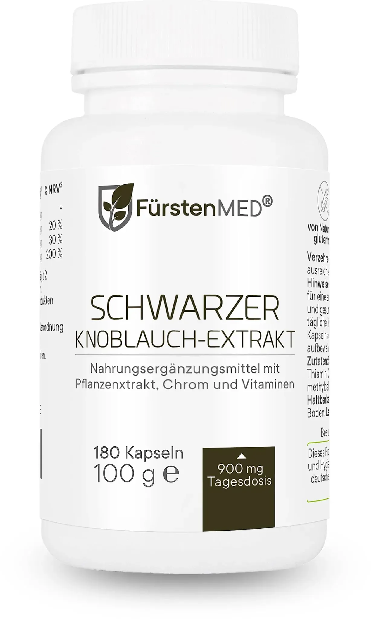 Verfügbarkeit: Auf Lager - Kategorie: Nahrungsergänzungsmittel - QIDOSHA - GTIN:4260705871978 - PREMIUM-QUALITäT - die Basis unseres hochqualitativ fermentierten Schwarzen Knoblauchs stellt ein besonders reiner Wasser-Extrakt dar. Im Rahmen des sorgfältig kontrollierten Fermentationsprozesses über die Dauer von drei Monaten führen drei Fermentationen dazu, dass neue, wertvolle Inhaltsstoffe in Premium-Qualität entstehen, angereichert, stabilisiert oder umgewandelt werden. HOCHDOSIERT - 600 mg Schwarzer Knoblauch Extrakt je Kapsel, darunter 0,6 mg S-Allyl-Cystein (SAC). Frischer Knoblauch enthält lt. Studien nur 0,0114 mg SAC je 600 mg. RTER WIRKSTOFFGEHALT - der Gehalt an Allicin, Alliin und S-allyl-Cystein wird durch das besonders genaue HPLC Messverfahren testiert. Viele Anbieter günstiger Präparate geben nur die Menge an Knoblauchextrakt, nicht aber die Wirkstoffmengen an, da diese oft nicht kontrolliert werden und keine Zielparameter bei der Extraktion darstellen. FERMENTATION - dank der Fermentation weist Schwarzer Knoblauch eine sehr hohe Bioverfügbarkeit und schnelle Absorption im Dünndarm auf - und es gibt keinen unangenehmen Nachgeschmack bzw. unangenehme Gerüche, wie dies bei weißem Knoblauch der Fall ist. 6-MONATSVORRAT - ein Glas Schwarzer Koblauch Extrakt Kapseln reicht für ein halbes Jahr auf Basis der Tagesverzehrempfehlung. GLAS ANSTATT PLASTIK - wir verwenden keine Plastik-Verpackung, sondern füllen unsere Schwarzer Knoblauch Extrakt ... FürstenMED bietet eine hochdosierte, vegane Option mit zusätzlichen Vitaminen und Chrom. ![]() ![]() FürstenMED FürstenMED® 900mg Schwarzer Knoblauch Kapseln als 10:1 Extrakt = 9.000mg Reiner Schwarzer Knoblauch (Geruchlos & Fermentiert) 180 Kapseln - Black Garlic Vegan mit Chrom, Vitamin C & B1