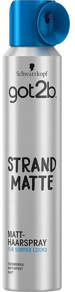 9 Händlerangebote bei billiger.de - Kategorie: Haarspray - got2b - Surfer Look 2.0 €“ Bringe deinen Surfer-Look mit dem got2b Haarspray auf ein neues Level und erhalte einen länger anhaltenden, matten Style €“ auch bei längeren Haaren! Starker Halt €“ Dank starkem Haltegrad 4 bleibt dein matter Strand-Look auch Stunden nach dem Haarstyling windig zerzaust, so wie frisch vom Surfen Ohne Beschweren €“ Trotz starkem Halt ist das Schwarzkopf Haarspray leicht wie eine angenehme Strandbrise: Es hält den Look, ohne das Haar zu beschweren Einfache Anwendung €“ Einfach das Haarspray aufsprühen und loslegen: Ob zerzaust, zerrauft oder gezähmt €“ Hauptsache, es ist matt und es hält Auch für längere Haare €“ Das got2b Haarspray kann sowohl im Anschluss an die Strandmatte Paste, als auch alleine angewendet werden €“ es eignet sich auch für längeres Haar - GTIN:4015100215007 ![]() ![]() got2b Strand Matte Haarspray (200 ml), Haarspray für Männer verleiht matte Surfer Looks, Styling Spray für noch bessere Surfer Styles und längeren Halt, ohne Beschweren