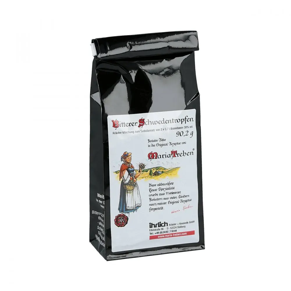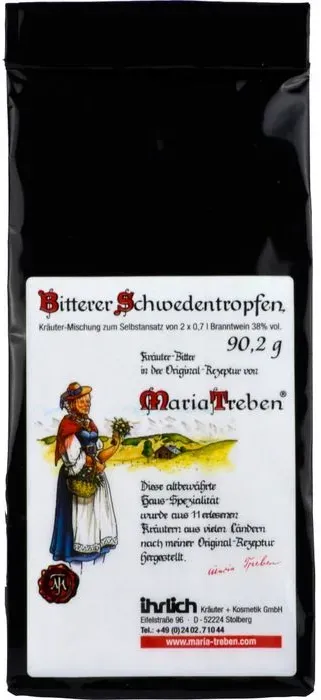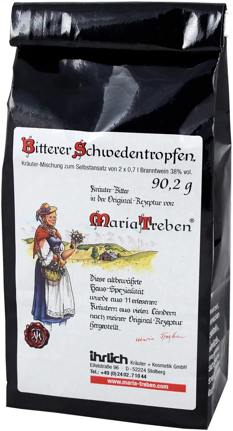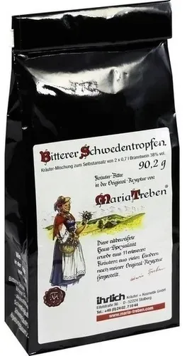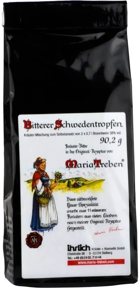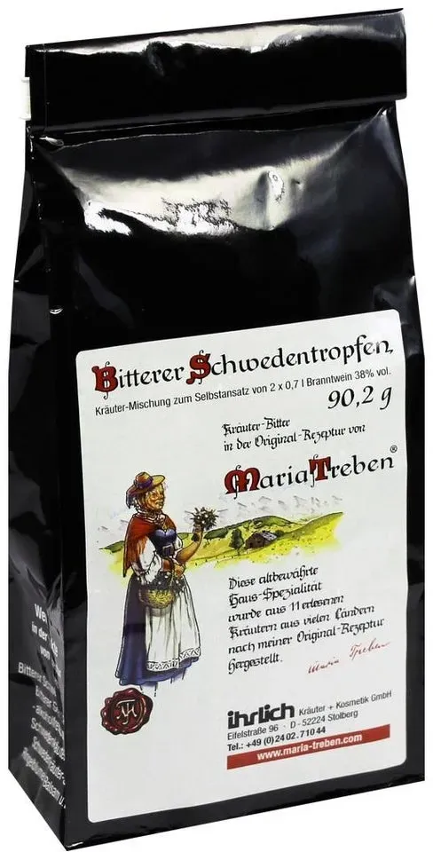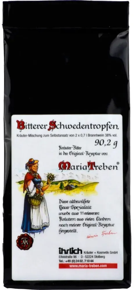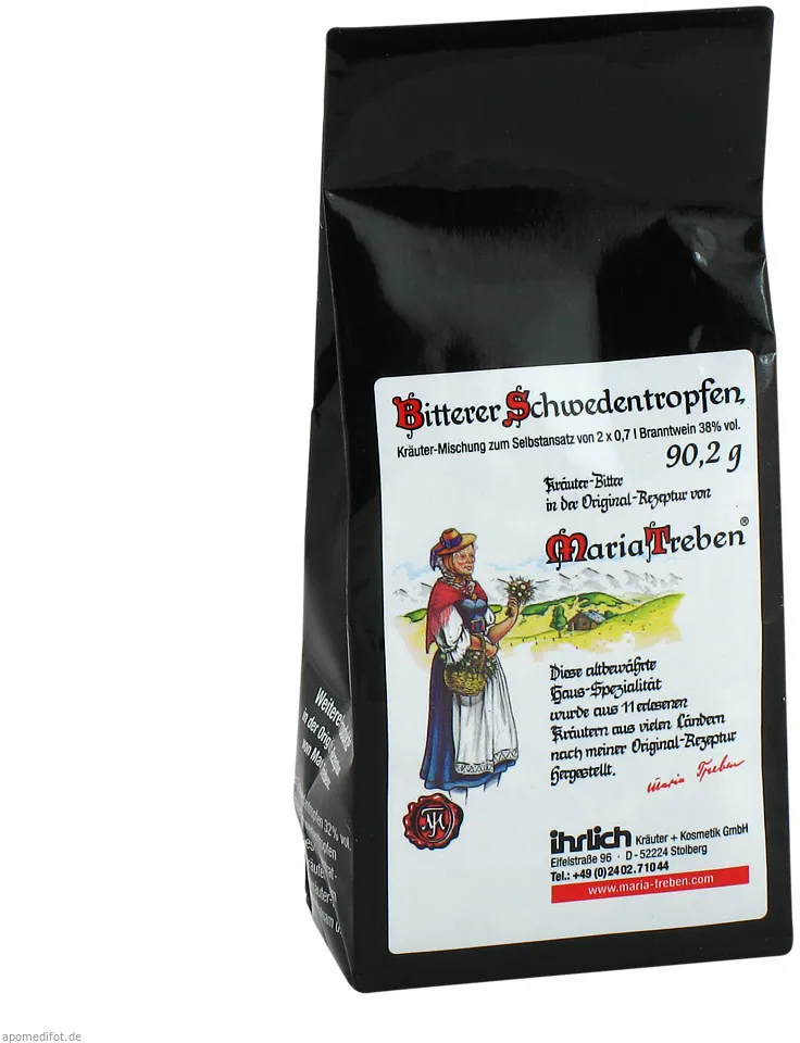 62,86 / kg - Kategorie: Arzneimittel - Ihrlich Kräuter + Kosmetik GmbH - GTIN:4013923105109 - PZN:01554516 - Produkteigenschaften: Kräutermischung zum Selbstansatz von 2 x 0,7 l Branntwein 38 % vol. Diese altbewährte Hausspezialität wurde aus 11 erlesenen Kräutern aus vielen Ländern nach Original-Rezep... - 5,67 Euro bei Mycare - gefunden von billiger.de ![]() ![]() EDEL KRAUT Manufaktur des Lebens Schwedenbitter Maria Treben - SCHWEDENKRäUTER ANSATZMISCHUNG KLEIN 100g | EDEL KRAUT - nach der Schwedenkräuter Maria Treben Original Rezeptur für den Schwedenbitter Maria Treben