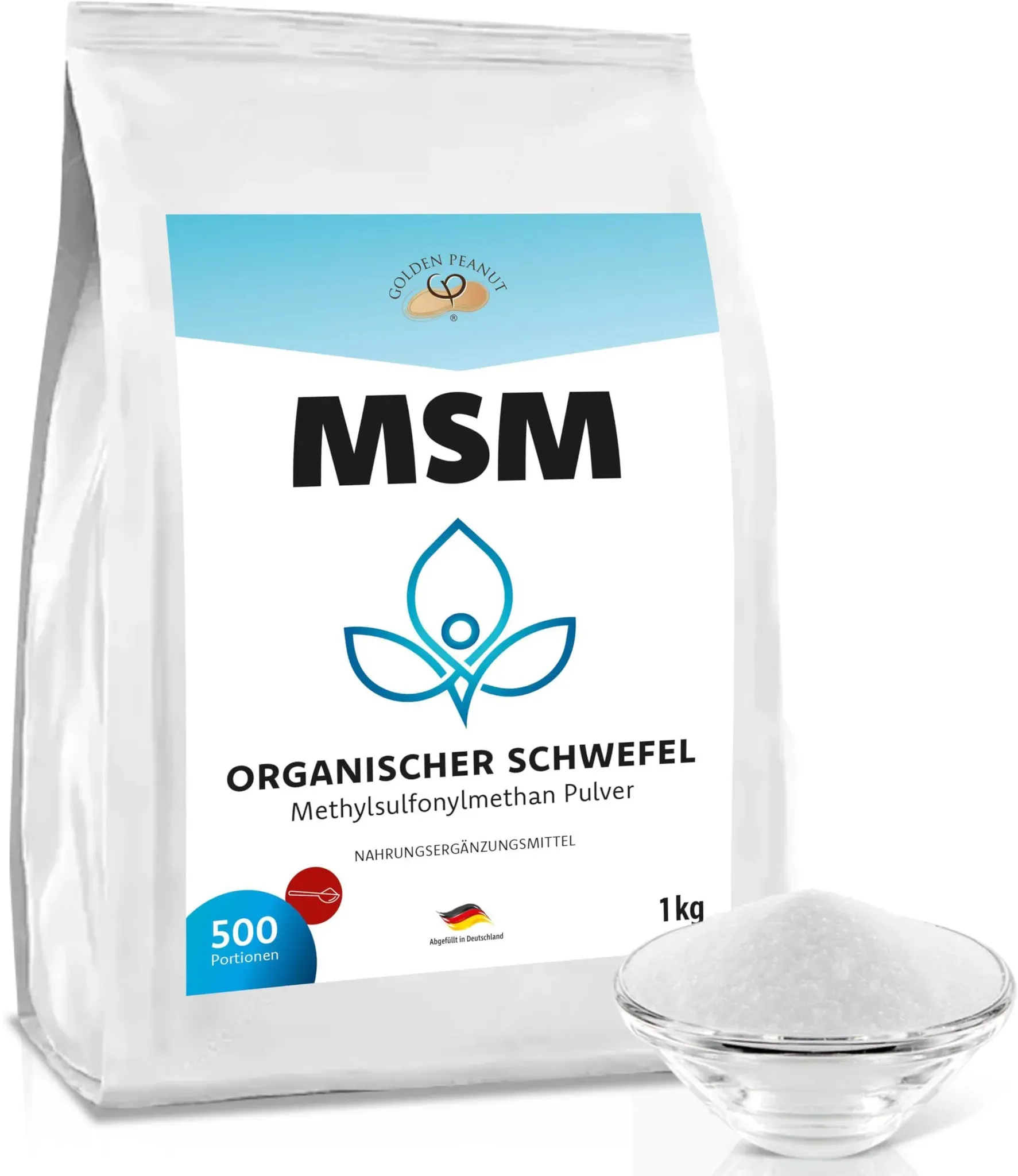 Kategorie: Tiergesundheit - Golden Peanut - GTIN:4250573300540 - METHYLSULFONYLMETHAN: MSM gehört zur Gruppe der organischen Schwefelverbindungen (Sulfone). Es ist in pflanzlichen sowie tierischen Produkten zu finden und wir nehmen es über unsere Nahrung wie beispielsweise in Milch, Zwiebeln, Sauerkraut auf. Organischer Schwefel in Pulverform ist ein sehr beliebtes Nahrungsergänzungsmittel, welches täglich eingenommen werden kann. HöCHSTE REINHEIT: Golden Peanut MSM hat im Gegenteil zu anderen Produkten einen sehr hohen Reinheitsgrad von mindestens 99,92%. Es handelt sich um ein hochreines Produkt ohne Zusätze oder künstlich, zugefügten Rieselhilfen. VERZEHREMPFEHLUNG: Täglich 2 g (entspricht 1 Messlöffel) MSM zu den Mahlzeiten in Wasser, Saft oder Tee aufgelöst trinken. Die angegebene empfohlene Verzehrmenge darf nicht überschritten werden. Nahrungsergänzungsmittel sind kein Ersatz für eine ausgewogene und abwechslungsreiche Ernährung und eine gesunde Lebensweise. QUALITäT MADE IN GERMANY: Die Golden Peanut Produktlinie wird in Deutschland nach strengsten Qualitätskriterien entwickelt und produziert unser Betrieb ist zertifiziert nach IFS, Bio und HACCP, alle Rohstoffe werden in akkreditierten deutschen Laboren untersucht. Die umweltfreundliche Verpackung ist aromasicher und sorgt für eine lange Haltbarkeit. FAMILIENBETRIEB MIT TRADITION: Seit 1920 steht unser Familienunternehmen für Werte, Qualität und Vertrauen. über Generationen hinweg geben wir unser Wissen weiter und ... Ein solides Angebot für MSM-Pulver zu einem fairen Preis, geeignet für die allgemeine Nahrungsergänzung. ![]() kaufland.d e My natura Mynatura MSM Pulver Methylsulfonylmethan - Schwefel Pulver 1Kg 1 Beutel TU-6CEX-KE76