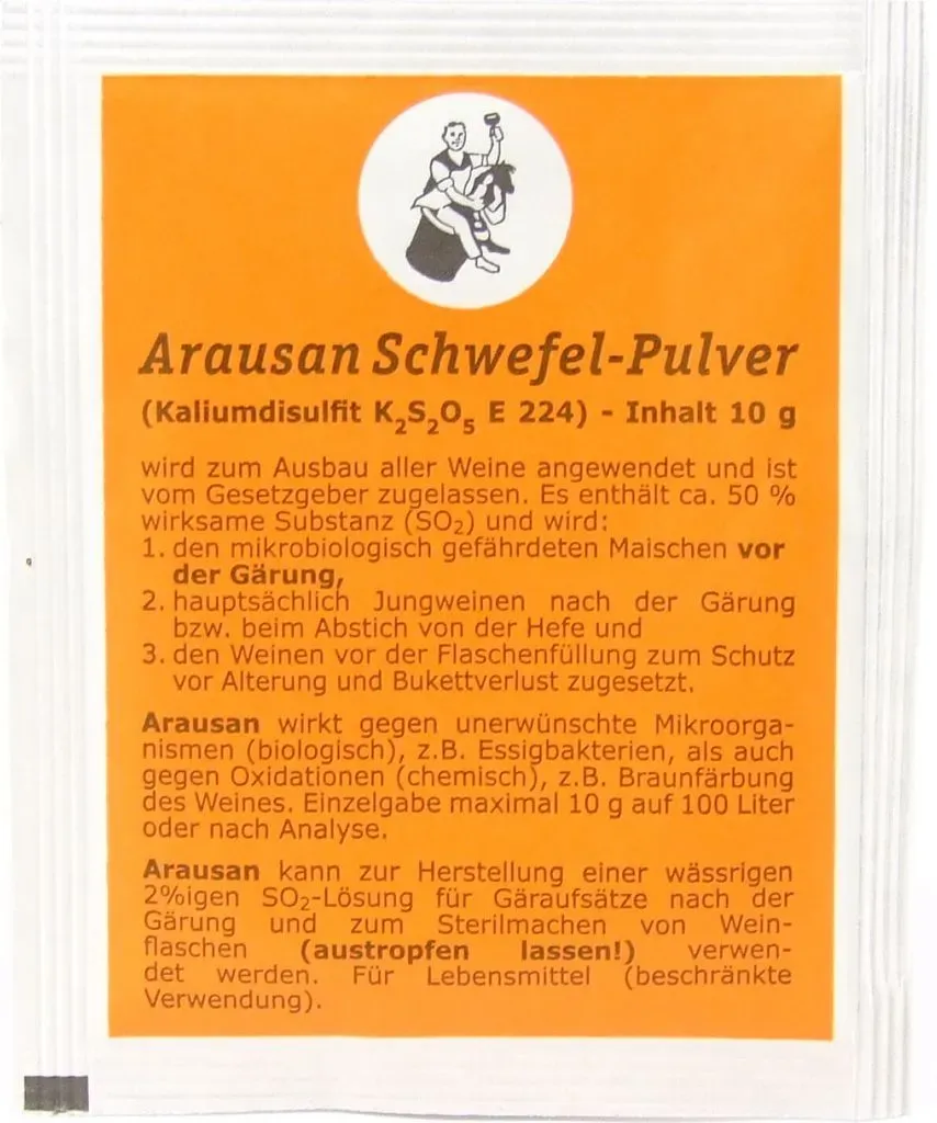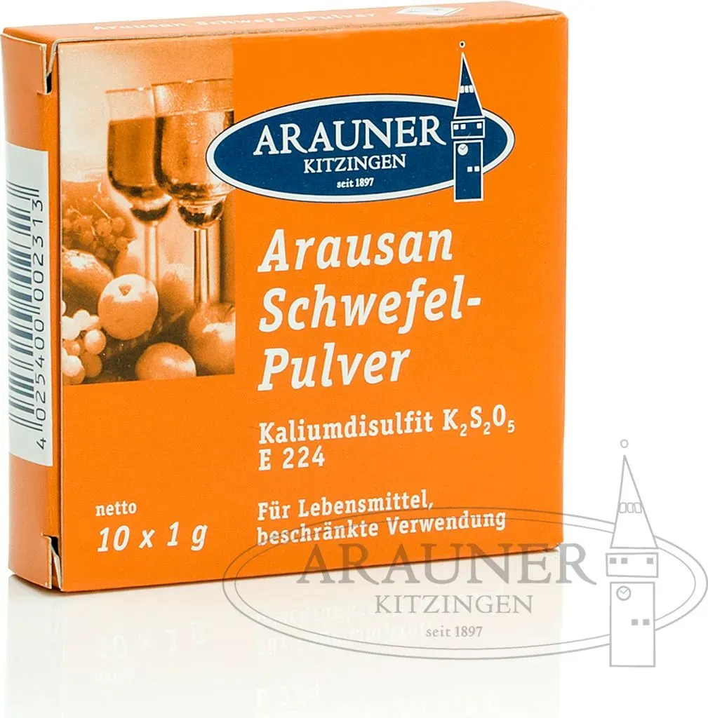 299,00 /l - Kategorie: Backzutaten - Arauner - GTIN:4025400002313 - ARAUSAN-Schwefelpulver (Kaliumdisulfit) 10 Tütchen a 1 g,Zur Gesunderhaltung des Weines, als Sperrflüssigkeit für Gäraufsätze, zur Keimfreimachung von Geräten, Korken, Flaschen.Normale Dosierung: 1g auf 10 L Wein.ZUR FARBERHALTUNG: für geschältes Obst wie z.B. äpfel, Birnen, Aprikosen, Pfirsiche und/oder Gemüse z.B. Meerrettich, Sellerie, Kartoffeln, in eine etwa 0,5-1%ige SO2 Lösung tauchen und anschließend weiterverarbeiten.!!!Tütcheninhalt nicht zum unmittelbaren Verzehr bestimmtt!!!ZUR KEIMFREIMACHUNG: von Geräten, Korken Flaschen und als Sperrflüssigkeit für die Gäraufsätze Hobby 1 und 2:WäSSRIGE Schwefel-Lösung 2%ig: 1 Liter Wasser und 40 g Arausan-Schwefelpulver UND 2-4 g (1 Teel.)Zitronen- oder Milchsäure zugeben, notfalls genügen ein paar Tropfen Zitronensaft. - 2,99 Euro bei Kaufland.de - gefunden von billiger.de Dieses Schwefelpulver ist ein preiswertes Desinfektionsmittel für Wein in Premium-Qualität. ![]() ![]() Hugbert Grünberger SCHWEFELPULVER Kaliumpyrosulfit Desinfektionsmittel Wein PREMIUM